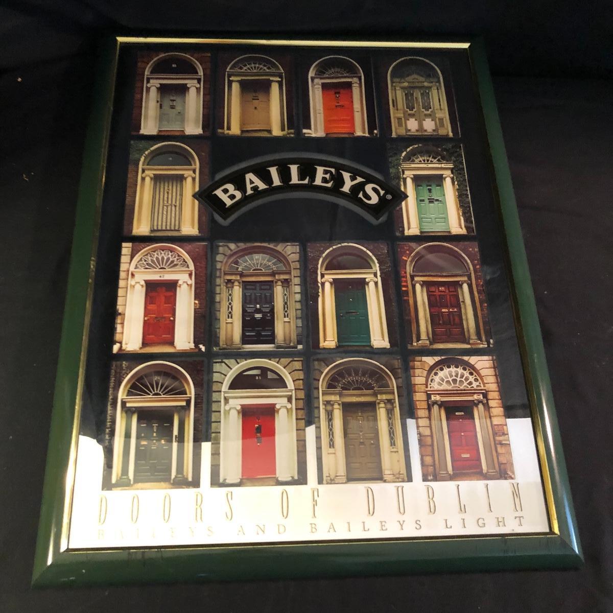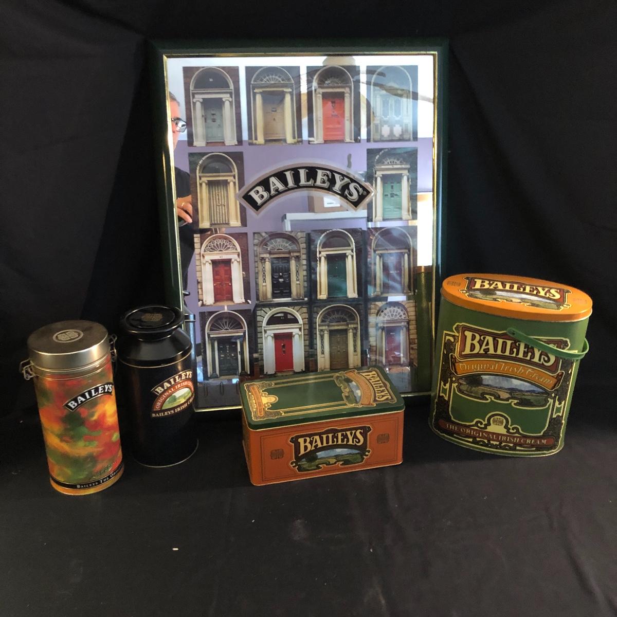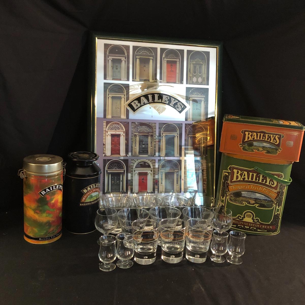 This lot offers a great selection for your bar or home. The lot includes a Baileys mirror, four metal Baileys containers, Baileys glasses in four different styles all with Baileys on the glasses. The frame measures 20” x 26”.