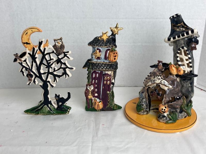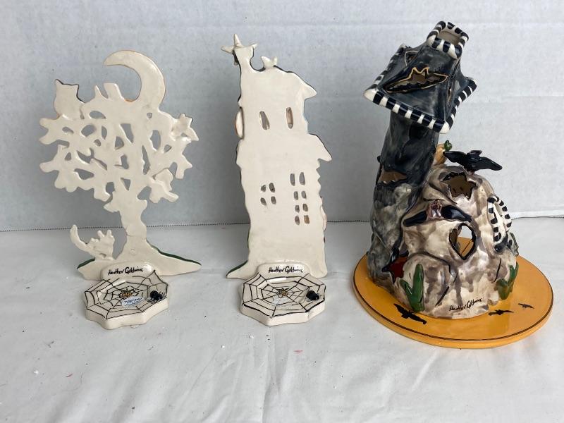 Blue Sky Clay Works Heather Goldminc “Batcave” “Spooky Howl House” and “Spooky Tree” tea light candle holders