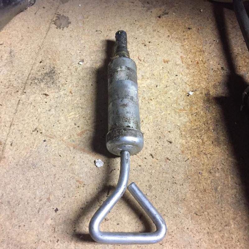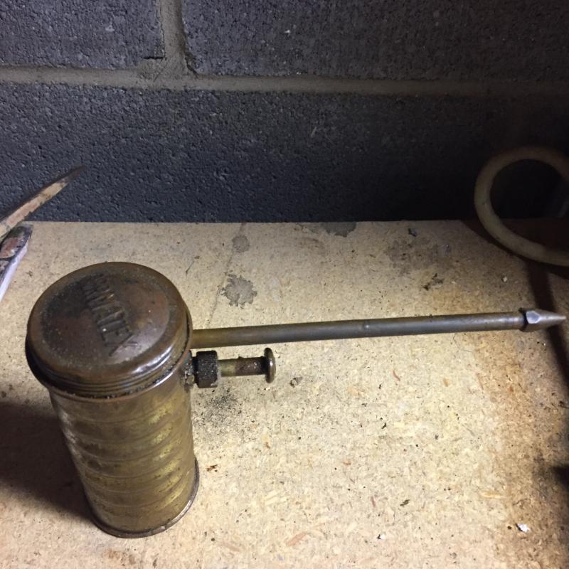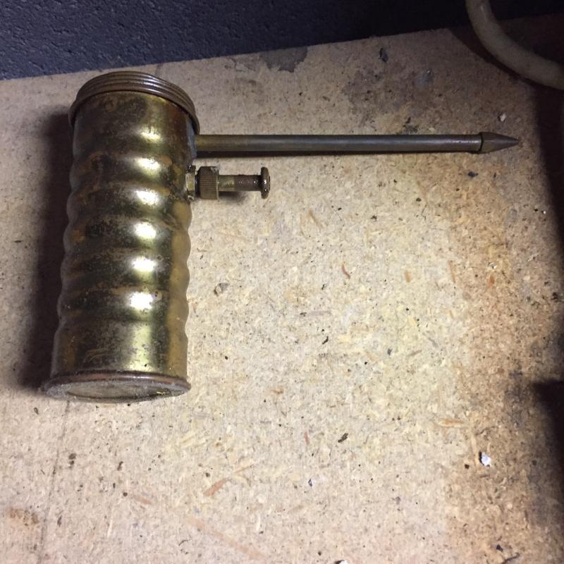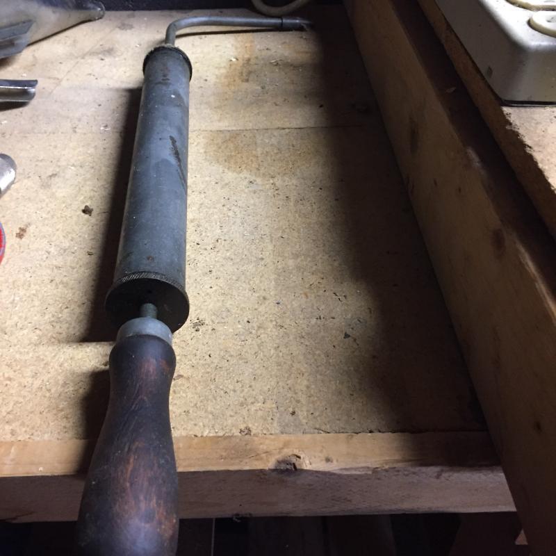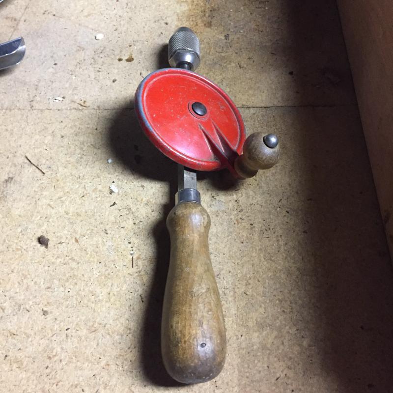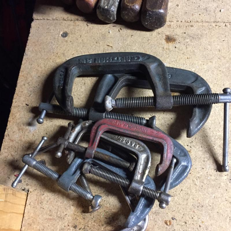 Assortment of Tools. Wooden handle screwdrivers,C-clamps,hand drill,oil squirt can,metal gas can and more.