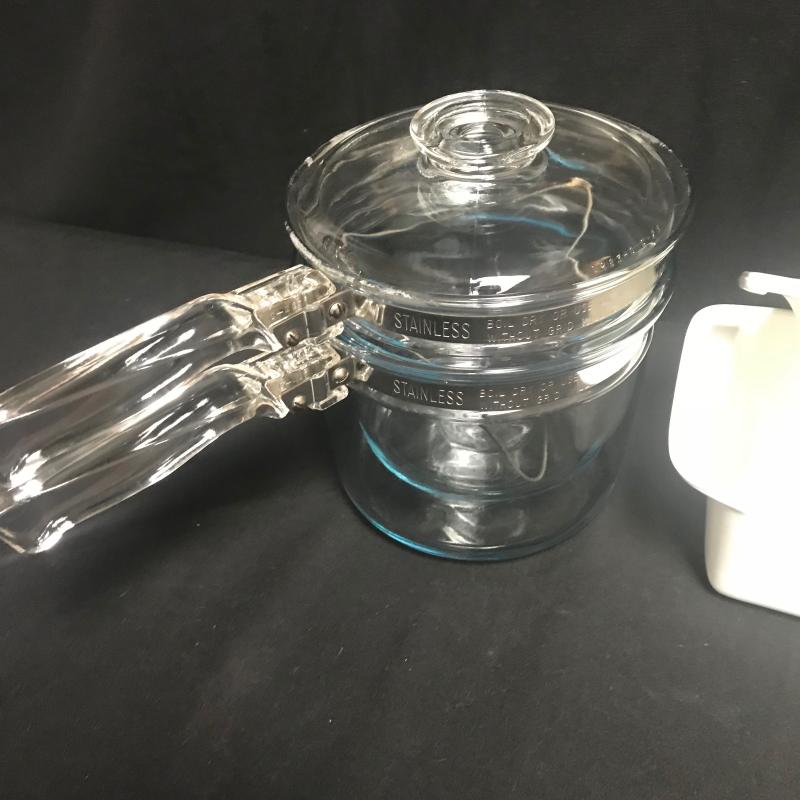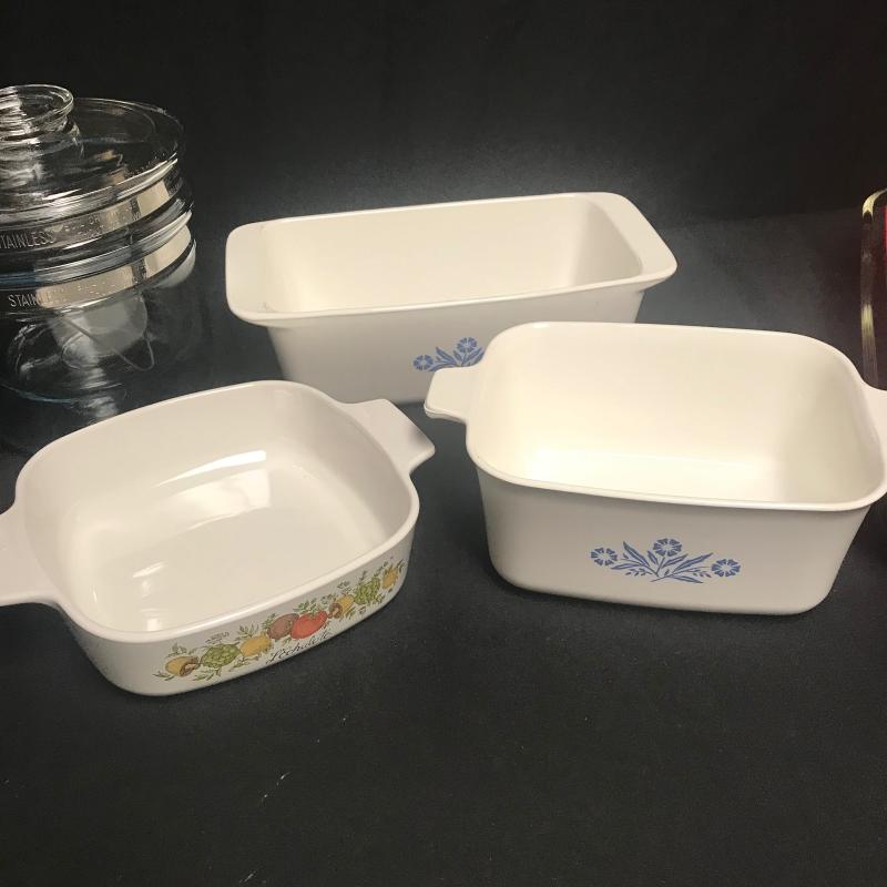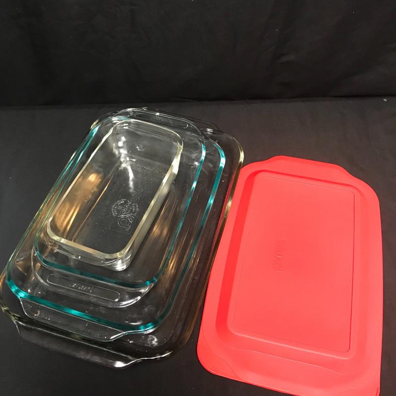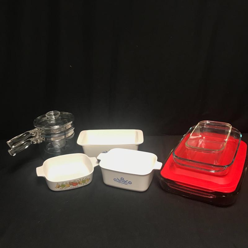 3 Corning Pots, Pyrex double boiler, and 4 Pyrex casserole dishes with one red lid for middle size one. Local pick up only.