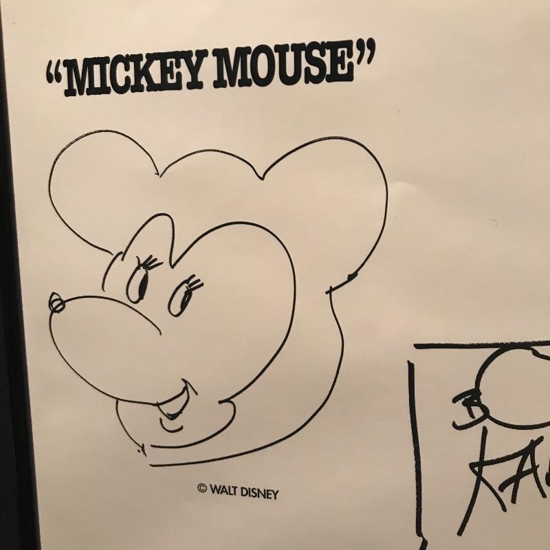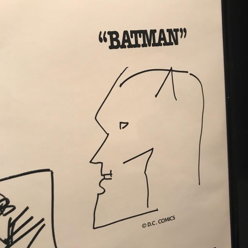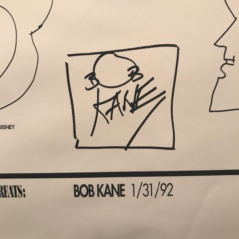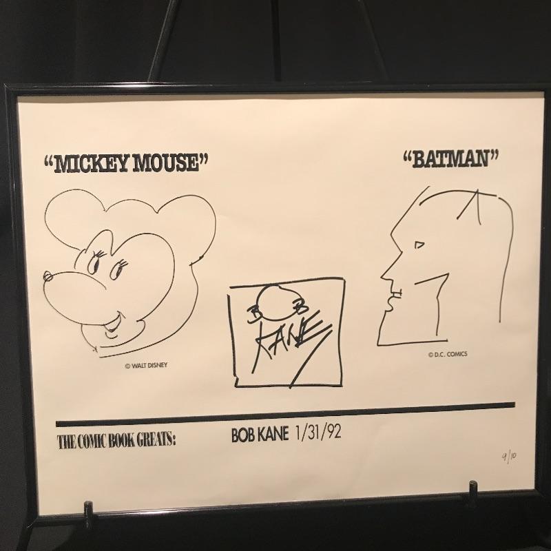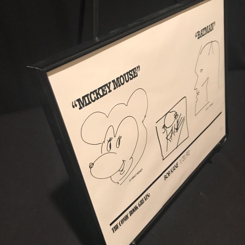 This is a framed signed drawing by Bob Kane, Co-creator of Batman for DC Comics. It appears to be an ink drawing of Mickey Mouse and of Batman along side his signature. Also says 9/10 on bottom right corner. No glass on frame. 15” x 12” Good condition.