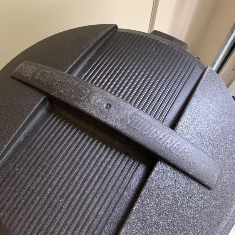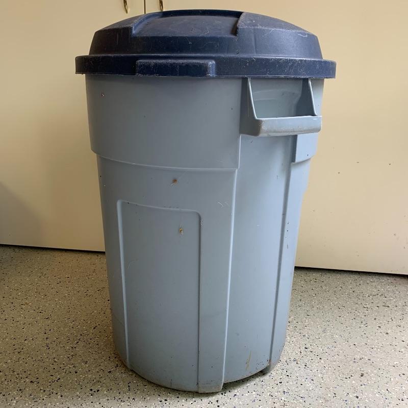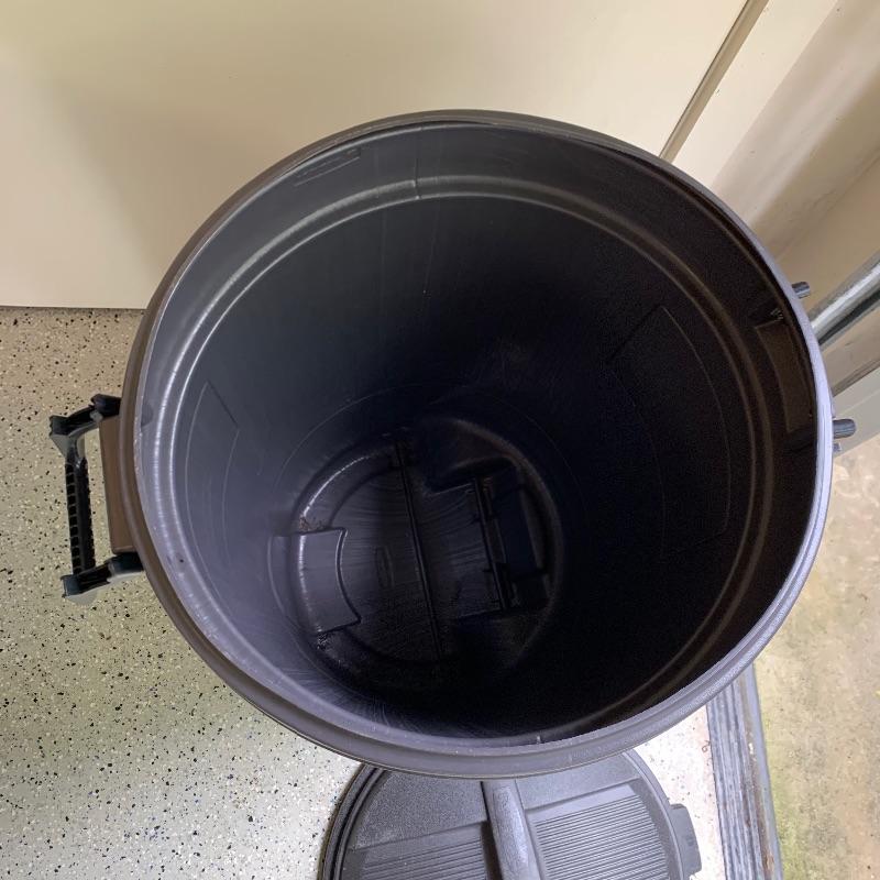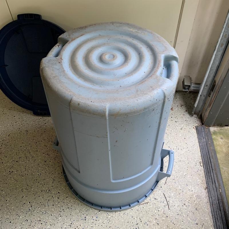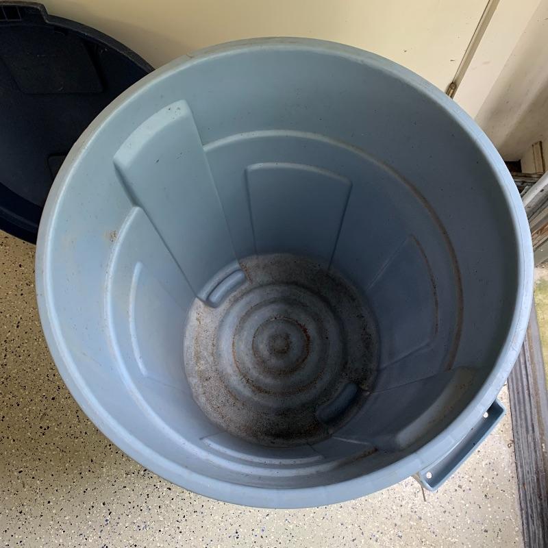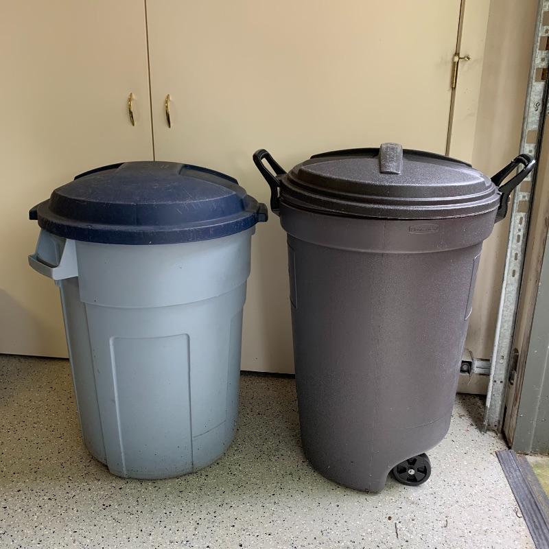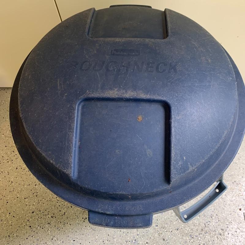 This lot consists of two large and sturdy Rubbermaid trash cans. They both have lids that lock in place. The black trash can has wheels for easy moving. The blue trash can does have a slight garbage smell and could use a good cleaning. Local pickup only.