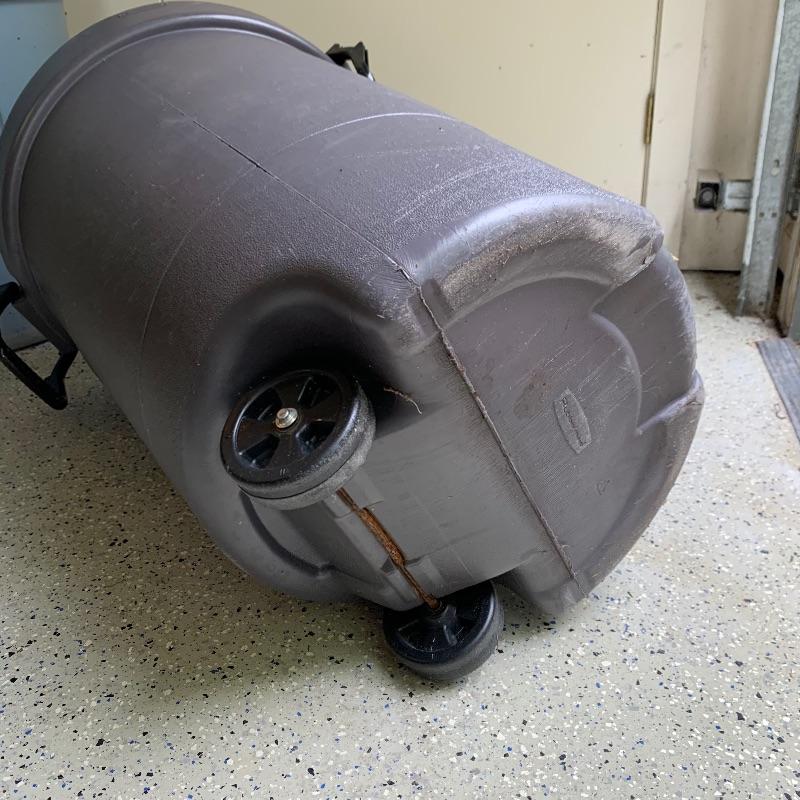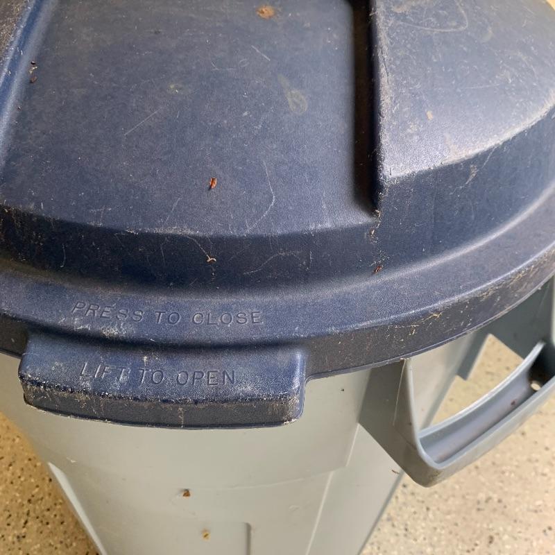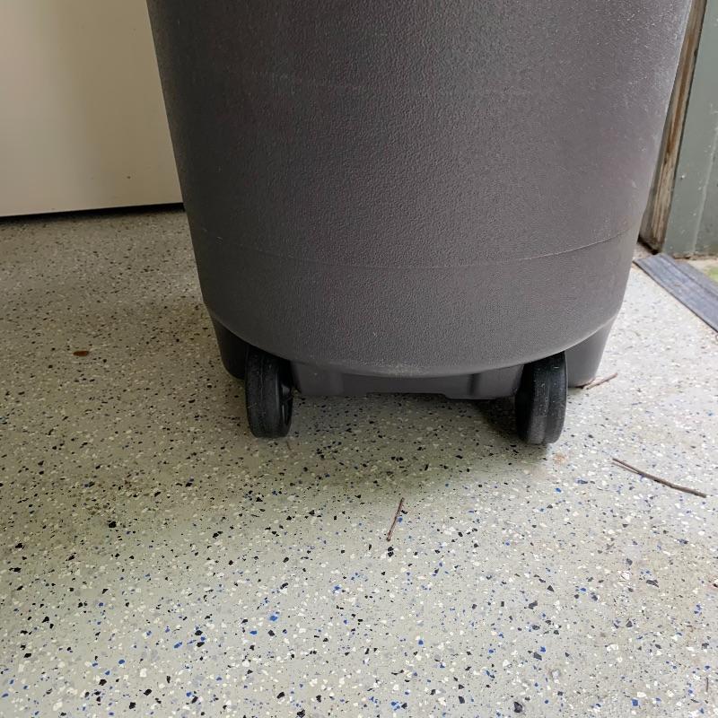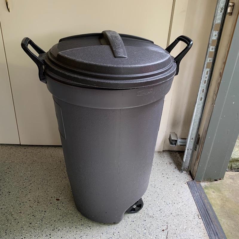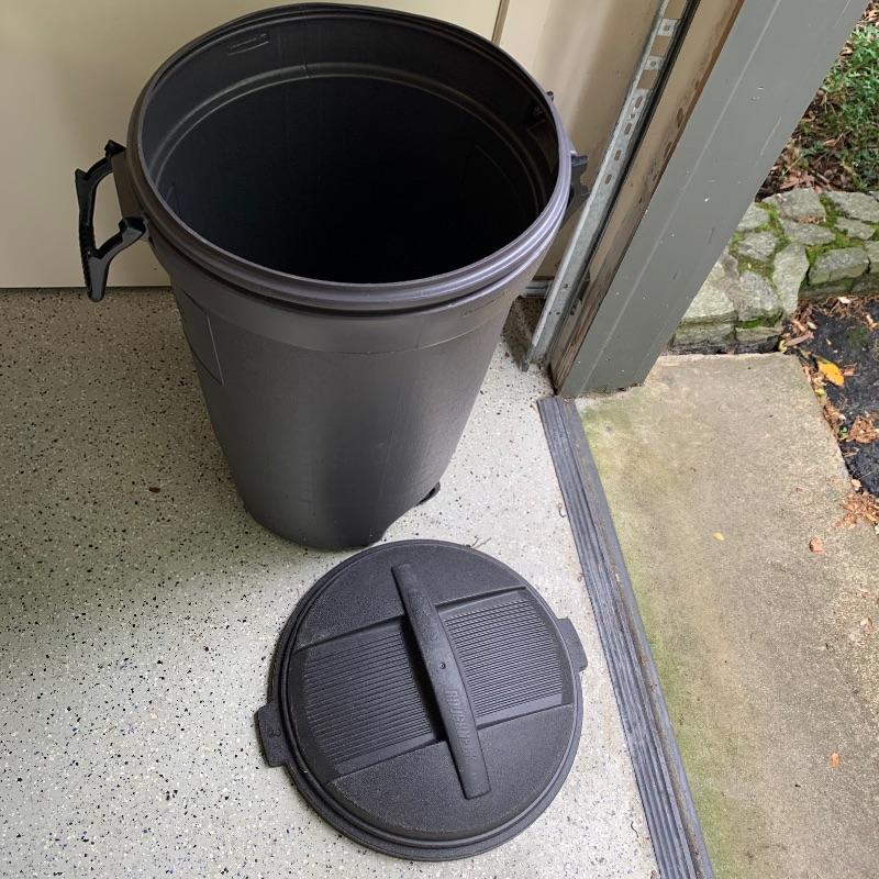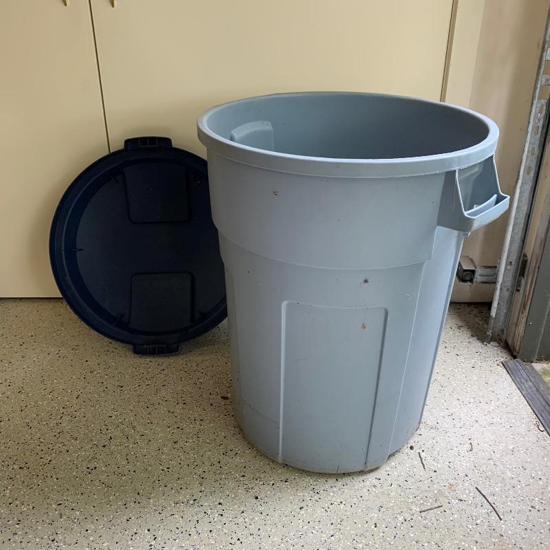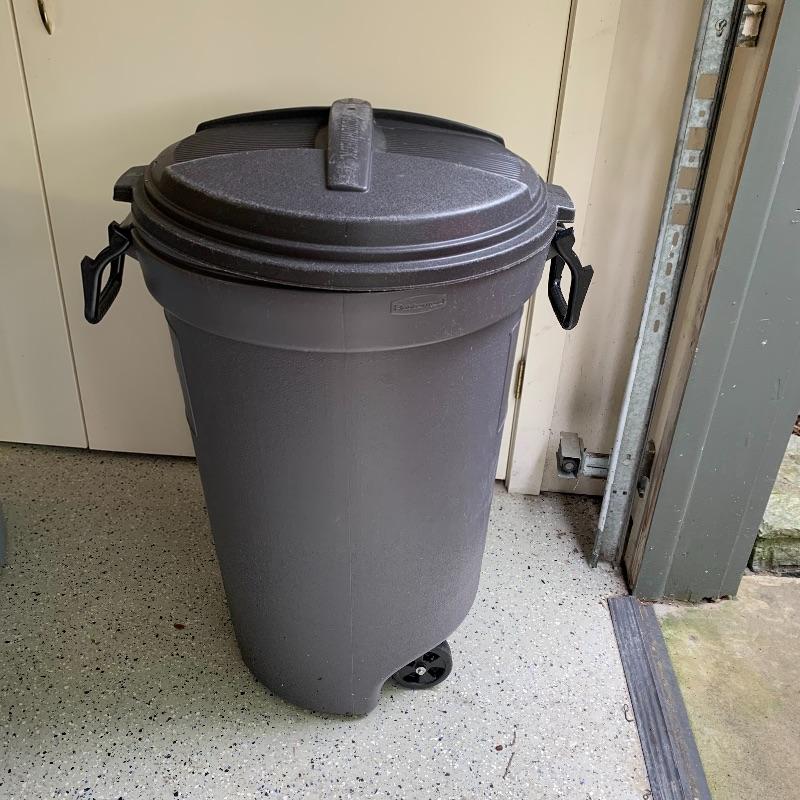 This lot consists of two large and sturdy Rubbermaid trash cans. They both have lids that lock in place. The black trash can has wheels for easy moving. The blue trash can does have a slight garbage smell and could use a good cleaning. Local pickup only.