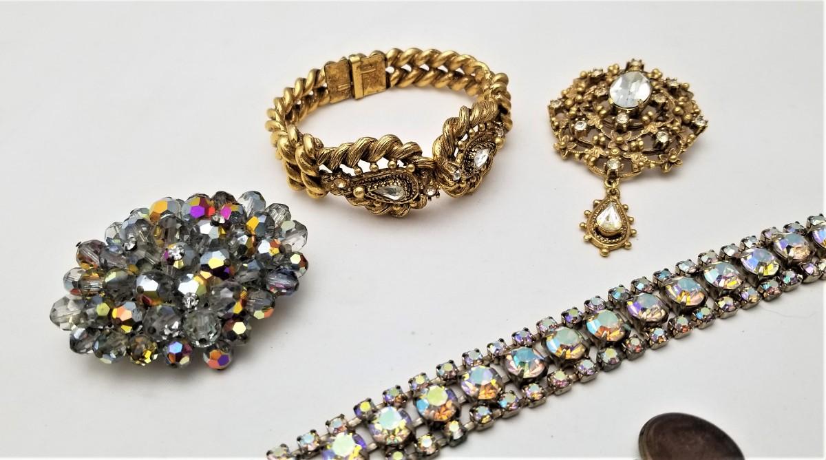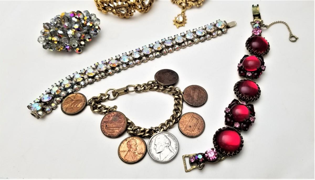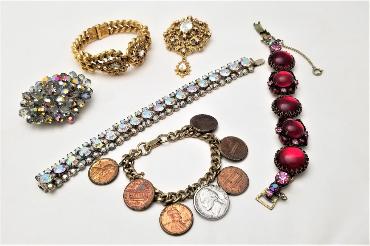 You get all you see here - Vintage Rhinestone bracelet (has some verdigris on the back but stones complete and unaffected - 7.25" long), vintage aurora borealis brooch (2.25" across), hinged goldtone bracelet with rhinestone accents, signed FLORENZA, Goldtone brooch with rhinestone dangle, signed FLORENZA (3" long), goldtone nickel and penny (some are wheat pennies) bracelet, vintage bracelet with red cabochon stones and pink rhinestones (6.5" long). All in vintage condition. Unsigned unless signature noted.