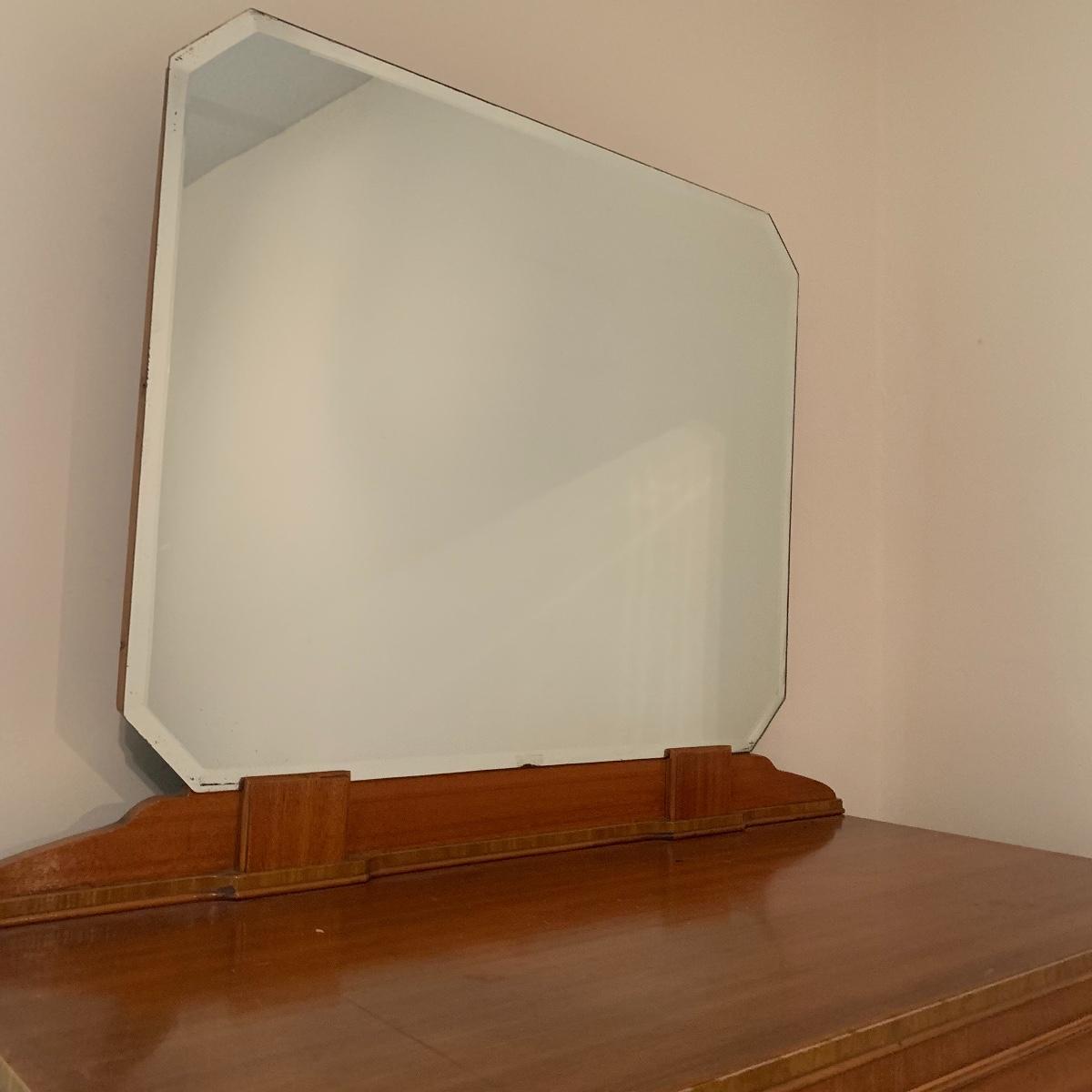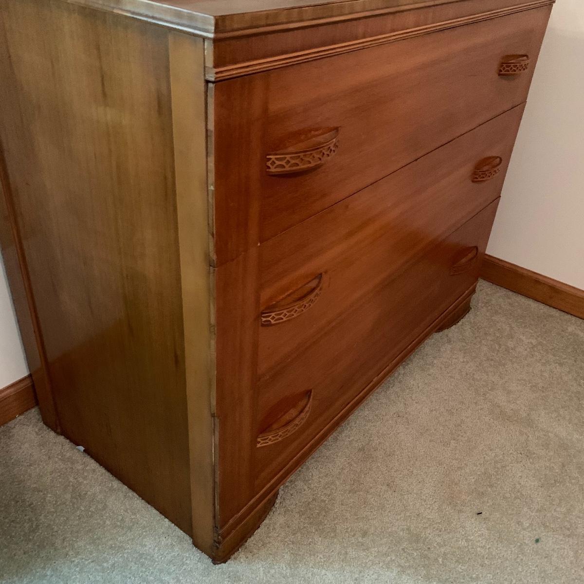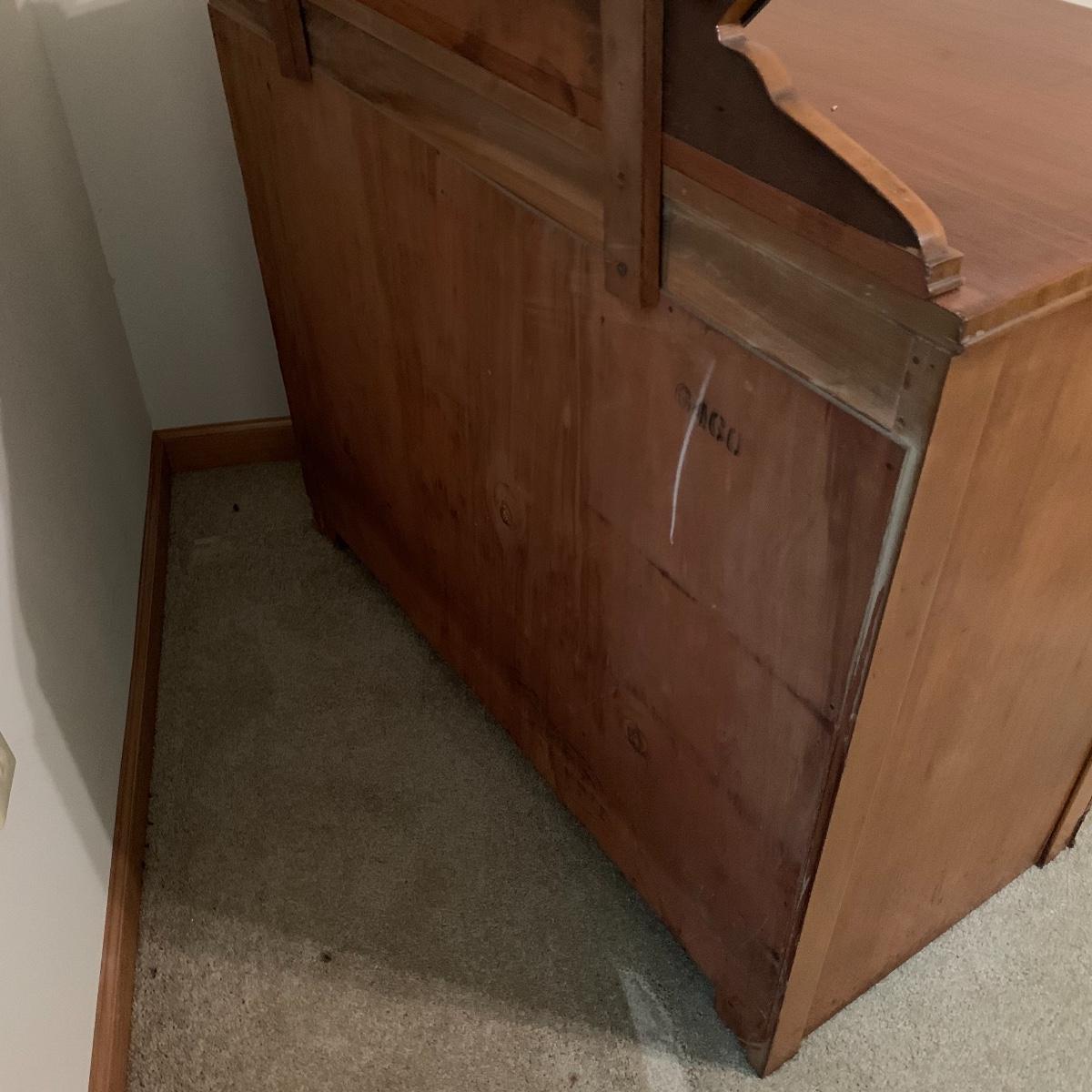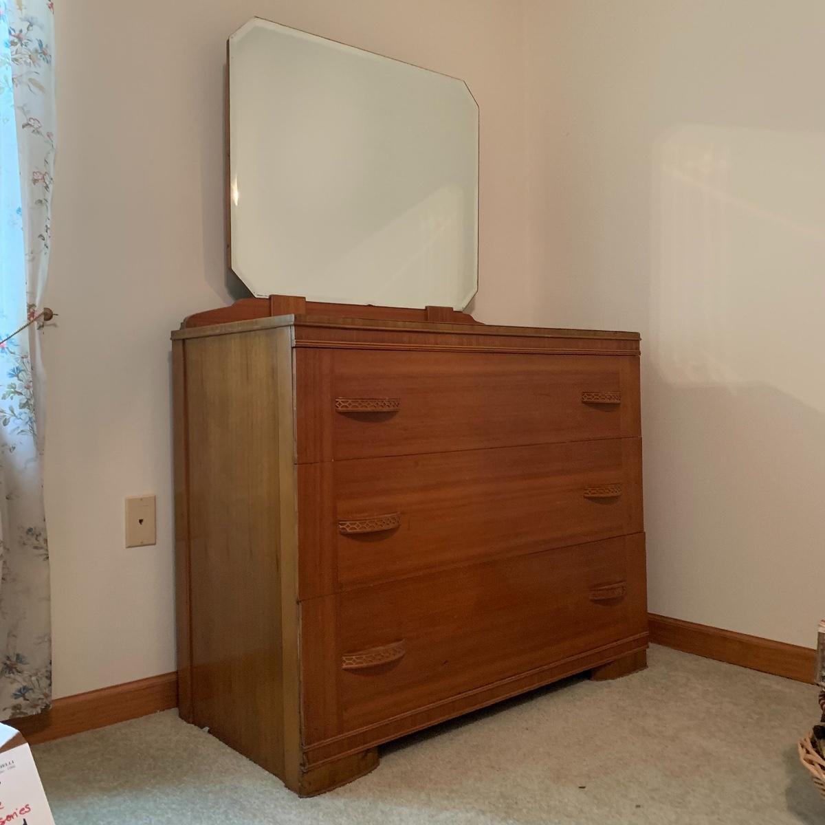 This is a really unique looking dresser and mirror. There are matching pieces in Lots 4 and 275, so be sure to check those out as well. The dresser is a nice light brown wood. It has three large dovetailed drawers. Each drawer has two interesting decorative handles. The mirror is a beveled rectangular shape. It is attached to the dresser.; it does have some aged related minor blemishes shown in images. To disassemble the mirror from the dresser a screwdriver will be needed. Some scratches are apparent and the surface is slightly loose, but still fully functional. The dresser measures 42.5” x 20” x 35”. Including the mirror, the unit is 64” tall. The mirror measures 32” x 26”. No maker’s mark is apparent. Local pickup only. Please note that this item will need to be moved by the winning bidder from the second floor of the house. There are casters that are in drawer and appear to go with this dresser.