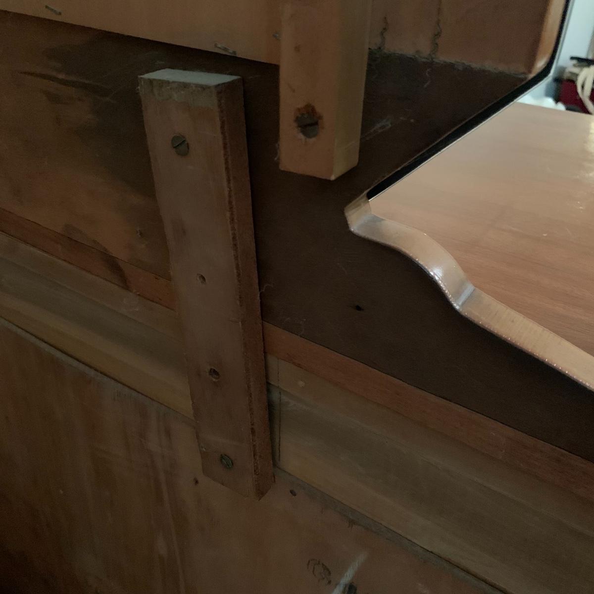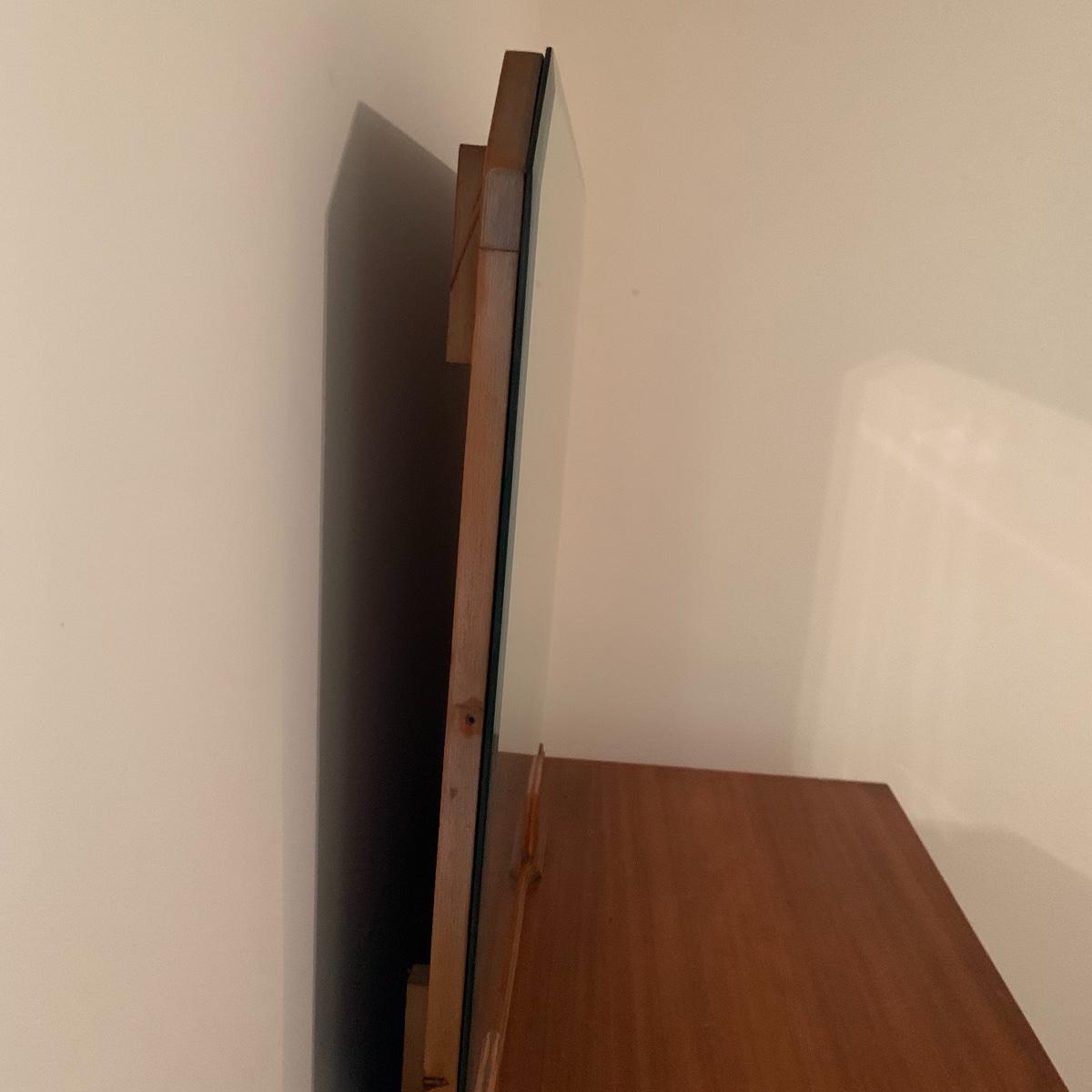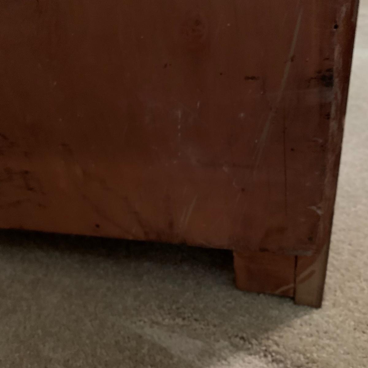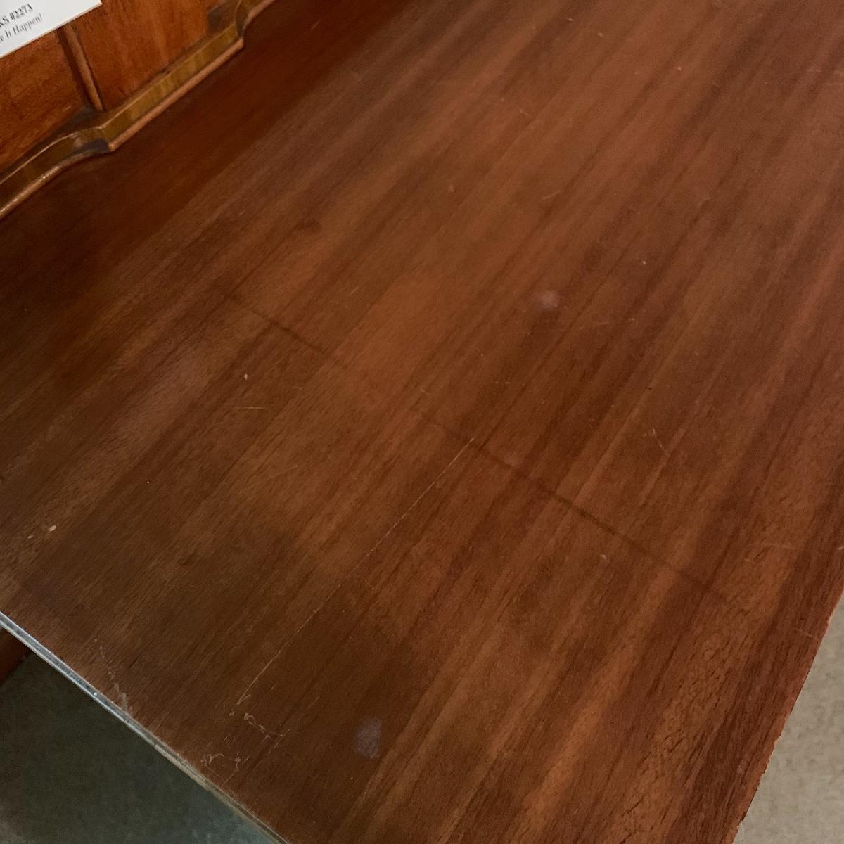 This is a really unique looking dresser and mirror. There are matching pieces in Lots 4 and 275, so be sure to check those out as well. The dresser is a nice light brown wood. It has three large dovetailed drawers. Each drawer has two interesting decorative handles. The mirror is a beveled rectangular shape. It is attached to the dresser.; it does have some aged related minor blemishes shown in images. To disassemble the mirror from the dresser a screwdriver will be needed. Some scratches are apparent and the surface is slightly loose, but still fully functional. The dresser measures 42.5” x 20” x 35”. Including the mirror, the unit is 64” tall. The mirror measures 32” x 26”. No maker’s mark is apparent. Local pickup only. Please note that this item will need to be moved by the winning bidder from the second floor of the house. There are casters that are in drawer and appear to go with this dresser.