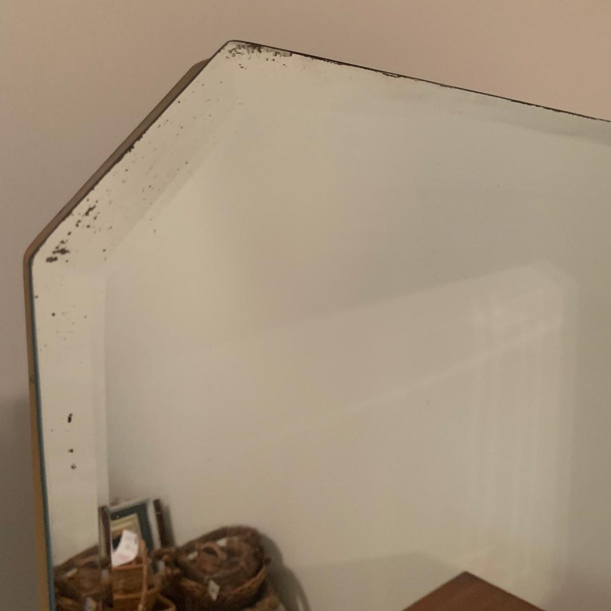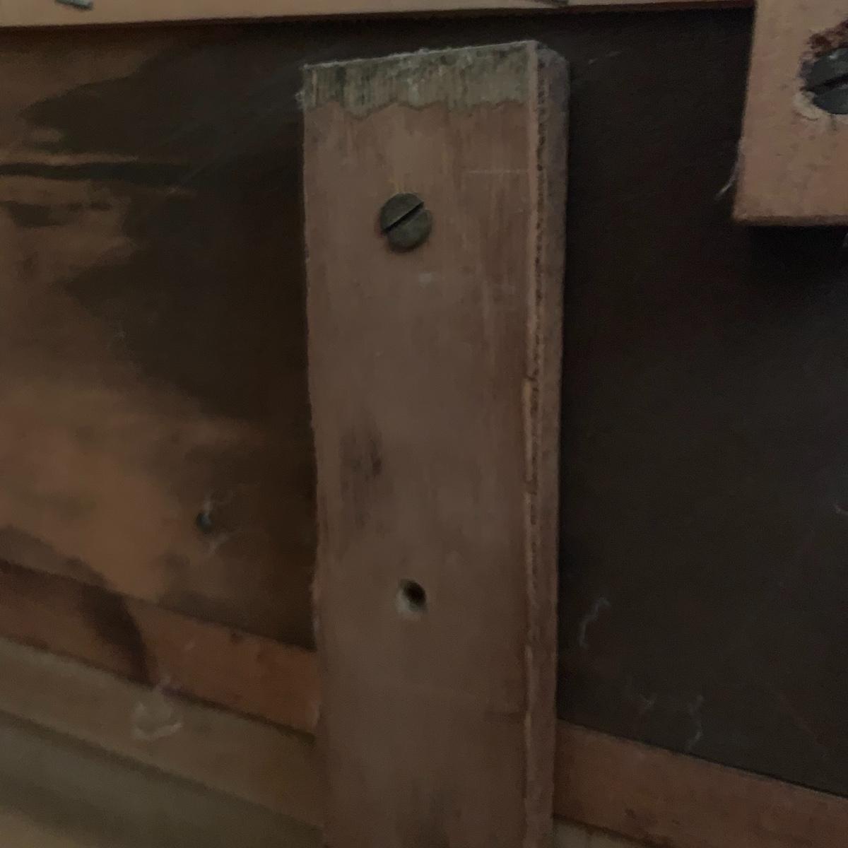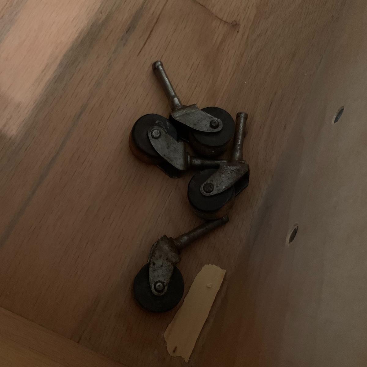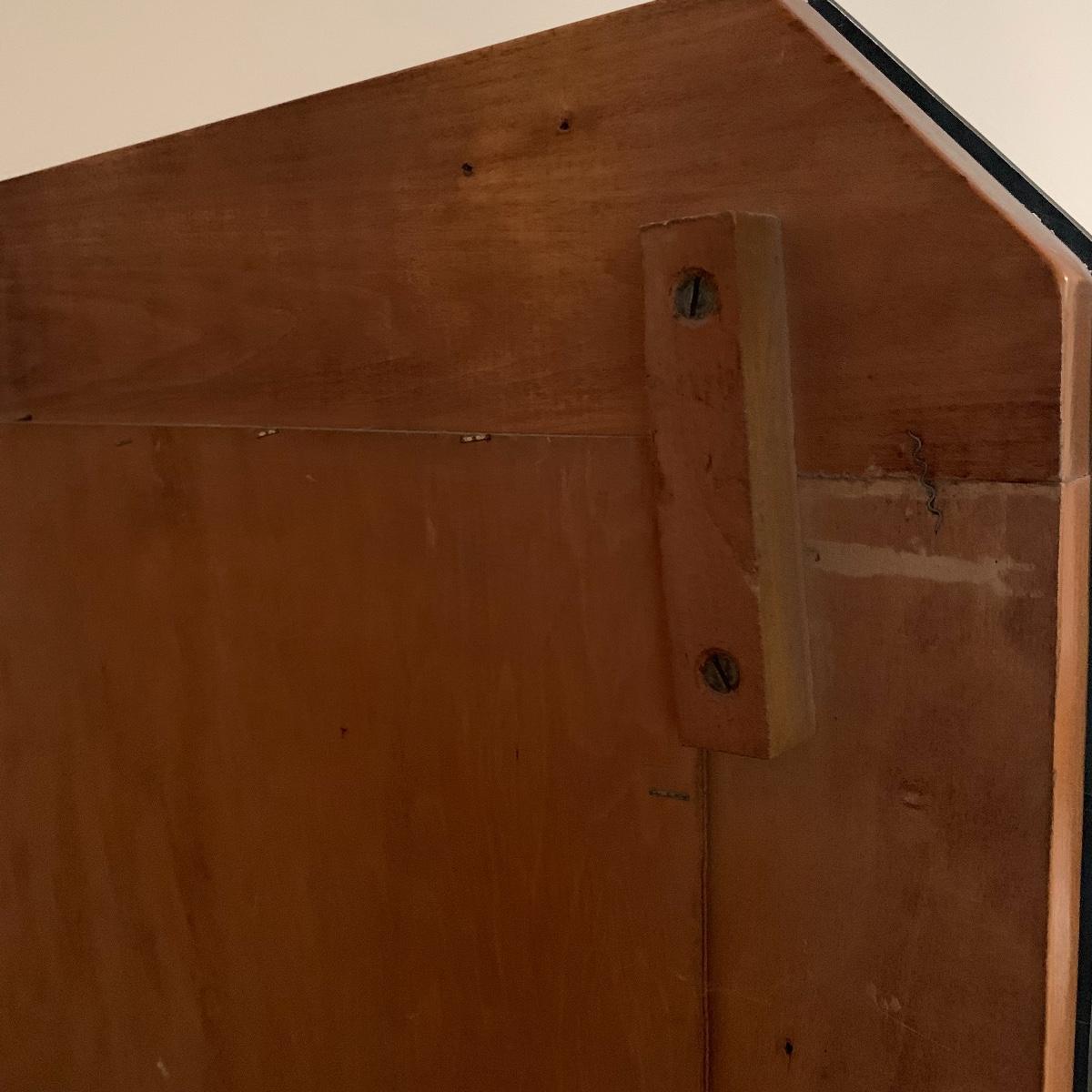 This is a really unique looking dresser and mirror. There are matching pieces in Lots 4 and 275, so be sure to check those out as well. The dresser is a nice light brown wood. It has three large dovetailed drawers. Each drawer has two interesting decorative handles. The mirror is a beveled rectangular shape. It is attached to the dresser.; it does have some aged related minor blemishes shown in images. To disassemble the mirror from the dresser a screwdriver will be needed. Some scratches are apparent and the surface is slightly loose, but still fully functional. The dresser measures 42.5” x 20” x 35”. Including the mirror, the unit is 64” tall. The mirror measures 32” x 26”. No maker’s mark is apparent. Local pickup only. Please note that this item will need to be moved by the winning bidder from the second floor of the house. There are casters that are in drawer and appear to go with this dresser.