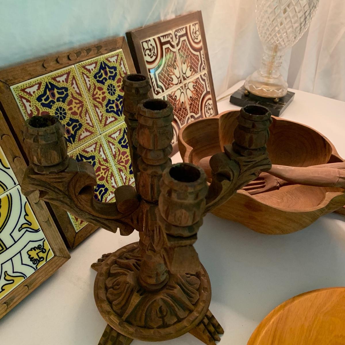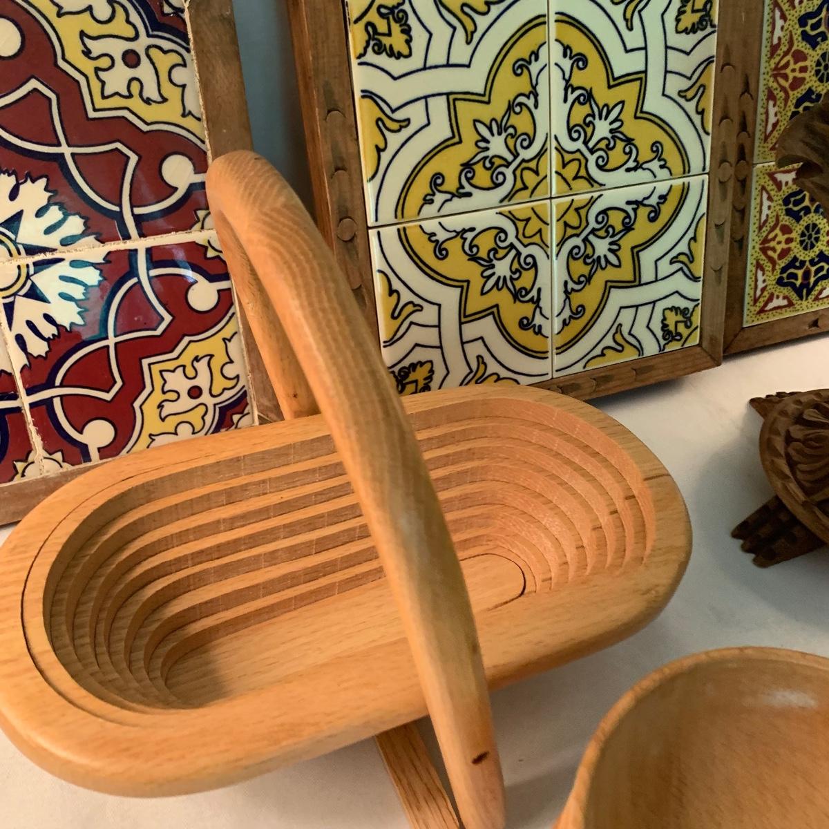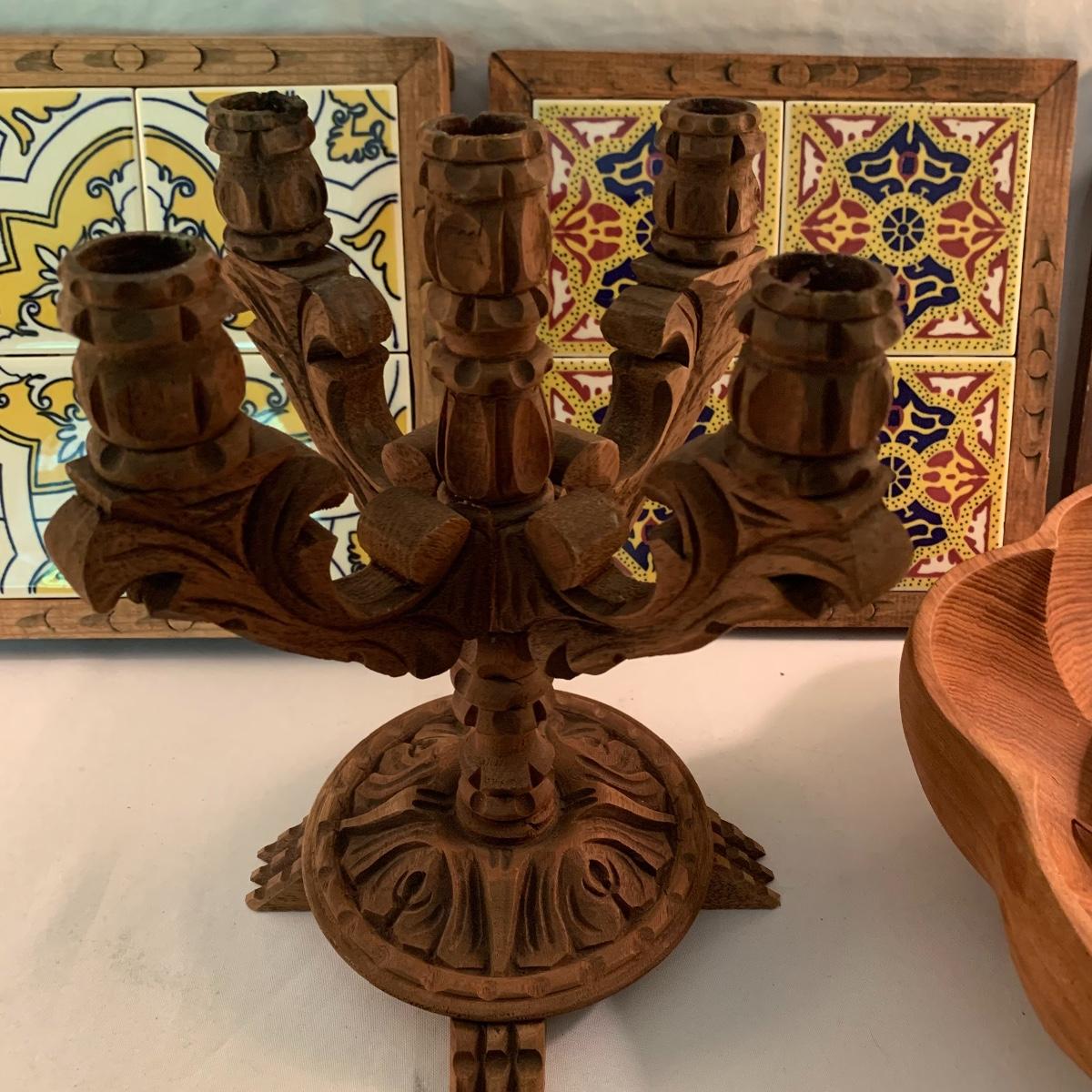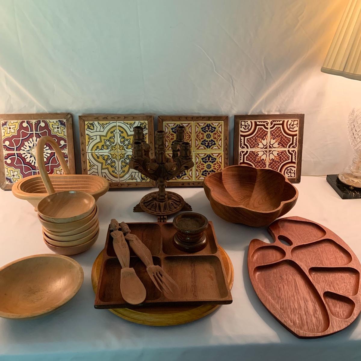 Beautiful wooden accents. Included in this group is a salad bowl with serving utensils, a square divided serving tray, a set of salad bowls, a collapsible basket, a 10.5” tall wooden candle holder, a 14” diameter lazy Susan tray, an 18.5” leaf shaped tray, and four wood framed, decorative tile trivets. Local pickup only.
