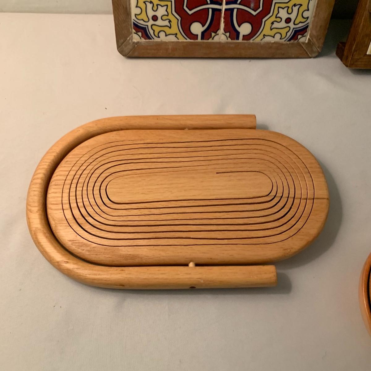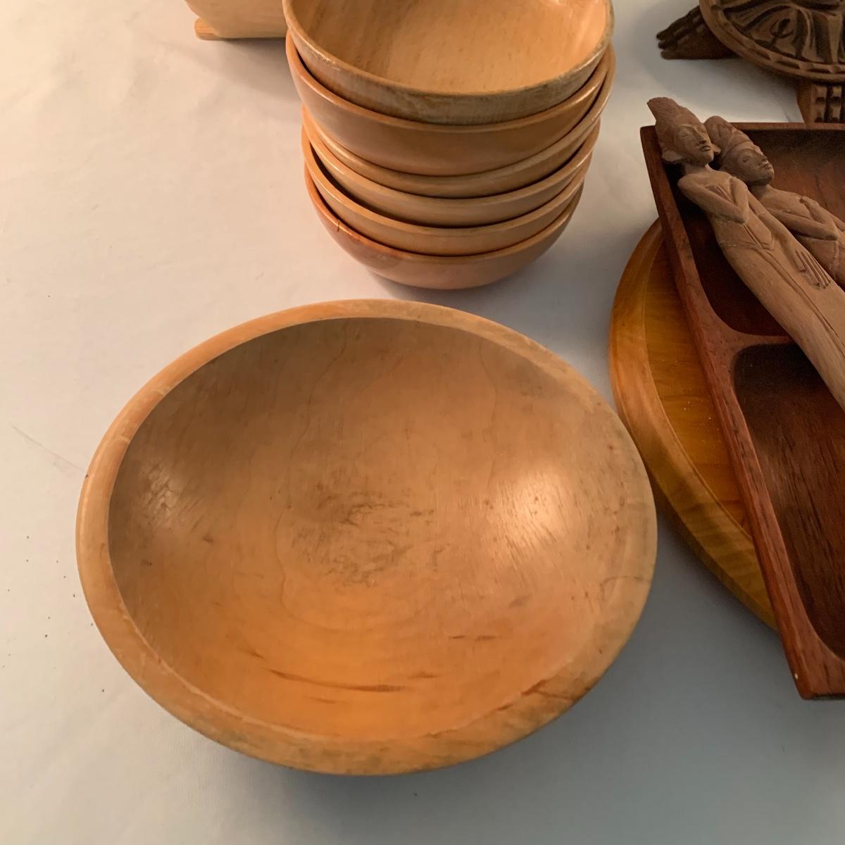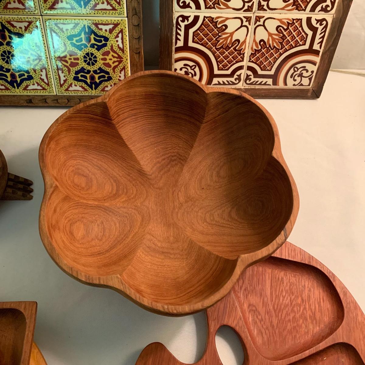 Beautiful wooden accents. Included in this group is a salad bowl with serving utensils, a square divided serving tray, a set of salad bowls, a collapsible basket, a 10.5” tall wooden candle holder, a 14” diameter lazy Susan tray, an 18.5” leaf shaped tray, and four wood framed, decorative tile trivets. Local pickup only.
