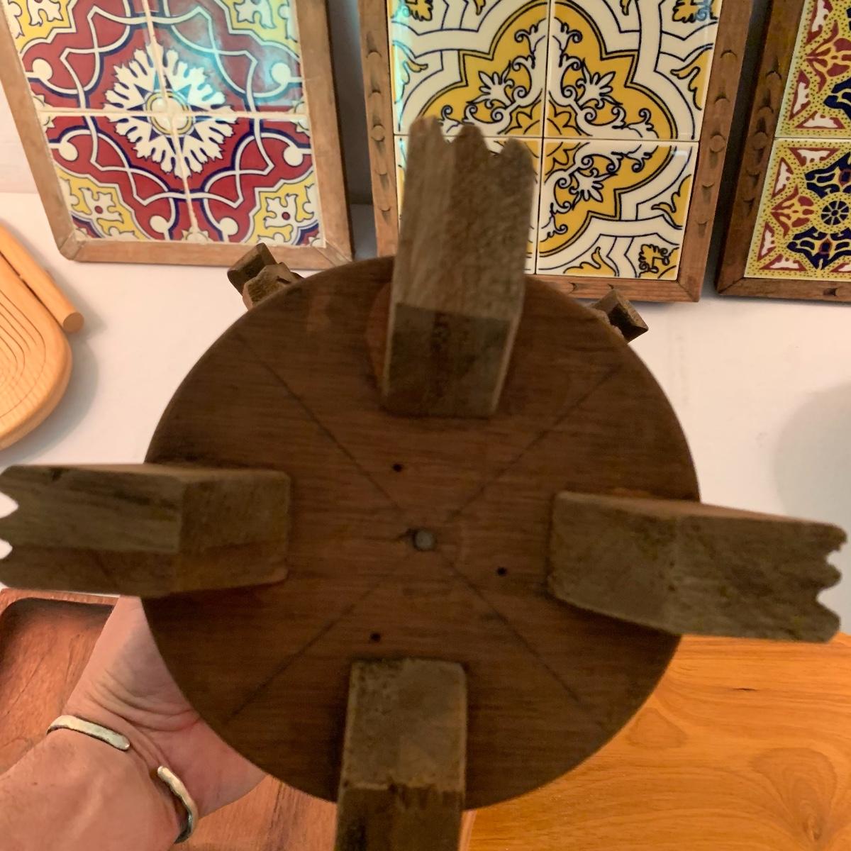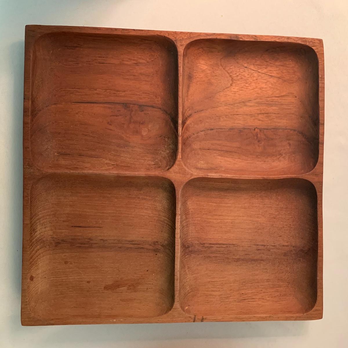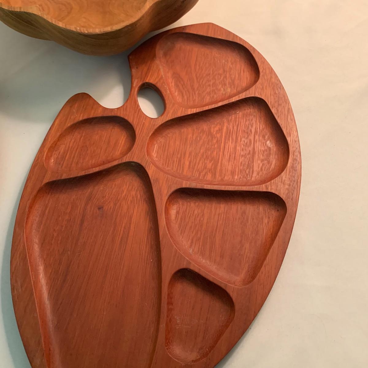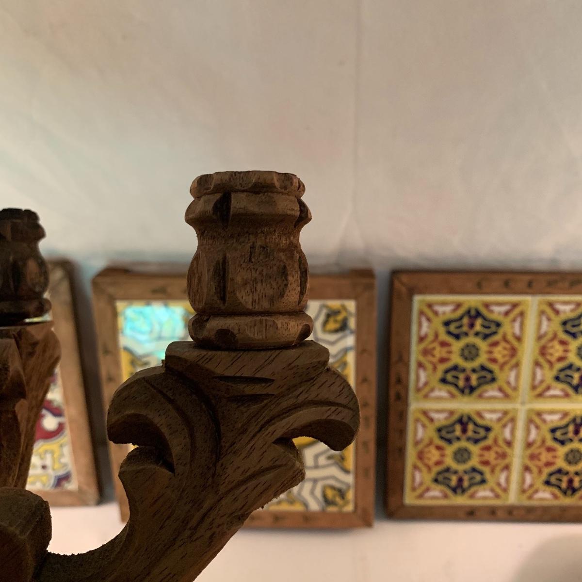 Beautiful wooden accents. Included in this group is a salad bowl with serving utensils, a square divided serving tray, a set of salad bowls, a collapsible basket, a 10.5” tall wooden candle holder, a 14” diameter lazy Susan tray, an 18.5” leaf shaped tray, and four wood framed, decorative tile trivets. Local pickup only.