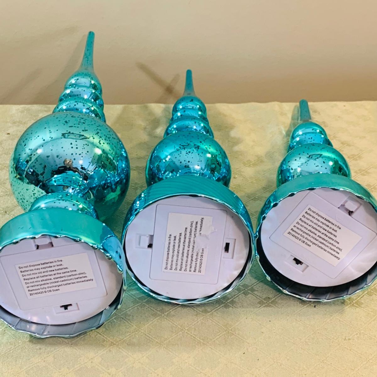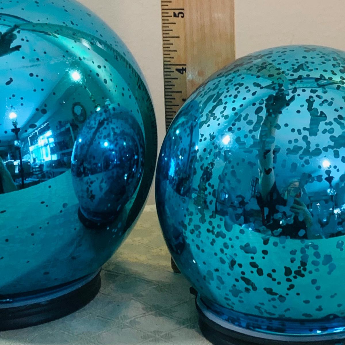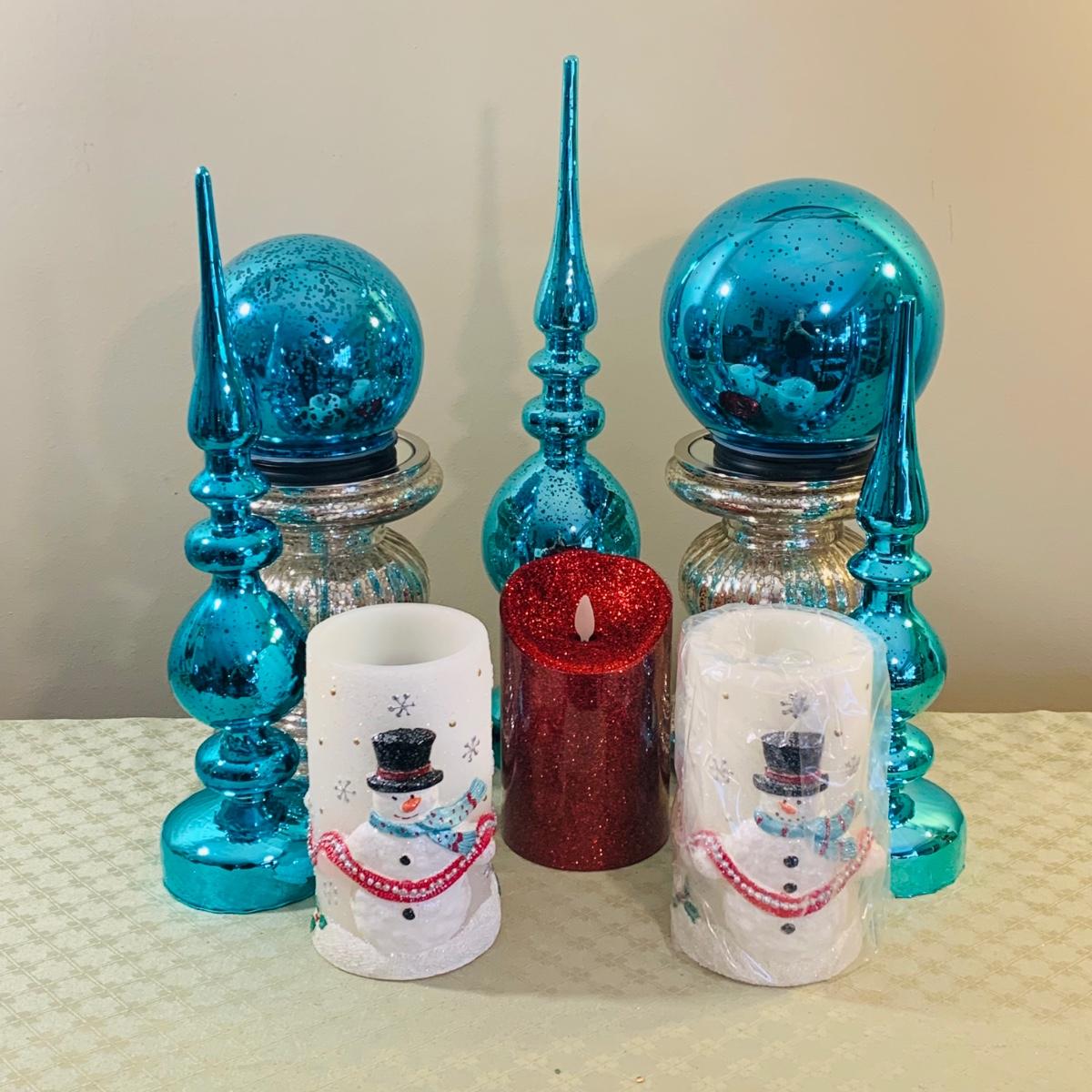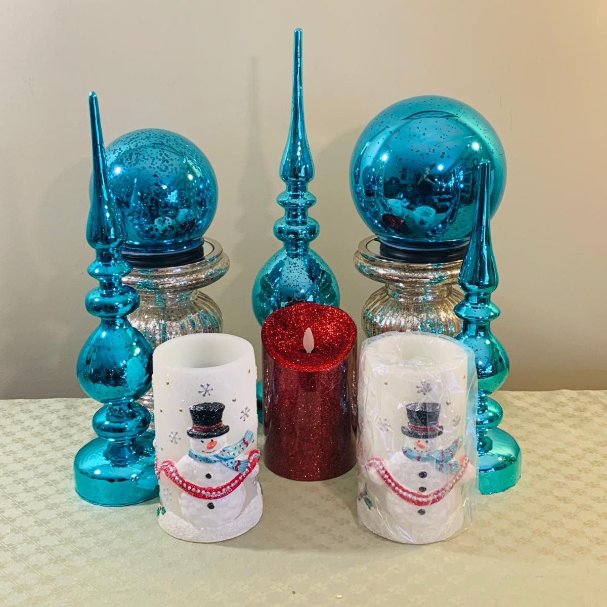 LOT 270R: Holiday Decor: Battery Operated Candles, Blue Mercury Glass Finials & Gazing Balls, Silver Mercury Glass Candle Holders