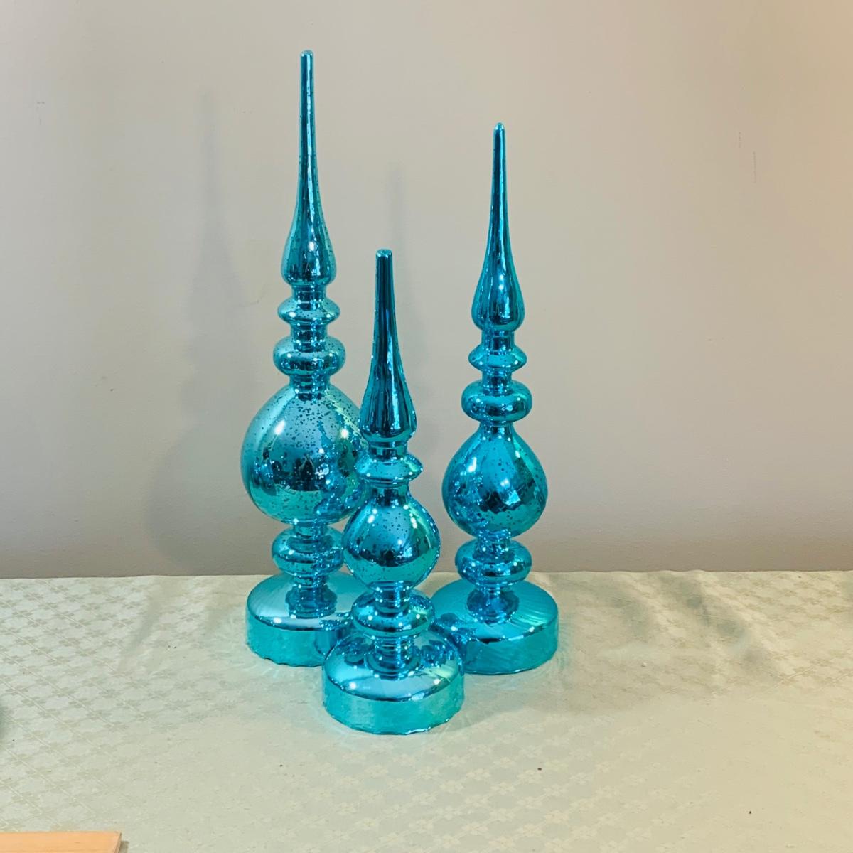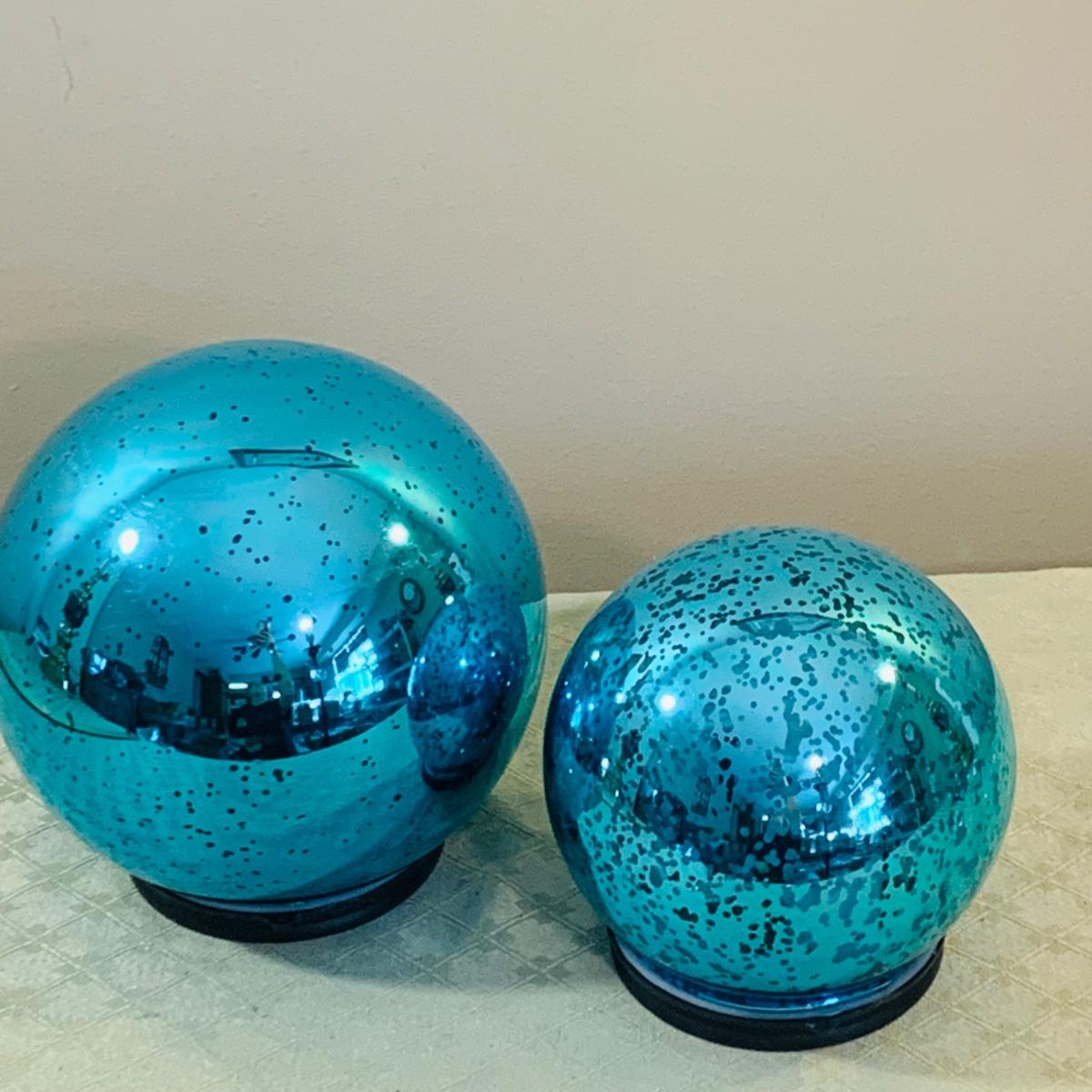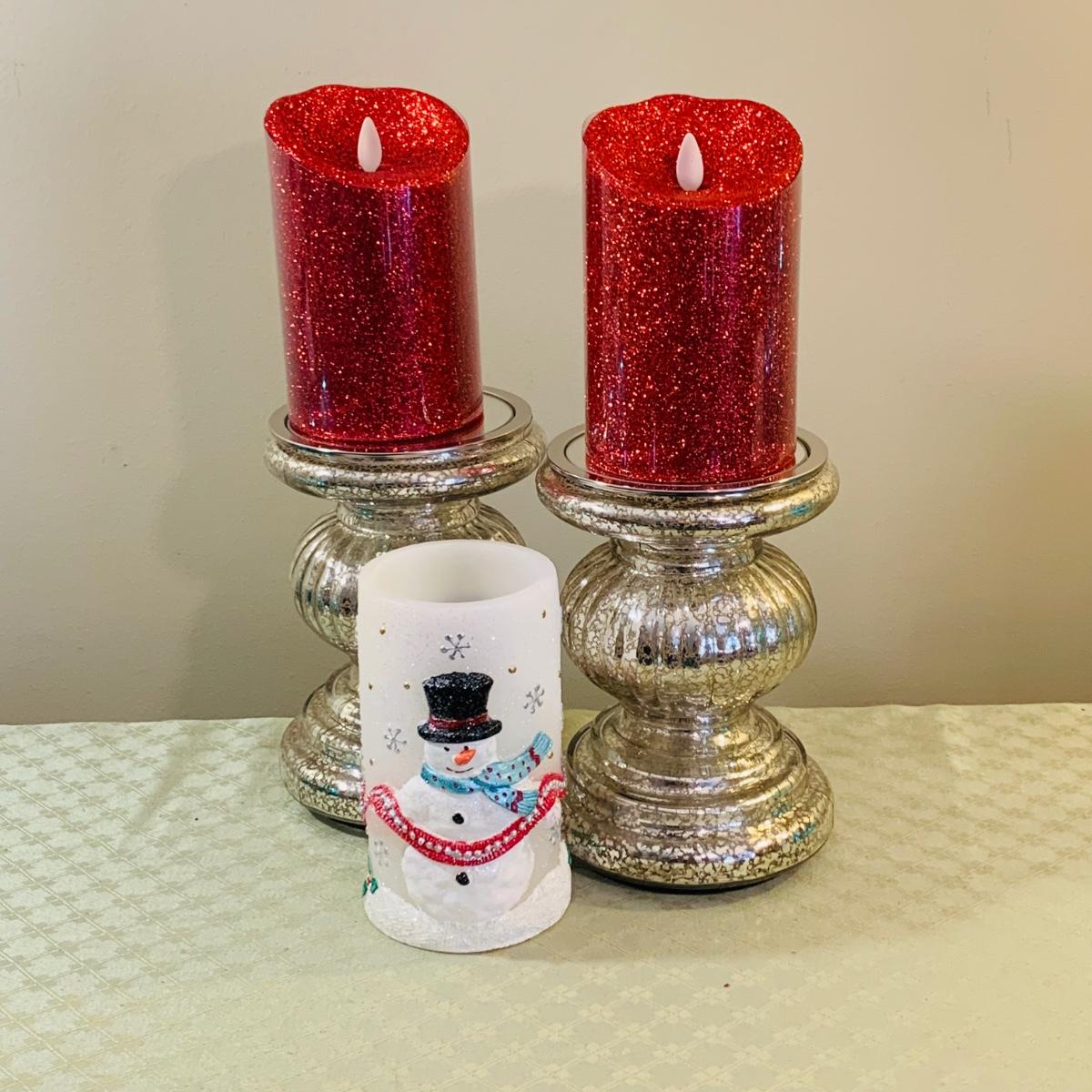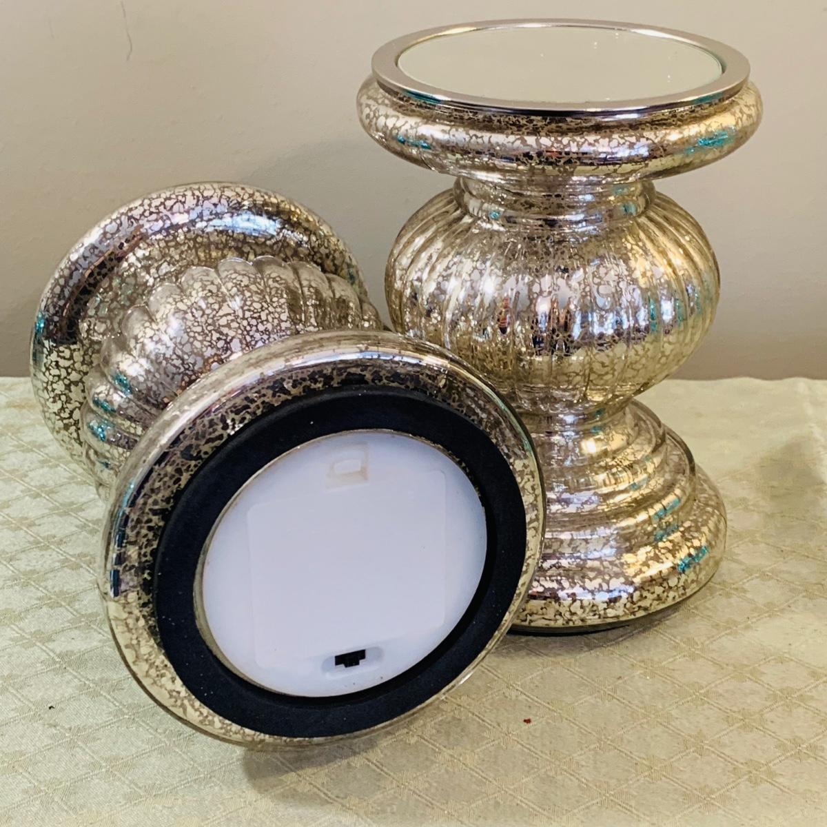 LOT 270R: Holiday Decor: Battery Operated Candles, Blue Mercury Glass Finials & Gazing Balls, Silver Mercury Glass Candle Holders