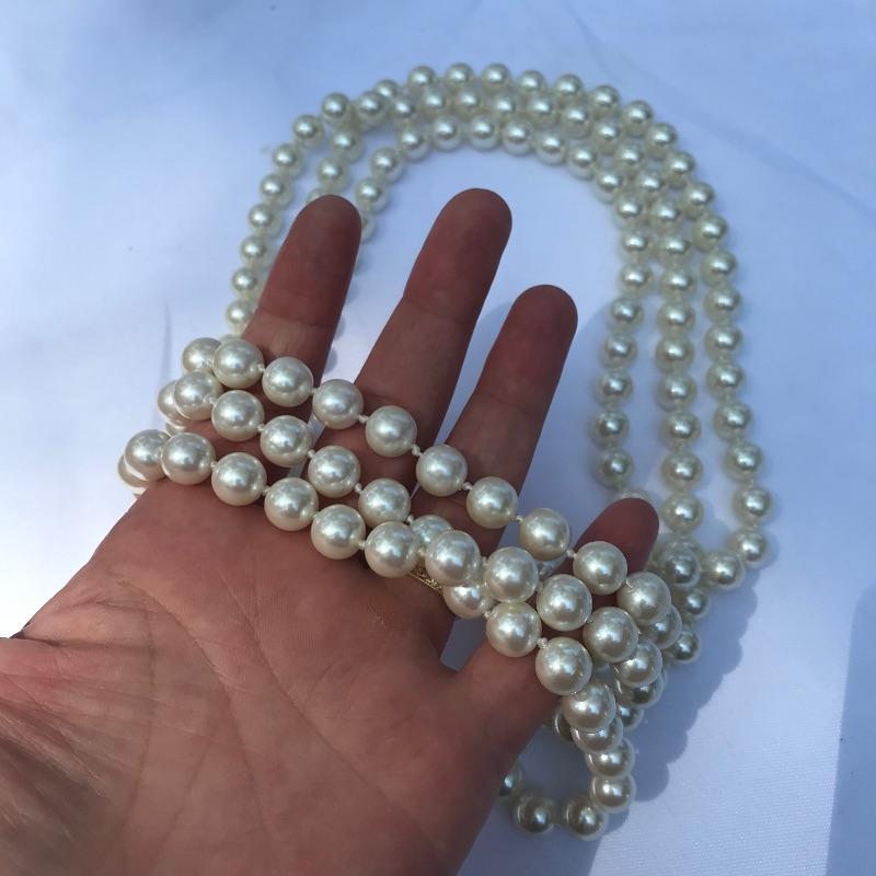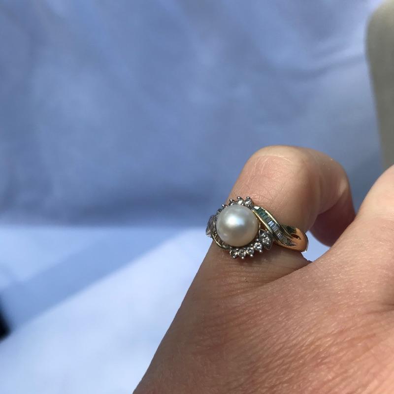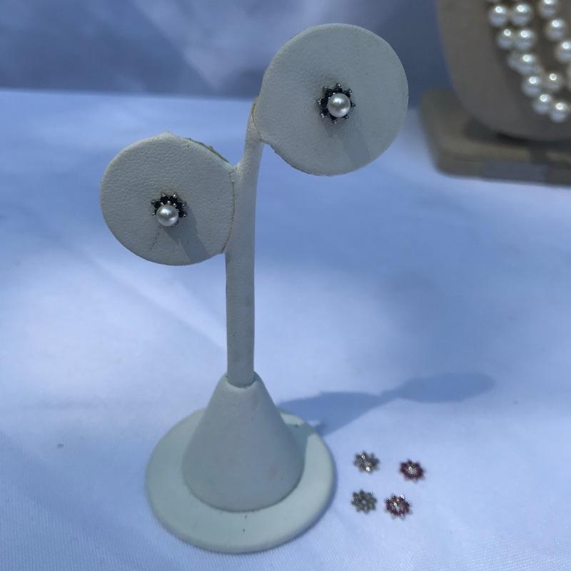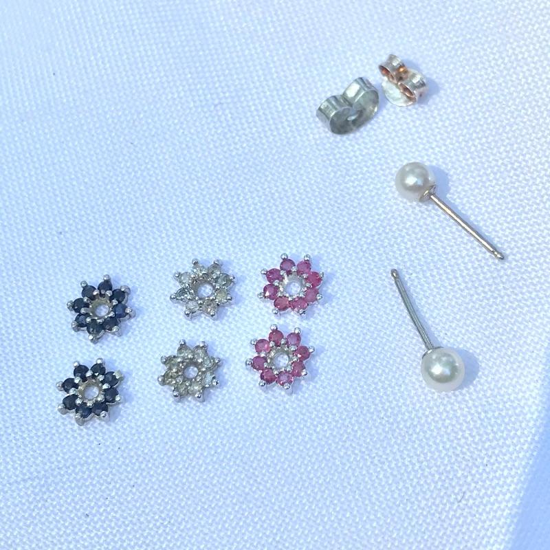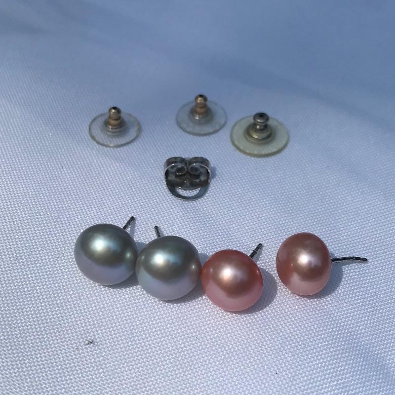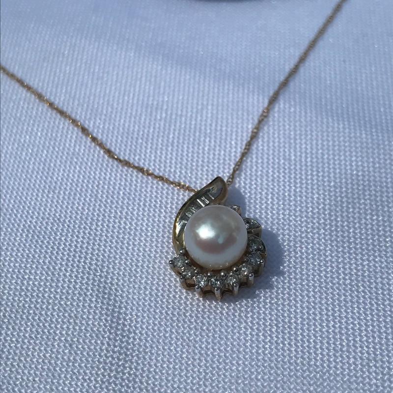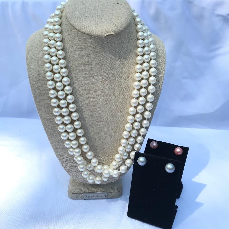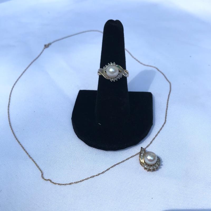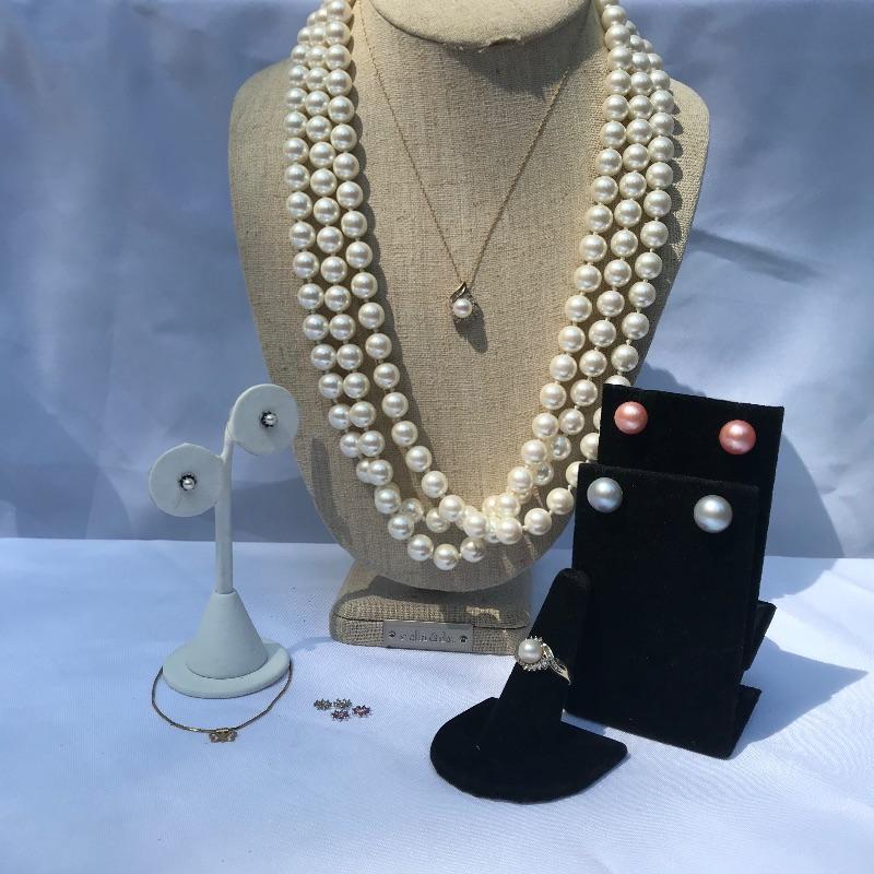 Elegant set with pearl and moissanite centerpieces marked 10K, including 10K chain. Lot also has even more pearly pieces! An extra long 36” pearl necklace, two larger grey and pink pairs of stud earrings. The smaller mother of pearl colored studs are marked 14K and we’ve added three pairs of accessories to add dazzle to your studs. Lastly, a butterfly charmed bracelet marked 10K. See photos.