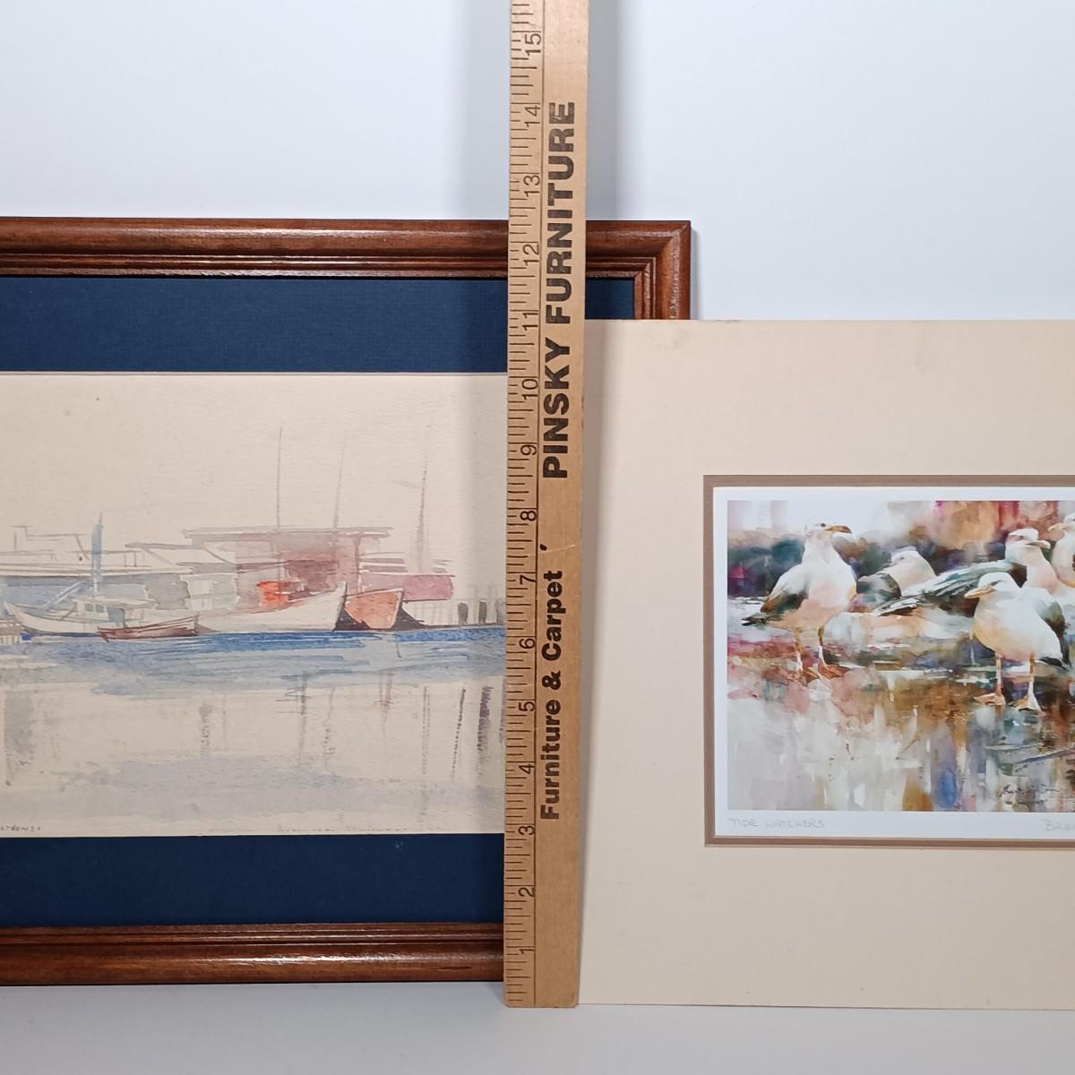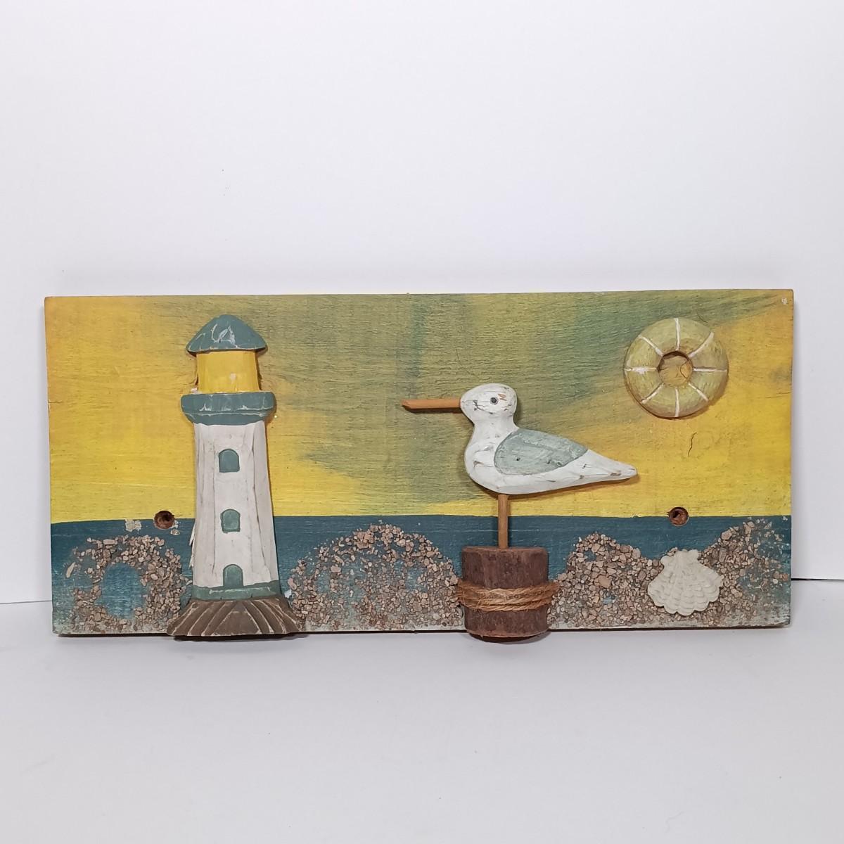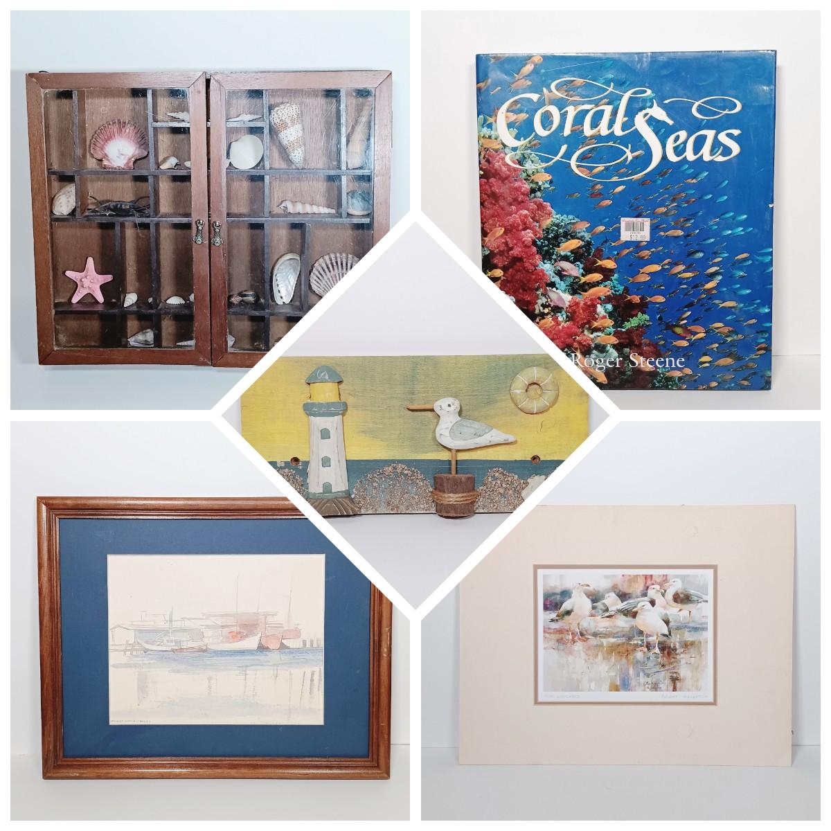 LOT 271: Watercolor by LiLo, Wood Art 'Lighthouse and Seagull', Shadow Box Containing Shells & More