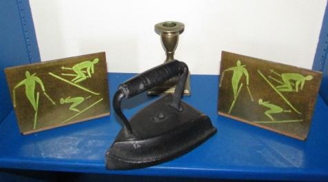 HEAVY METAL BOOKENDS WITH ENAMEL OR SOMETHING LIKE IT OR THE SKIERS TO SKI ON