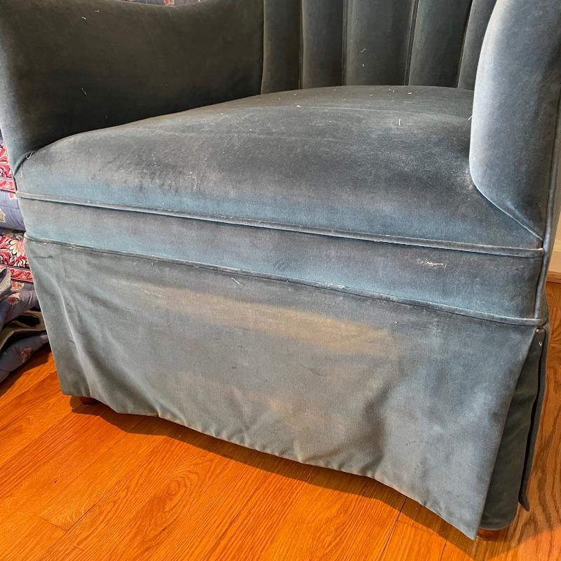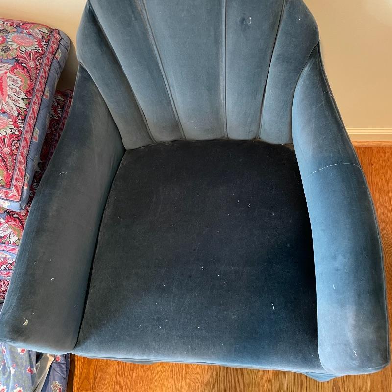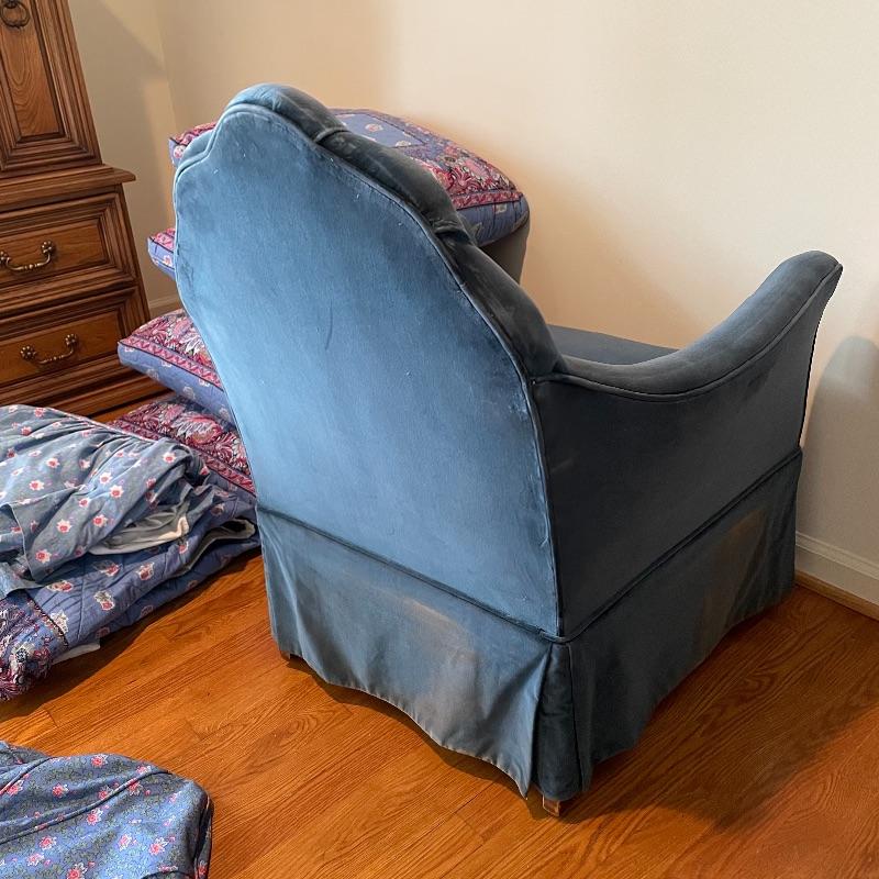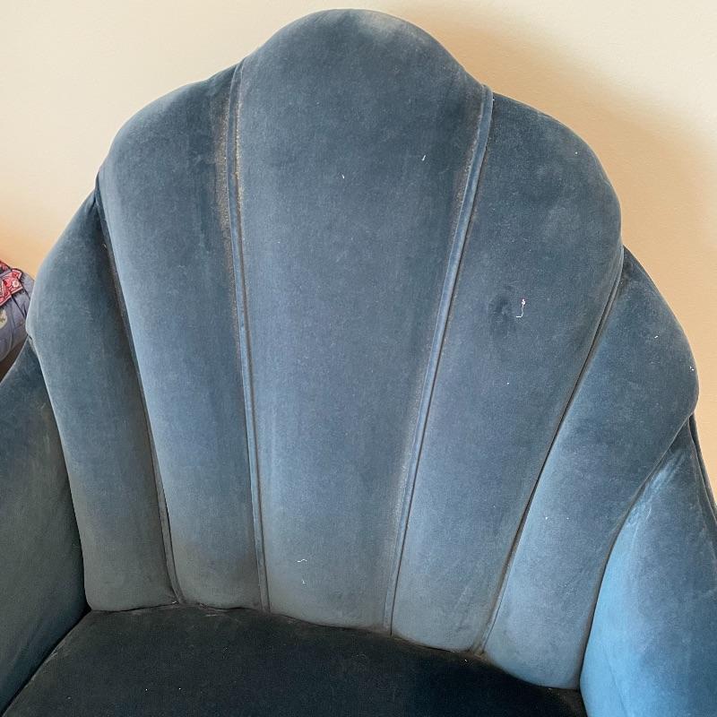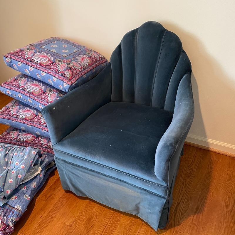 Here’s a sweet vintage find to furnish that extra space in your room! A shell shaped velour like armchair with fitted cover. This lot also features four matching pillows, a queen sized bedskirt and a bed spread measuring about 92” x 94”. The chair measures approximately 27” x 29” x 34” with the seat height at 17”. There is what appears to be fading on the chairs “skirt”, but underneath you will find some handsome carved legs. See photos. Local pick up only.