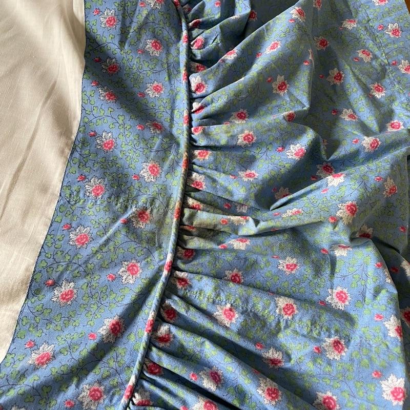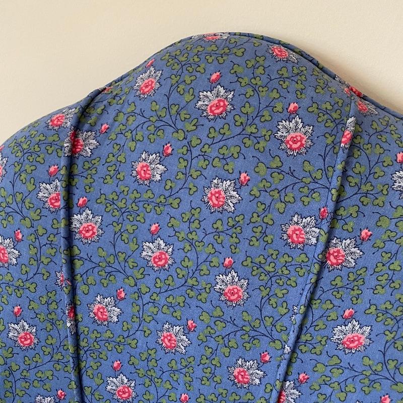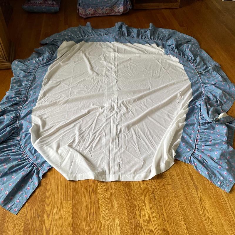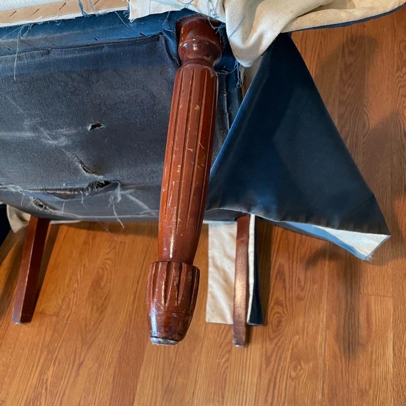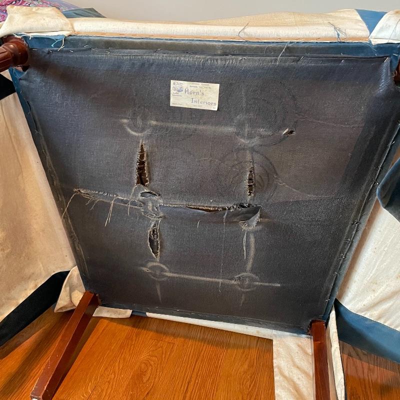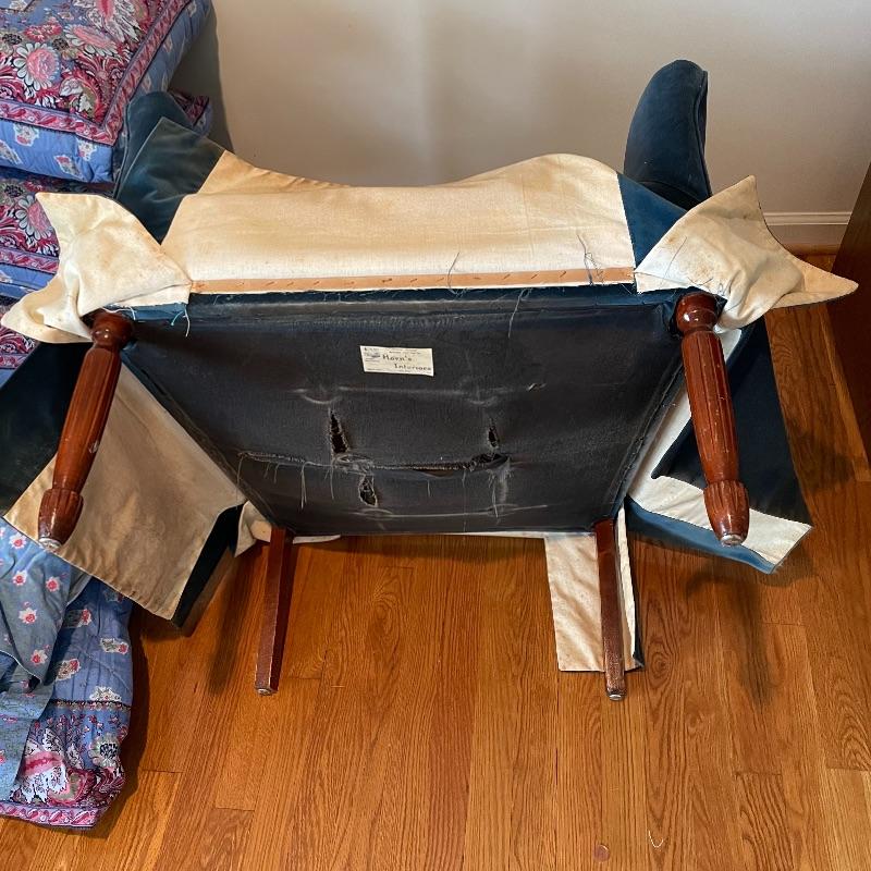 Here’s a sweet vintage find to furnish that extra space in your room! A shell shaped velour like armchair with fitted cover. This lot also features four matching pillows, a queen sized bedskirt and a bed spread measuring about 92” x 94”. The chair measures approximately 27” x 29” x 34” with the seat height at 17”. There is what appears to be fading on the chairs “skirt”, but underneath you will find some handsome carved legs. See photos. Local pick up only.