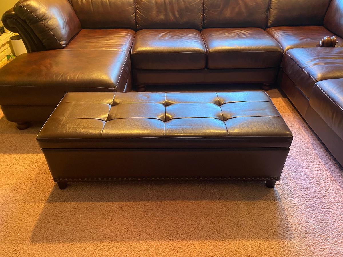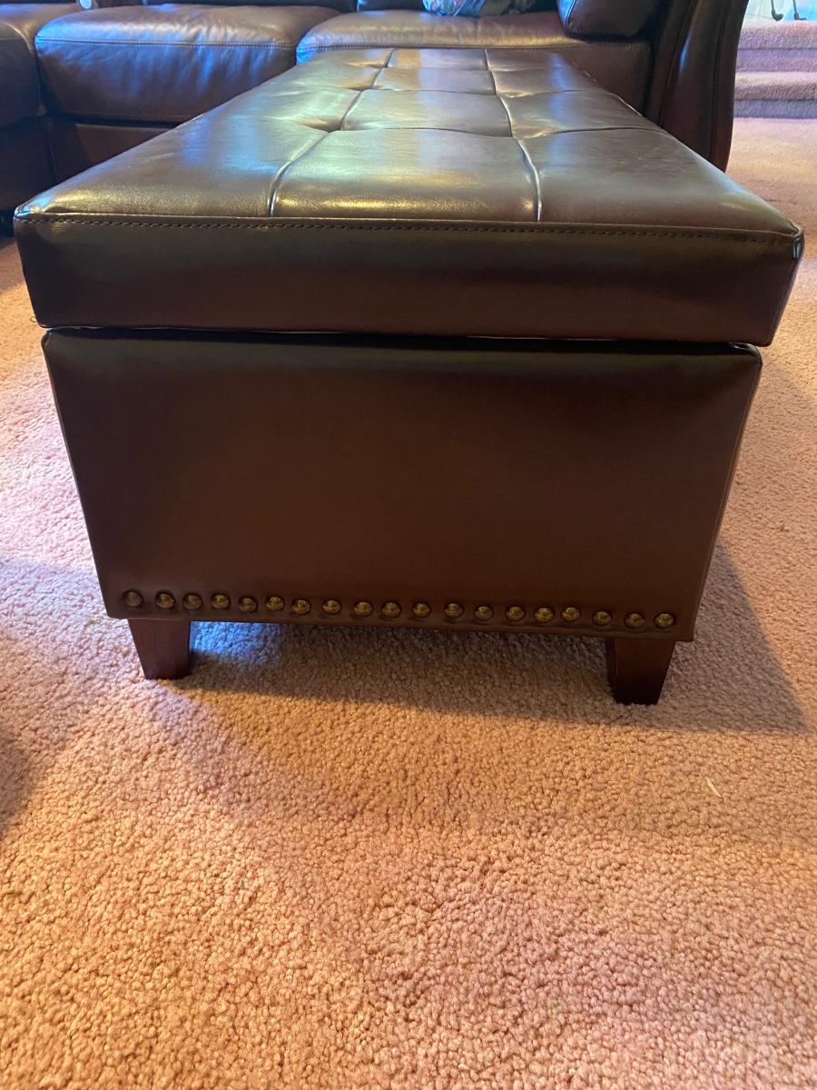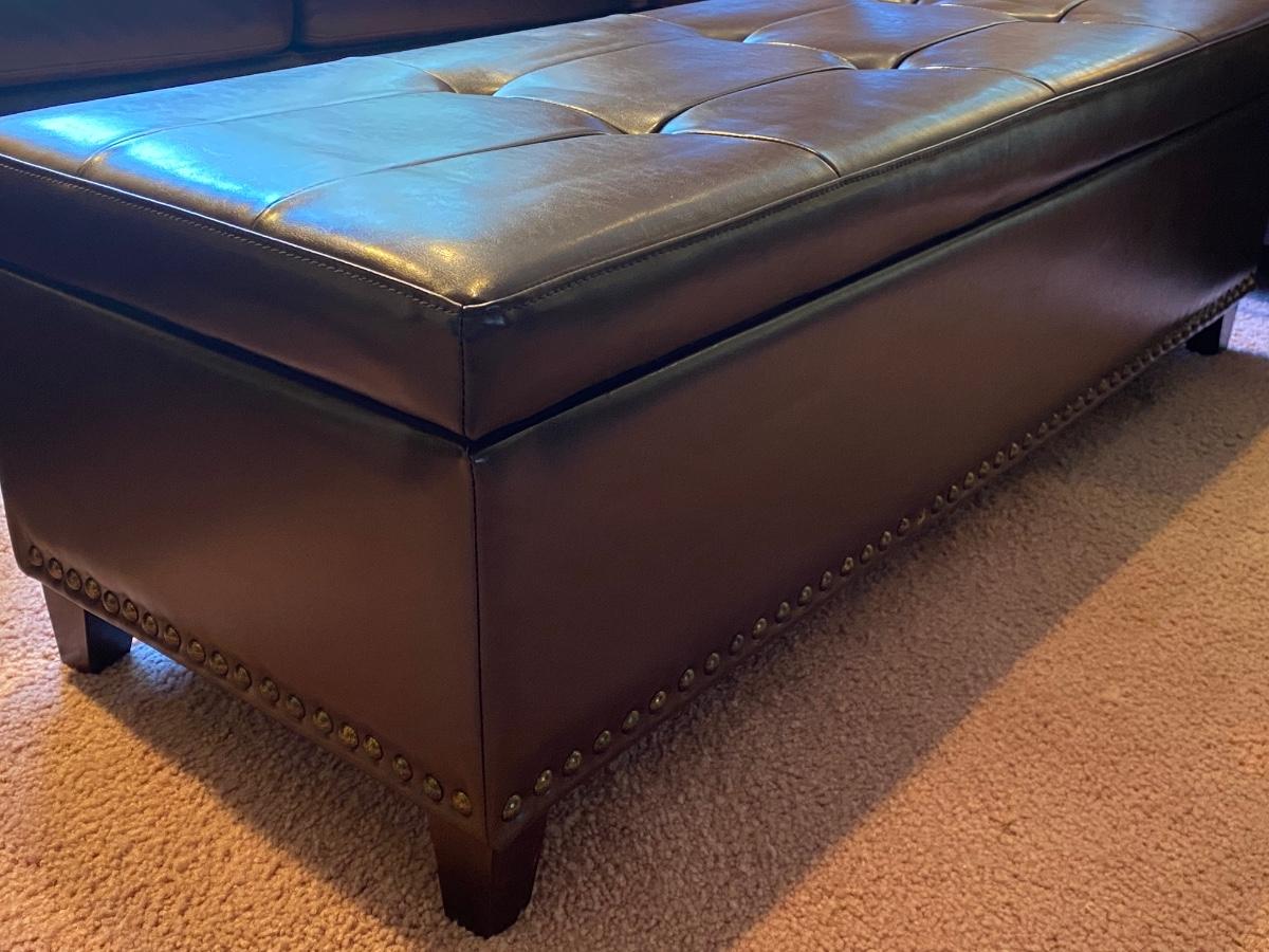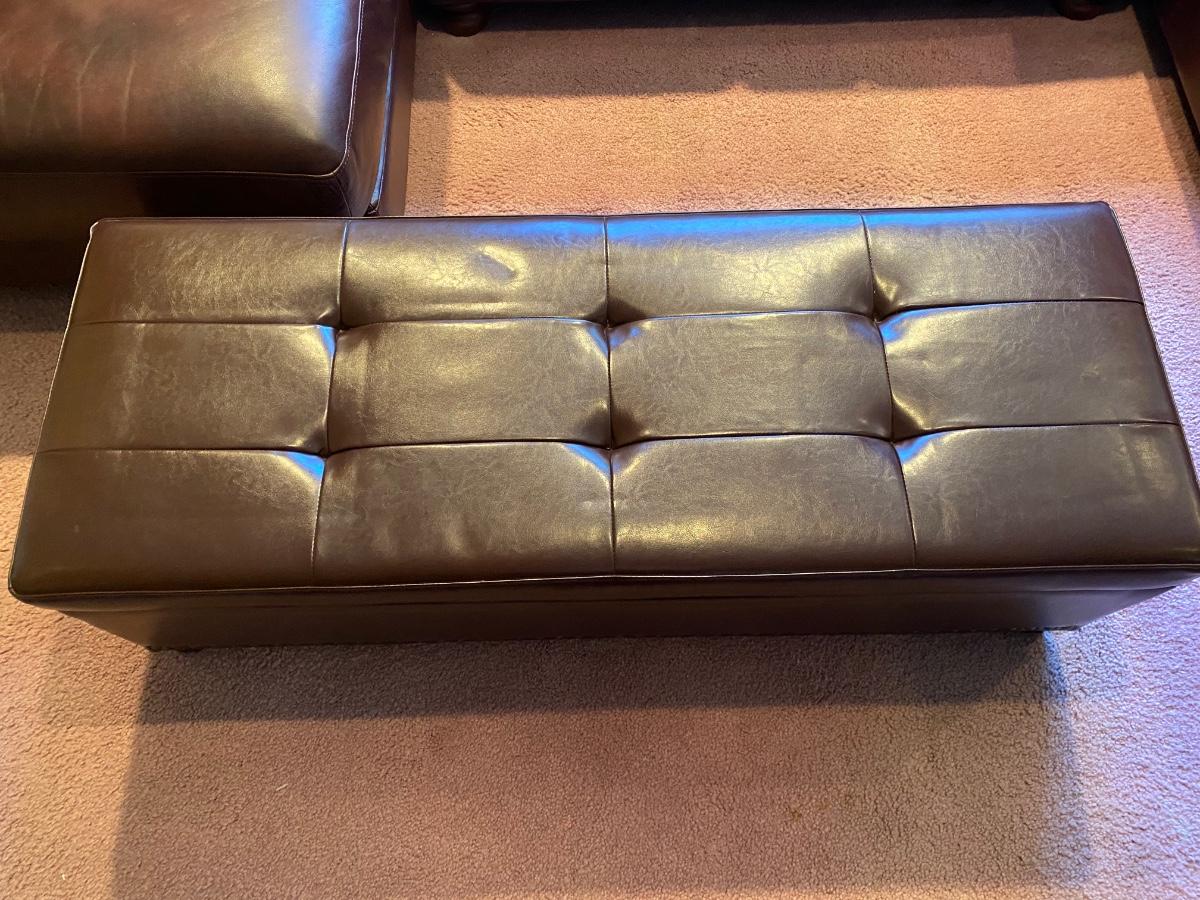Brown leather styled storage Ottoman. Overall dimensions 50”x19” in size.
