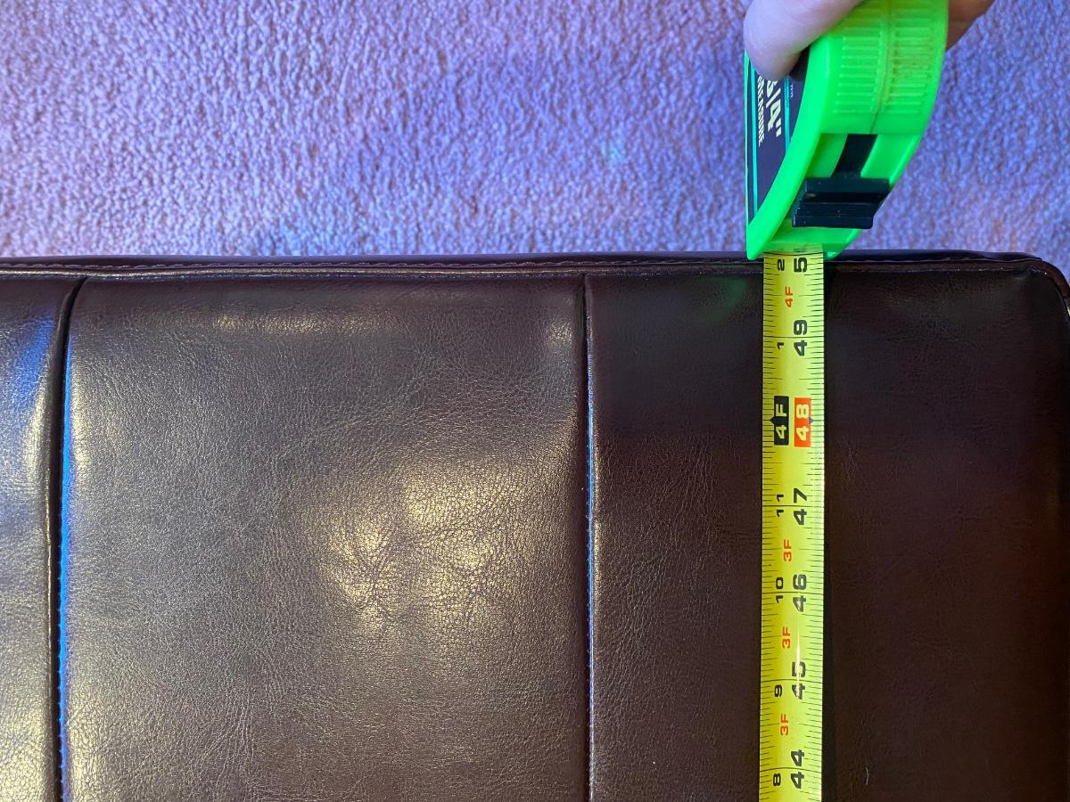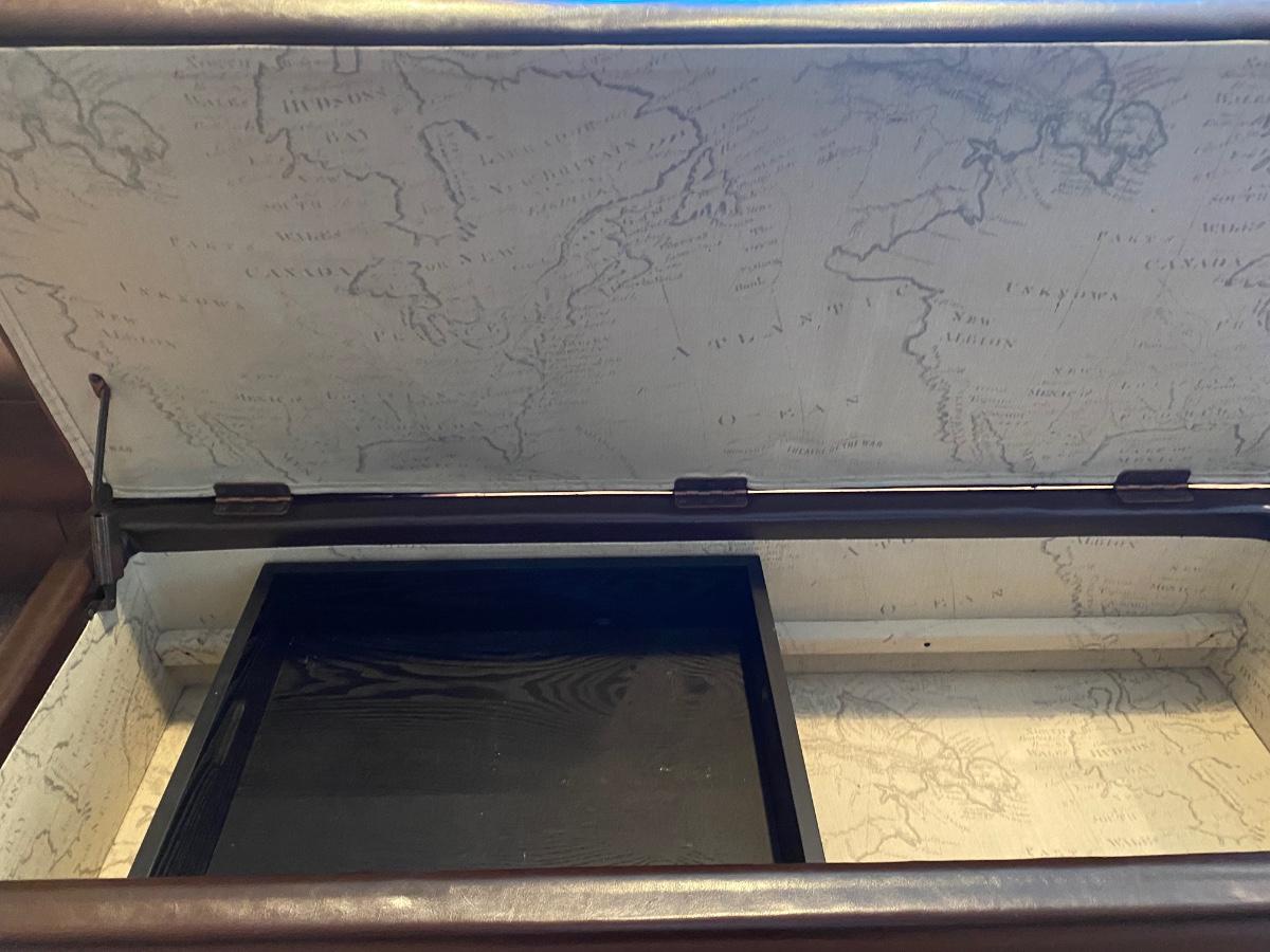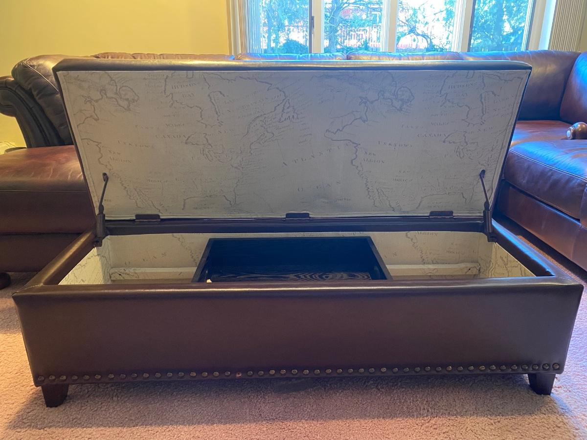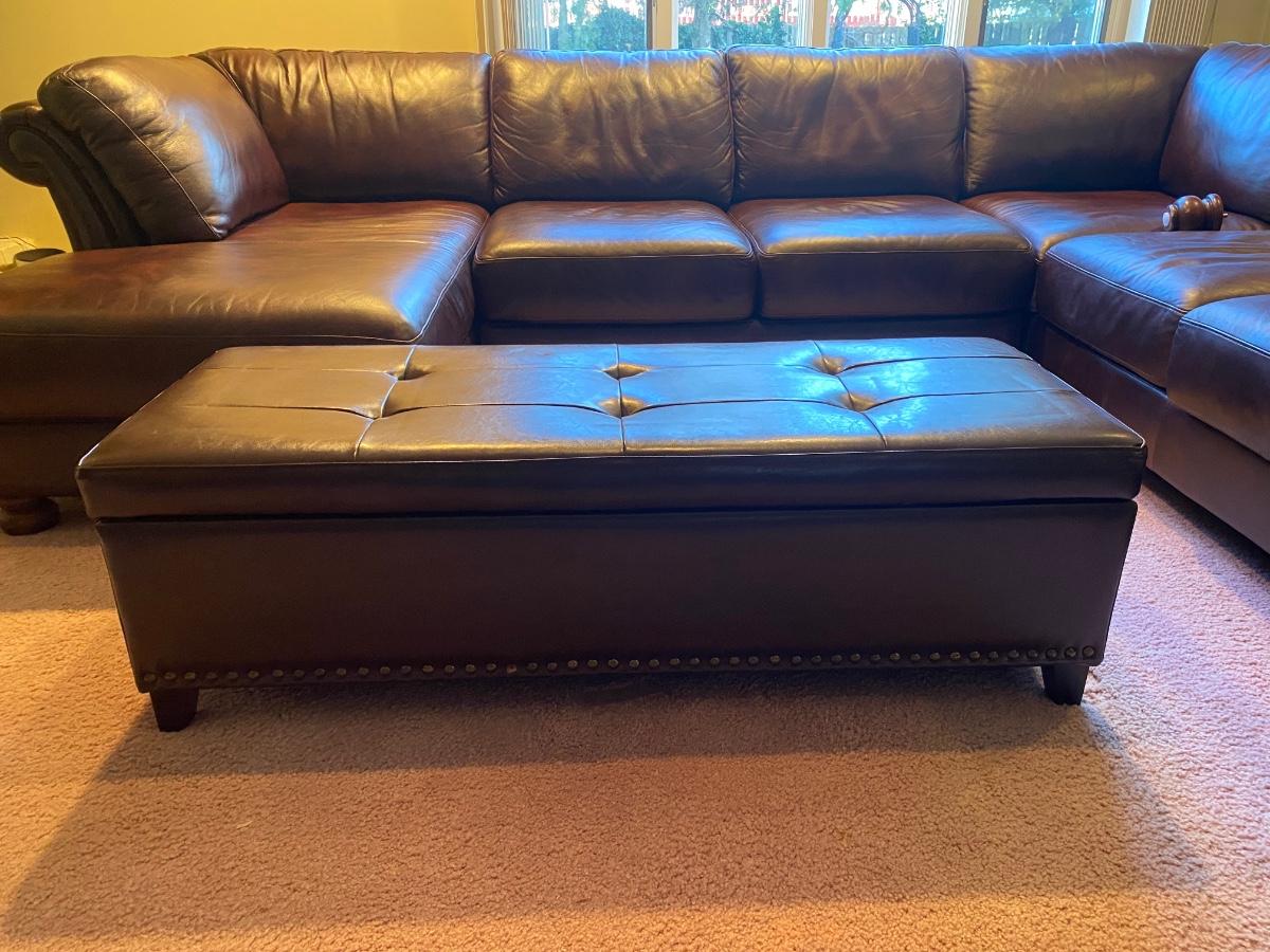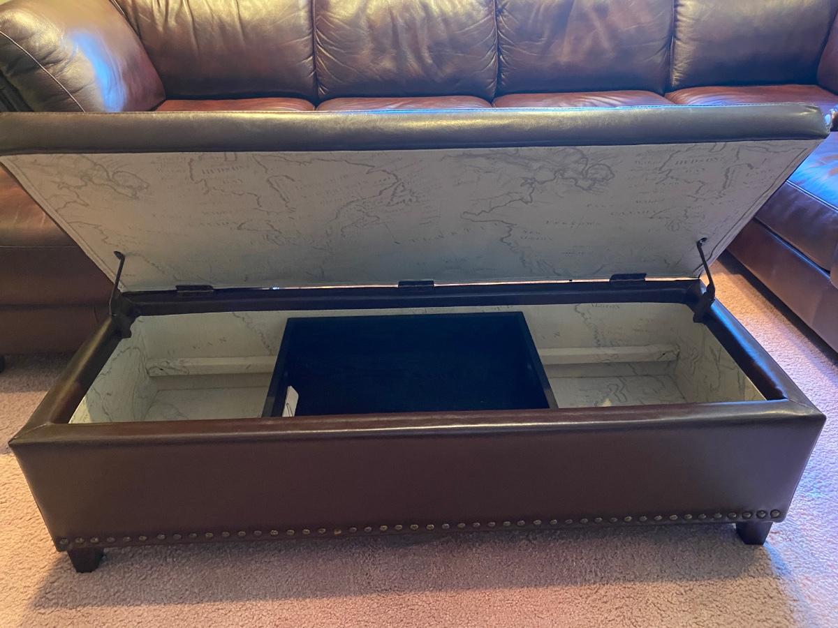 Brown leather styled storage Ottoman. Overall dimensions 50”x19” in size.