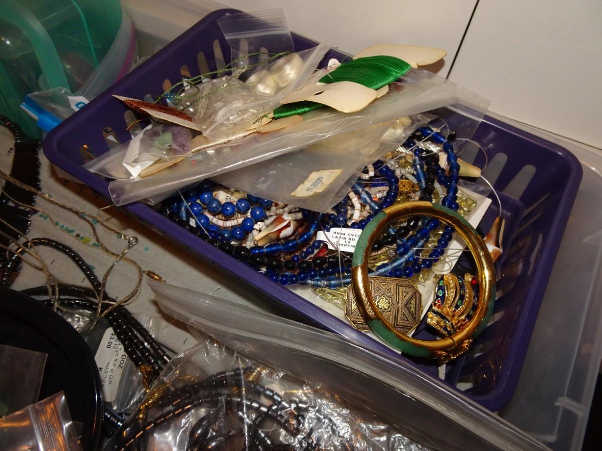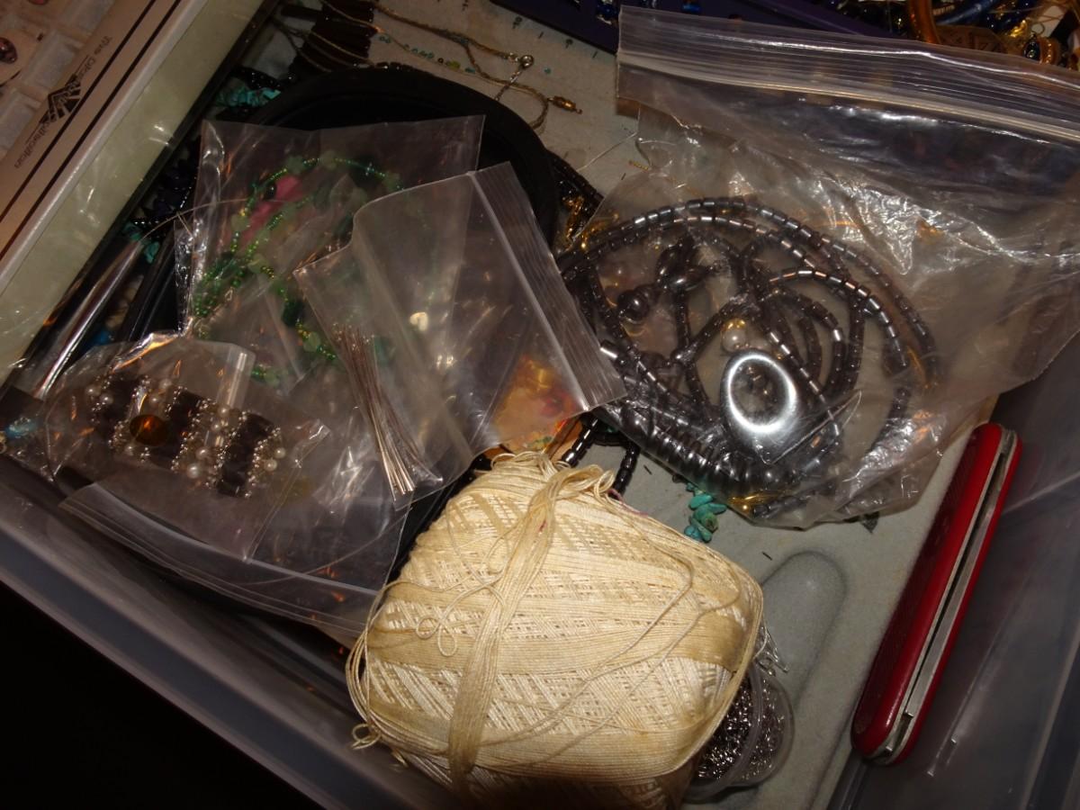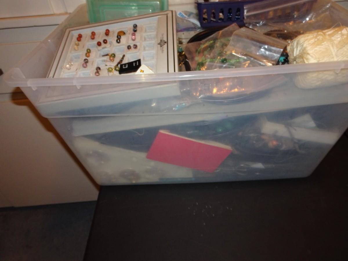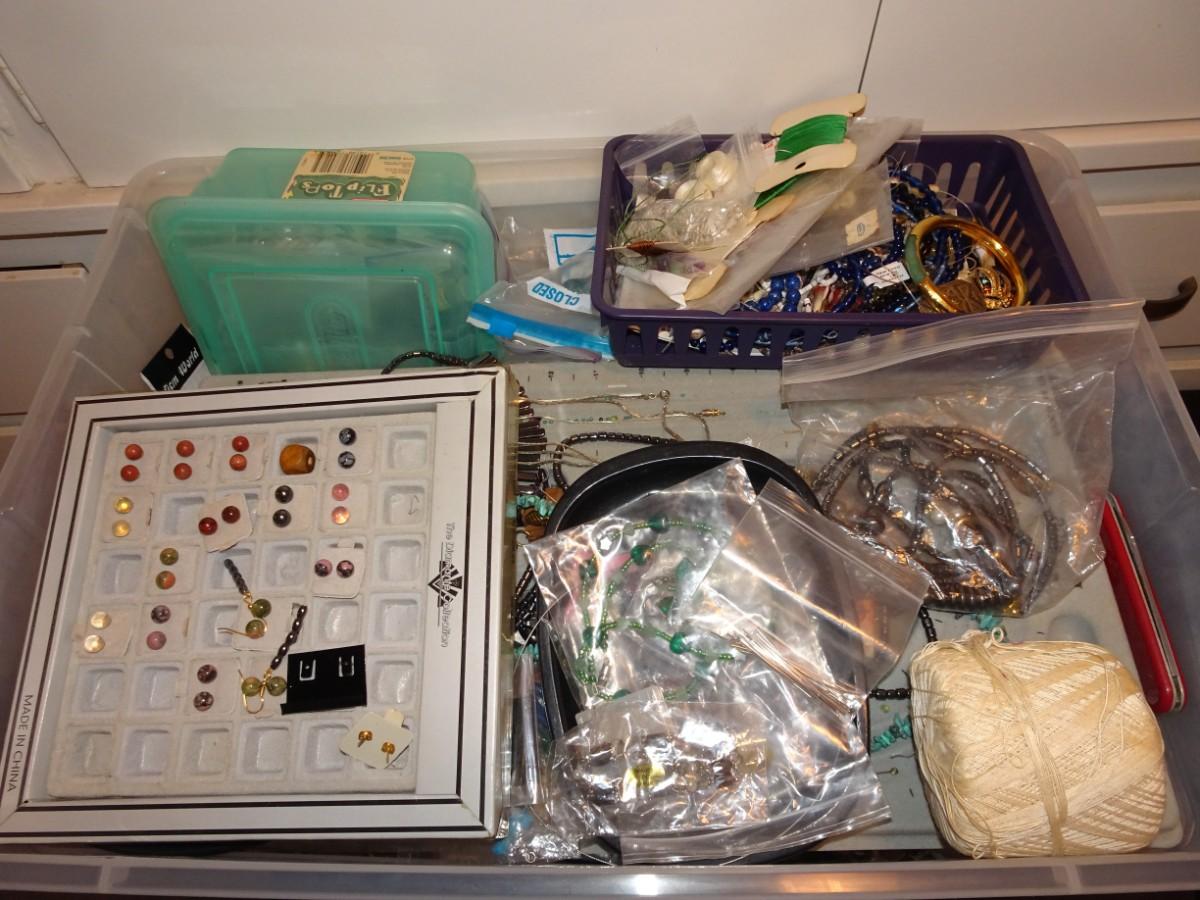 PLASTIC TUB OF JEWELRY MAKING ITEMS AND SOME COSTUME JEWELRY