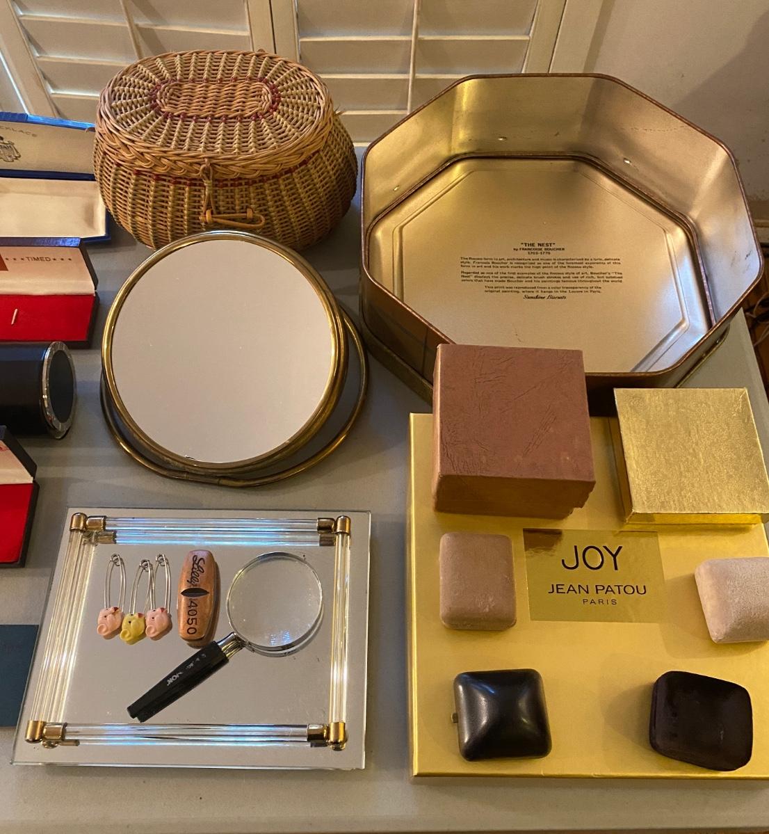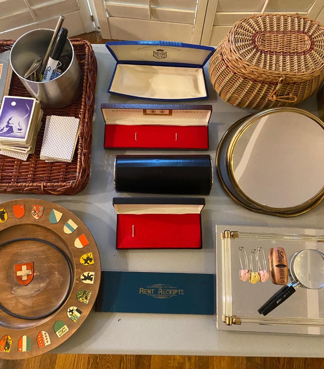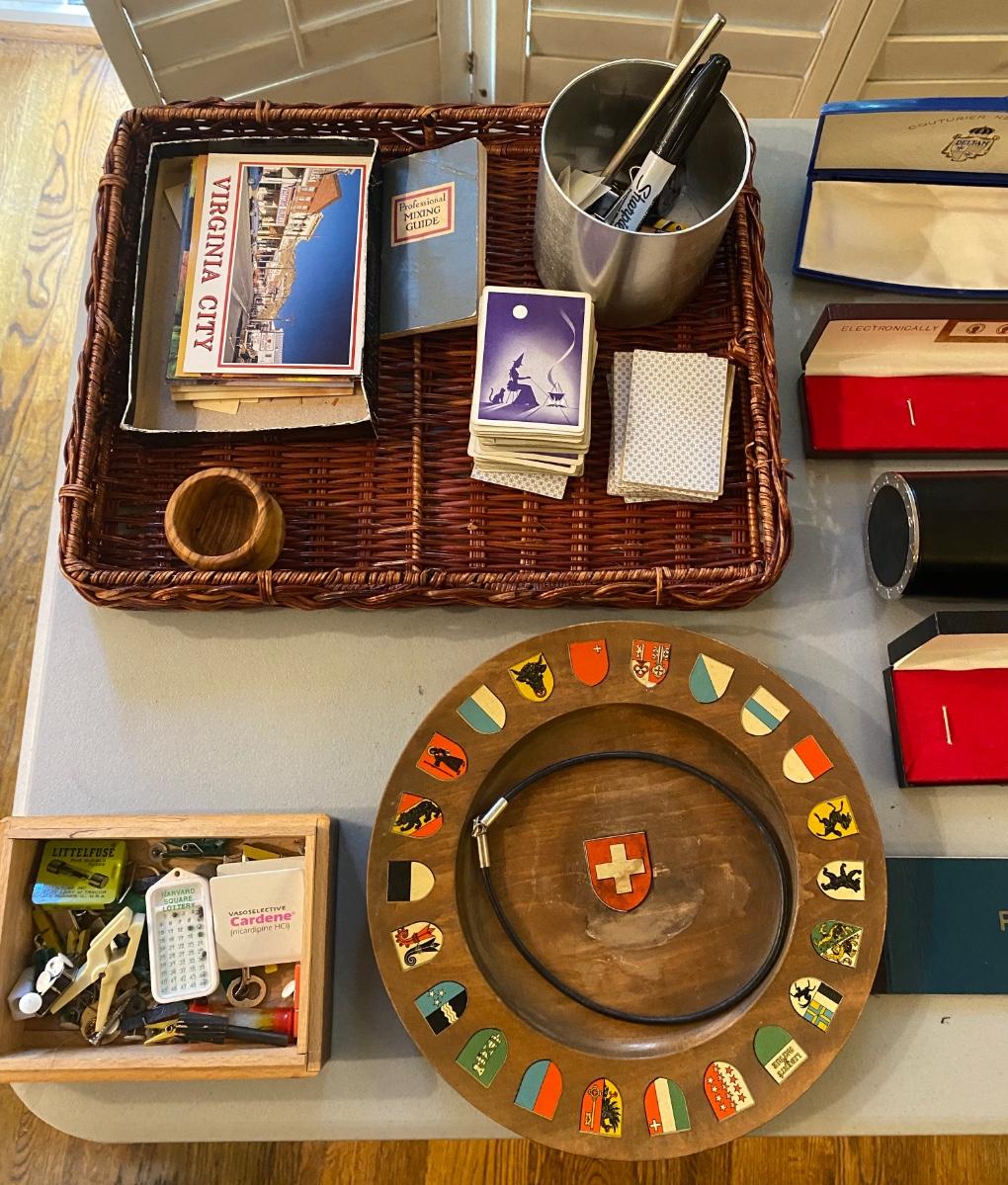 table mirror, Wicker tray 12.5 x 15, tins, Mirror tray 9 x 7 Swiss wooden plate 11”