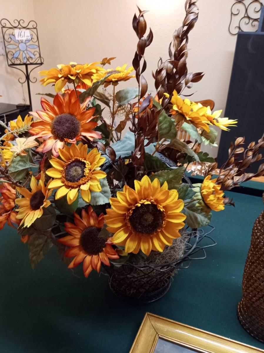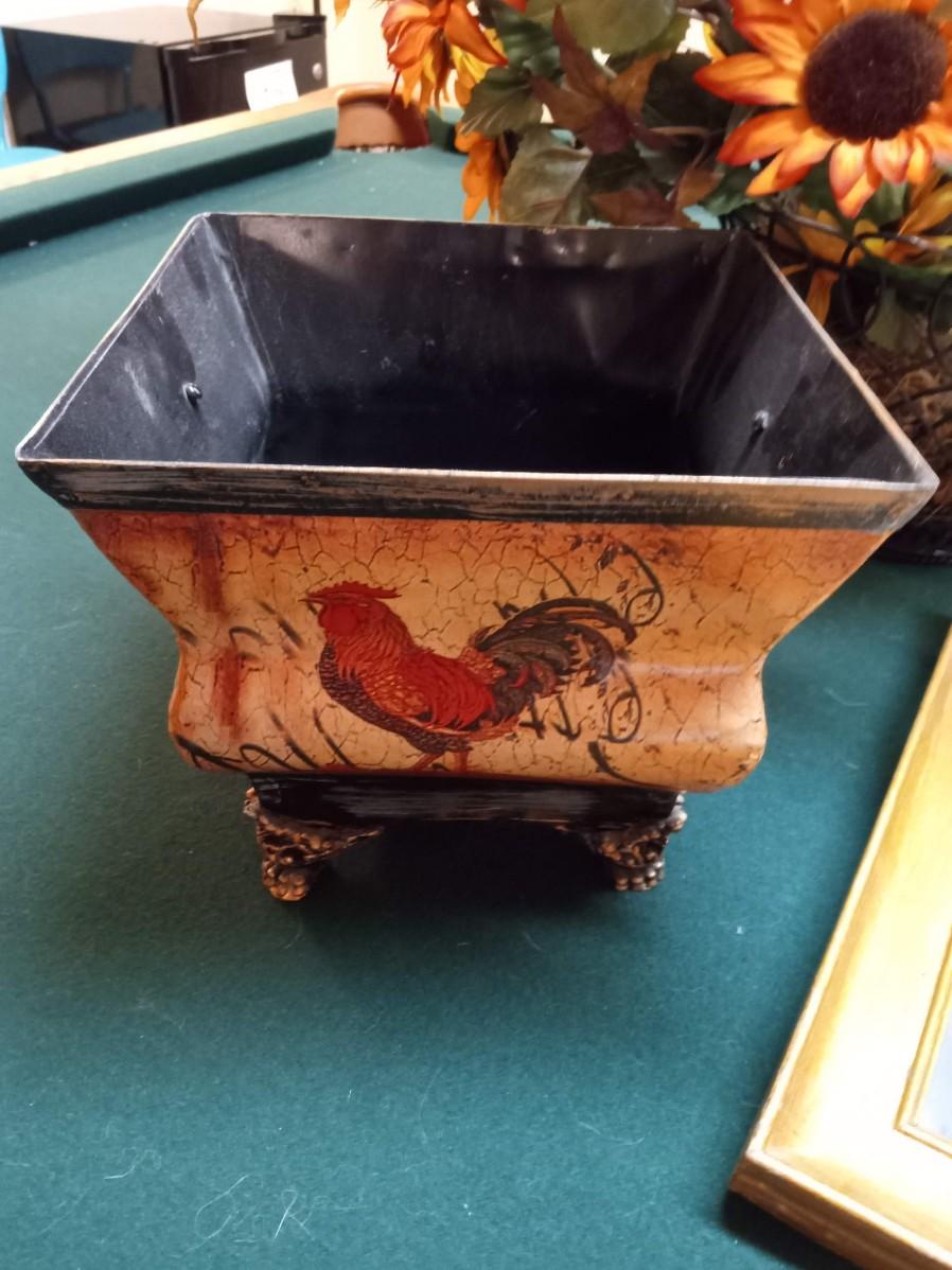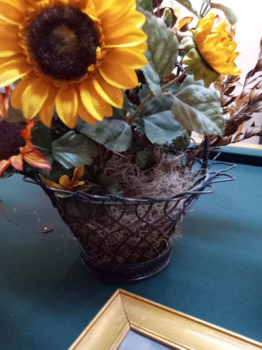 METAL ROOSTER BASKET, BEADED CANDLE HURRICANE, BAMBOO? CANDLE HOLDER, BOUQUET OF SUNFLOWERS IN A METAL BASKET
