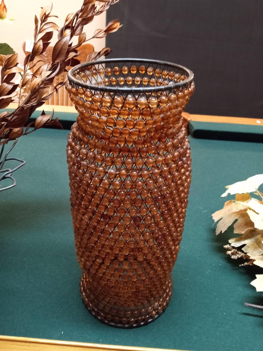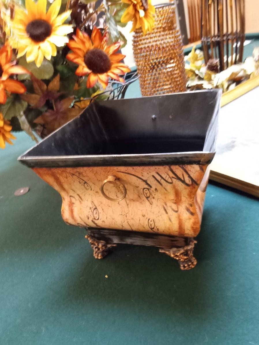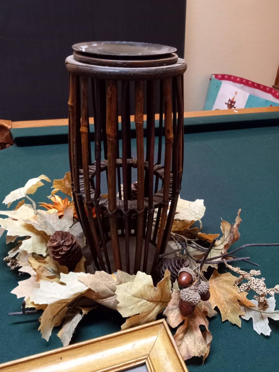 METAL ROOSTER BASKET, BEADED CANDLE HURRICANE, BAMBOO? CANDLE HOLDER, BOUQUET OF SUNFLOWERS IN A METAL BASKET