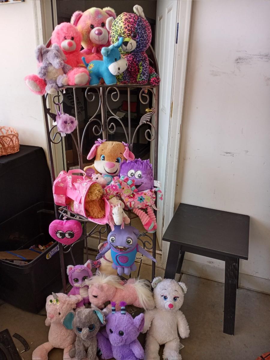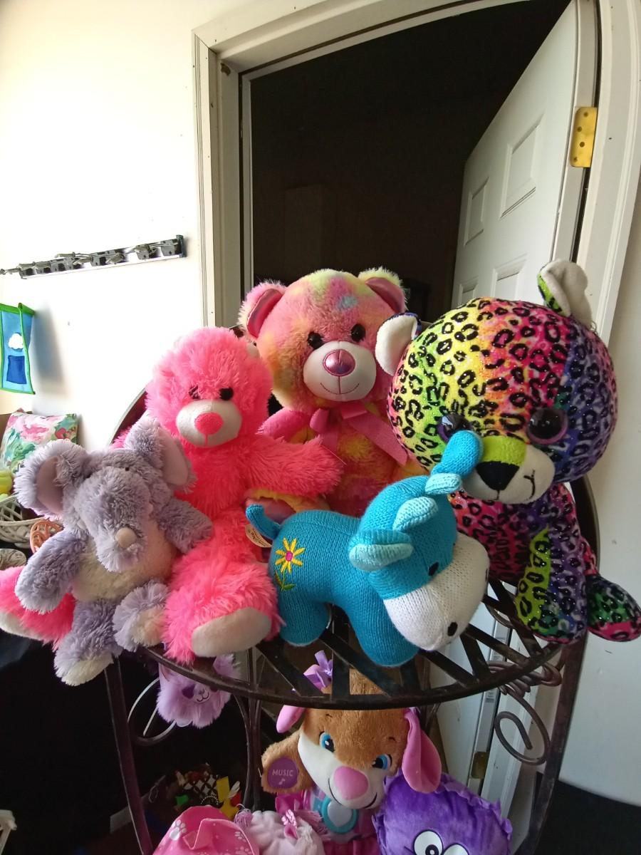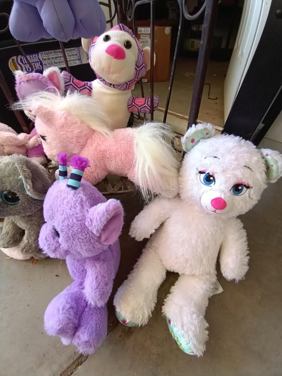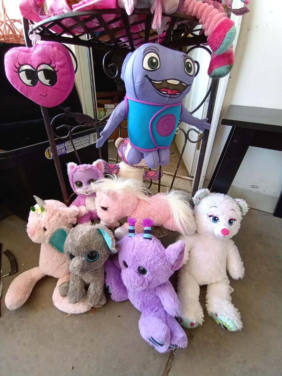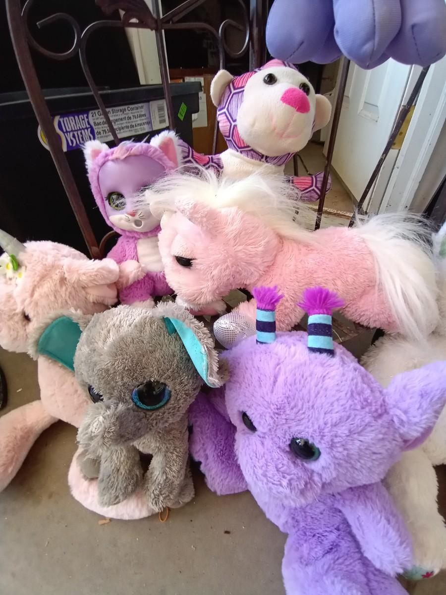 COLORFUL PLUSH ANIMALS-BEARS-LITTLE KITTY IN CARRIER-ELEPHANT-PONY AND MORE