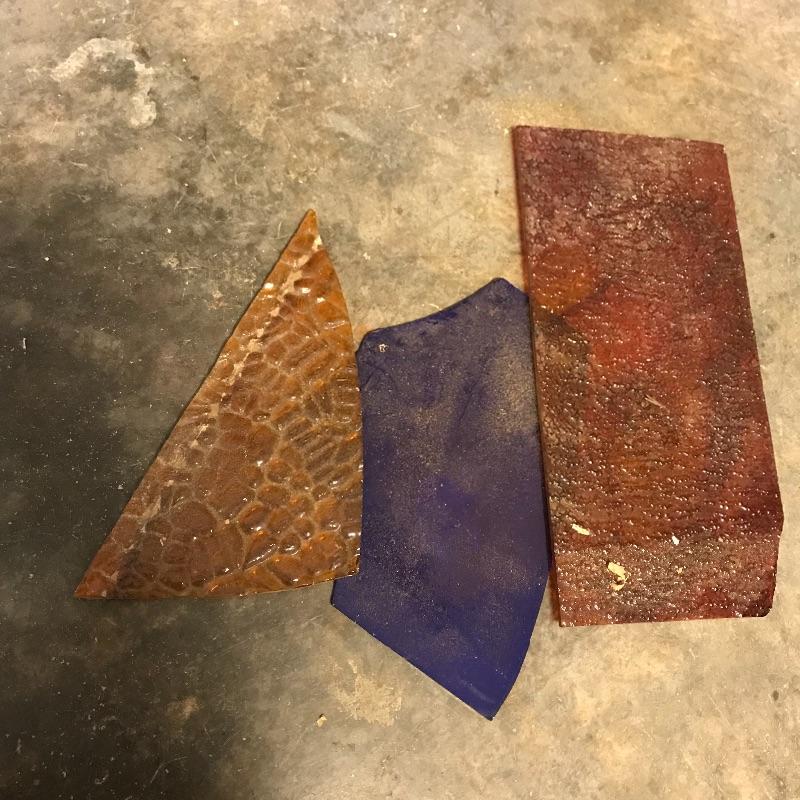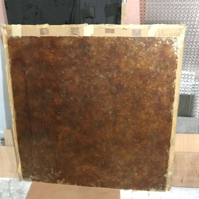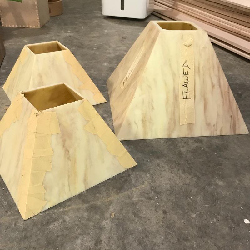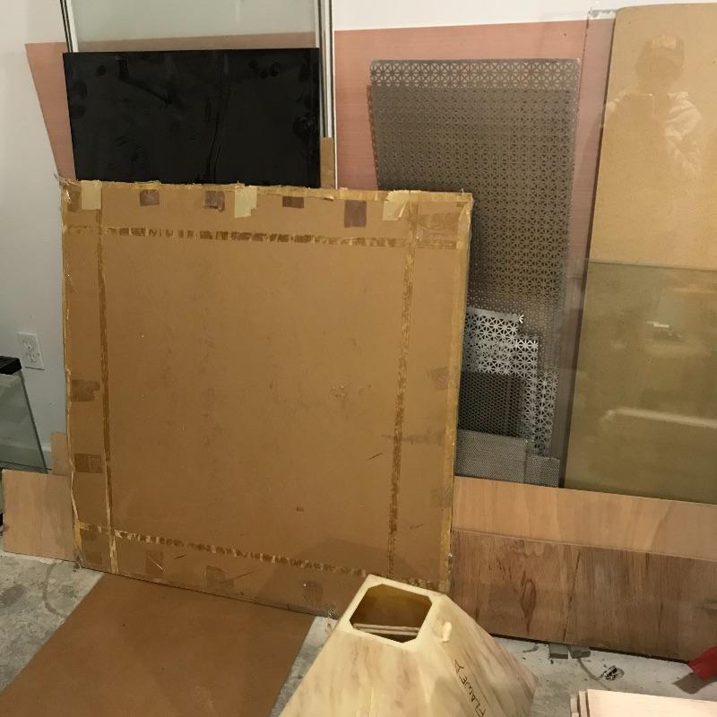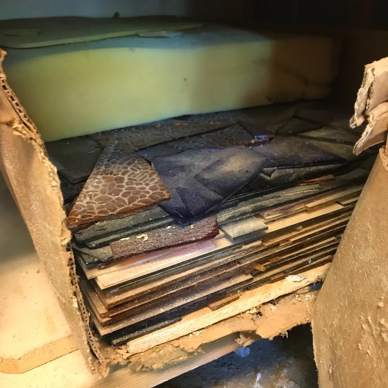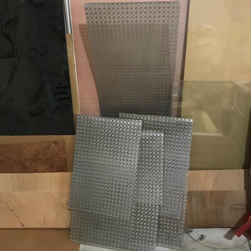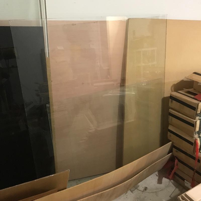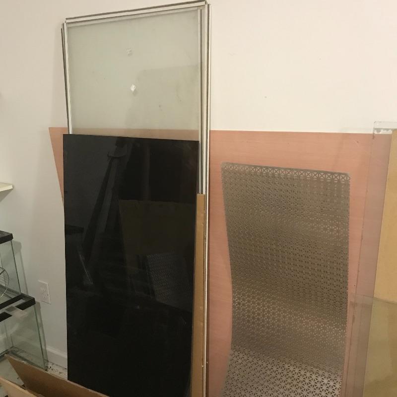 Two amber sheets appear to be mica 36” sq. and have been protected by cardboard sleeve. Metal sheet panels with various patterns and sizes, the largest design is 15.75” x 48” and has four sheets with three of them folded, see photos. Three marbled plastic forms, the largest has an 18” sq base and 6”sq top and 12” height. The large flat salmon colored laminate pictured behind the glass panels is 8’ x 4’. Two large boxes of laminate sheets are 50” tall. Various laminate panels and rolls inside. Last shown in photos is a box half full of decorative glass ideal for mosaic or stained glass art. Box measures approximately 34” x 22” x 10”. See photos. No shipping.