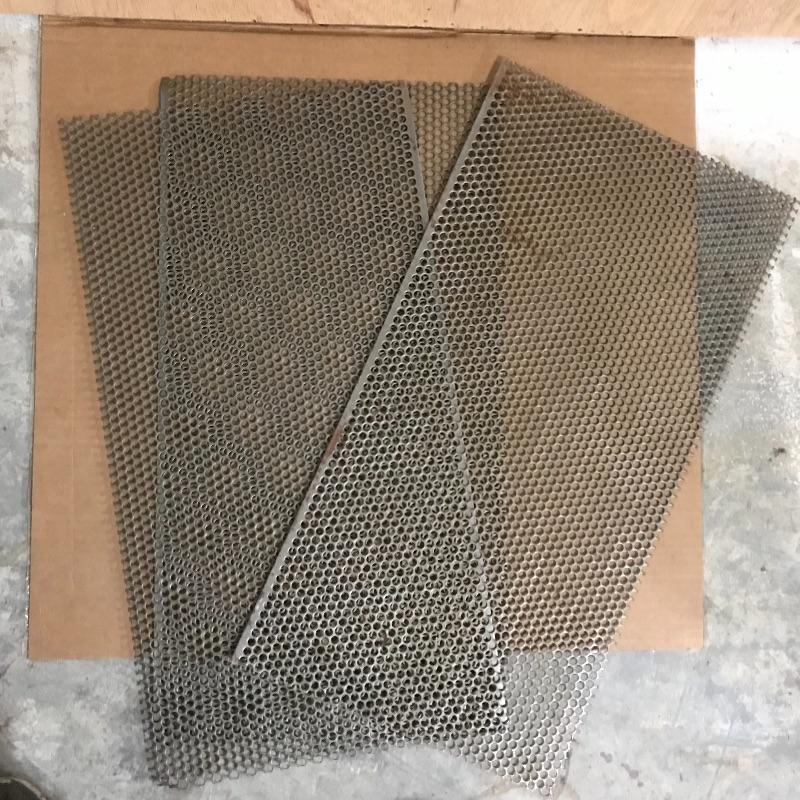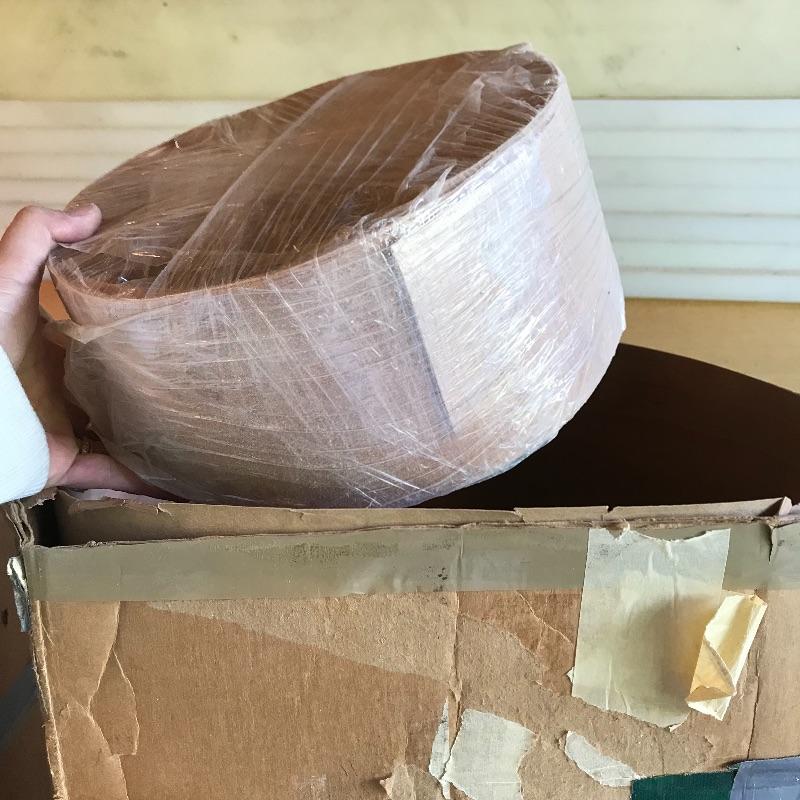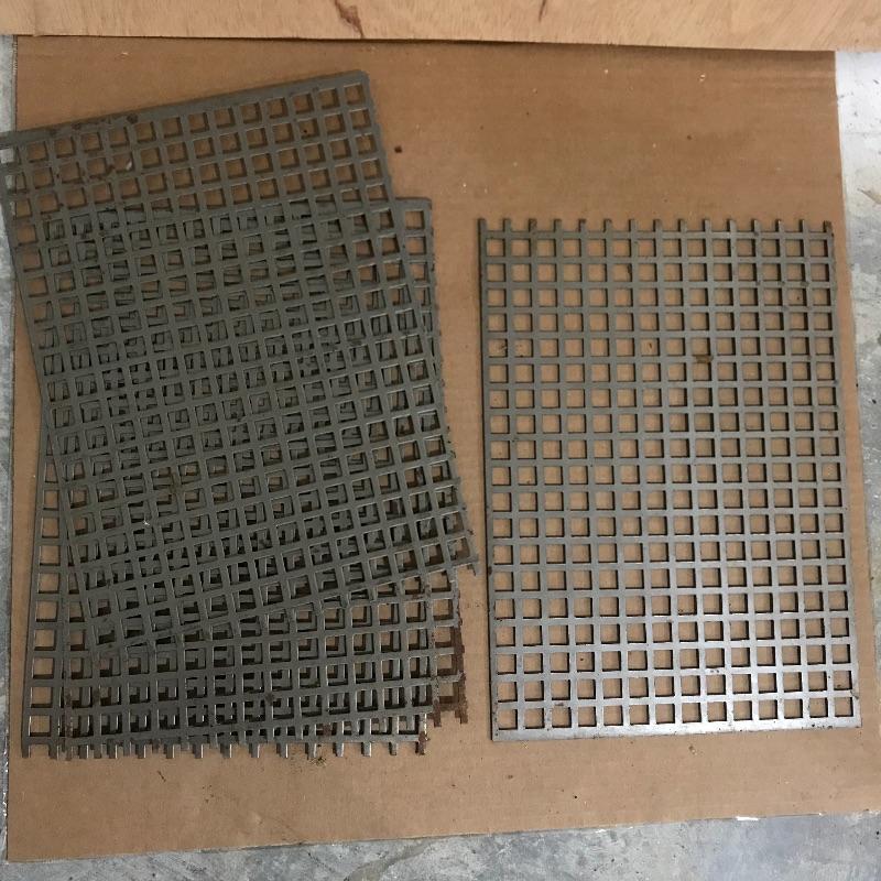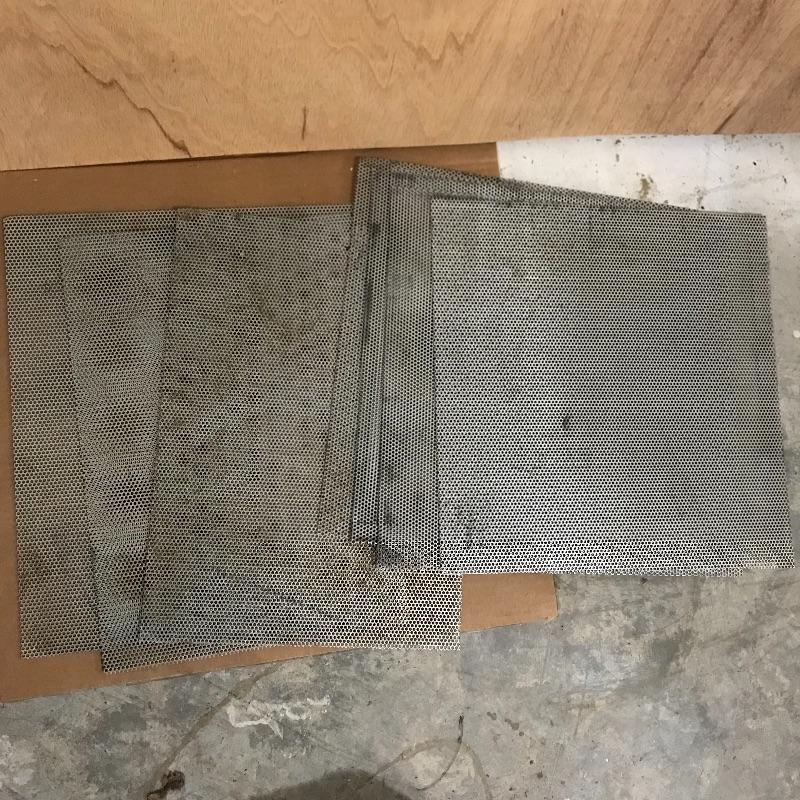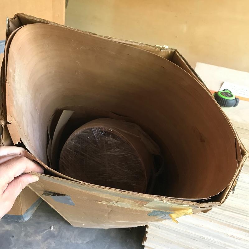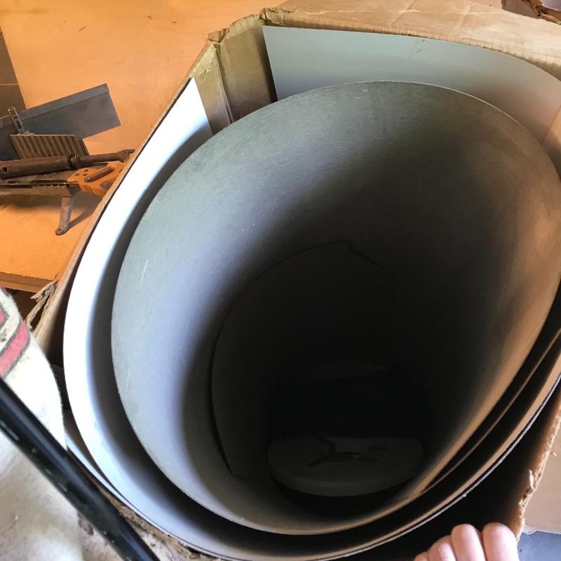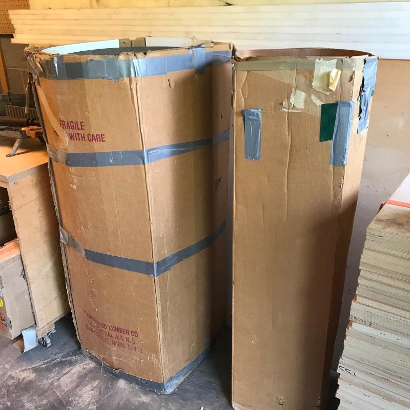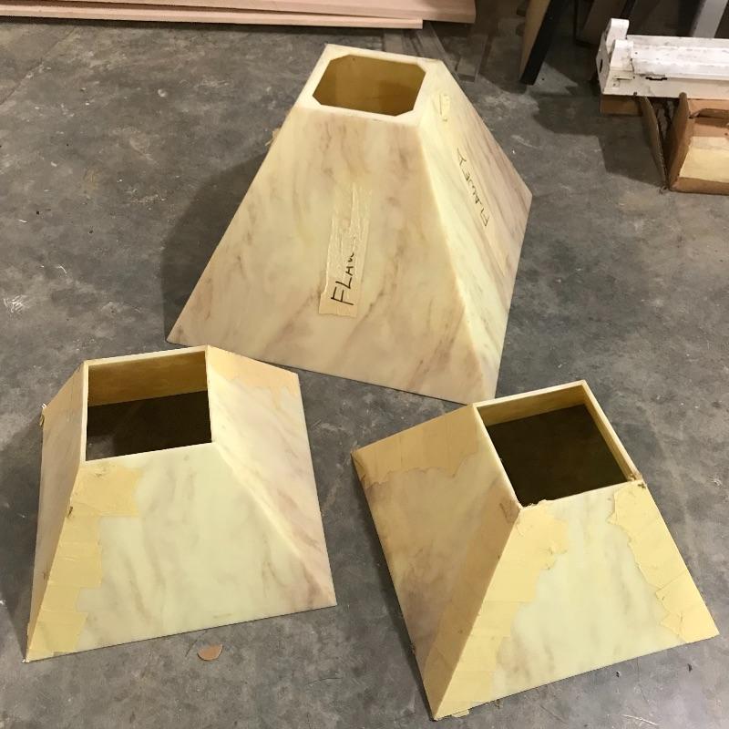 Two amber sheets appear to be mica 36” sq. and have been protected by cardboard sleeve. Metal sheet panels with various patterns and sizes, the largest design is 15.75” x 48” and has four sheets with three of them folded, see photos. Three marbled plastic forms, the largest has an 18” sq base and 6”sq top and 12” height. The large flat salmon colored laminate pictured behind the glass panels is 8’ x 4’. Two large boxes of laminate sheets are 50” tall. Various laminate panels and rolls inside. Last shown in photos is a box half full of decorative glass ideal for mosaic or stained glass art. Box measures approximately 34” x 22” x 10”. See photos. No shipping.