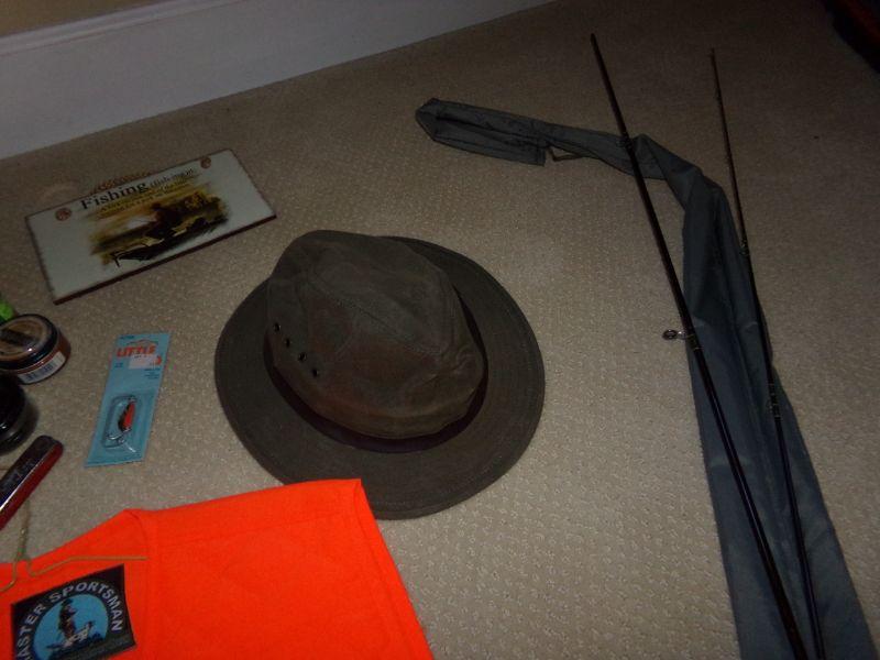 MASTER SPORTSMAN SIZE LARGE FISHING VEST. FISHING POLE WITH COVER, HELLE FROM NORWAY KNIFE WITH CASE, FISHING HAT