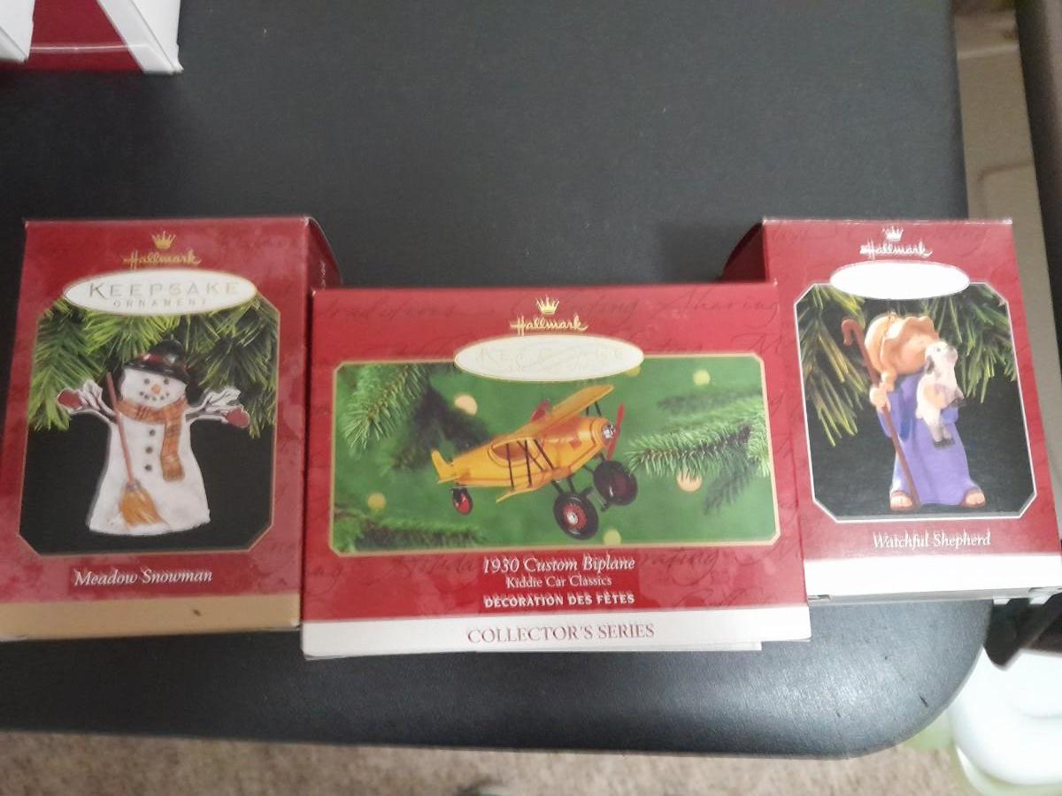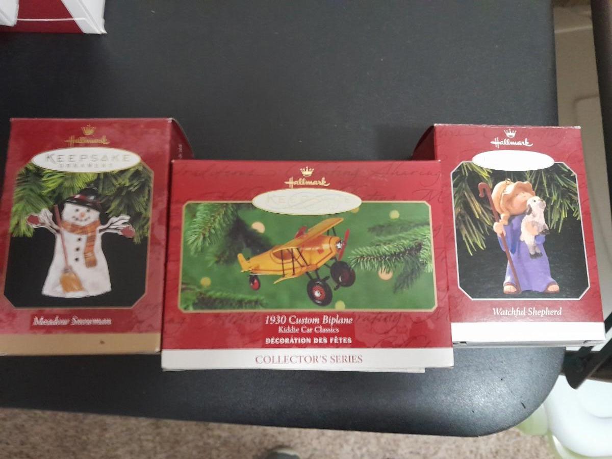 HALLMARK CHRISTMAS ORNAMENTS BIPLANE, SNOWMAN, AND SHEPHERD