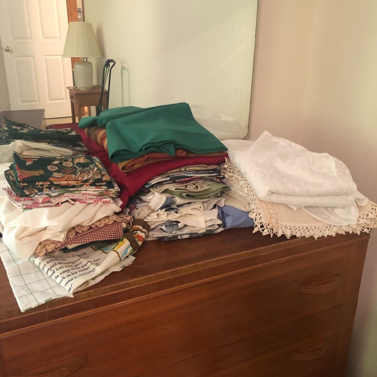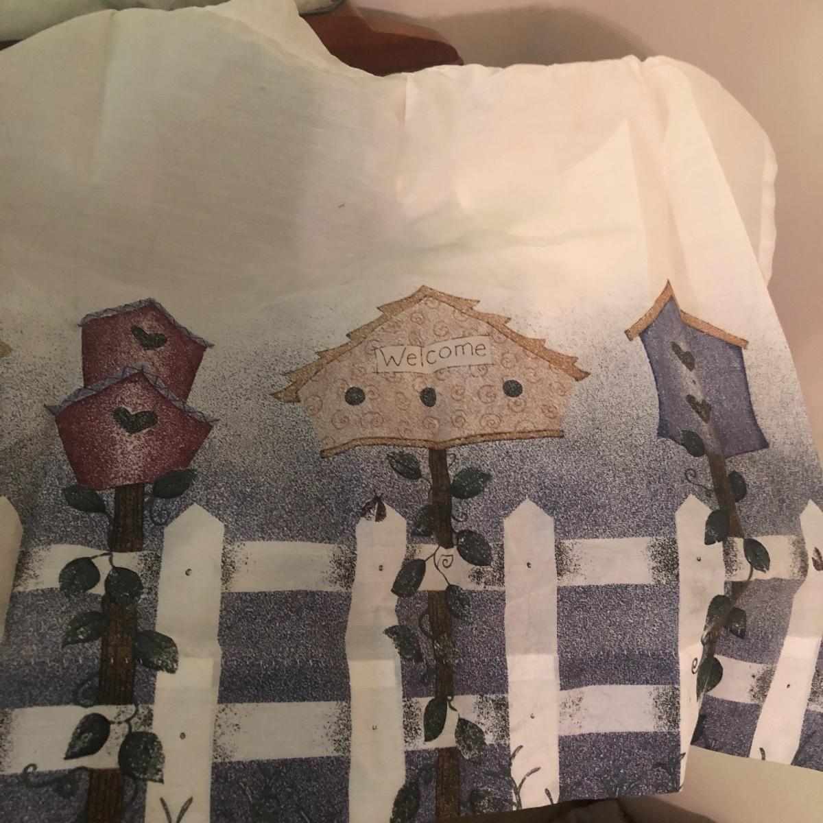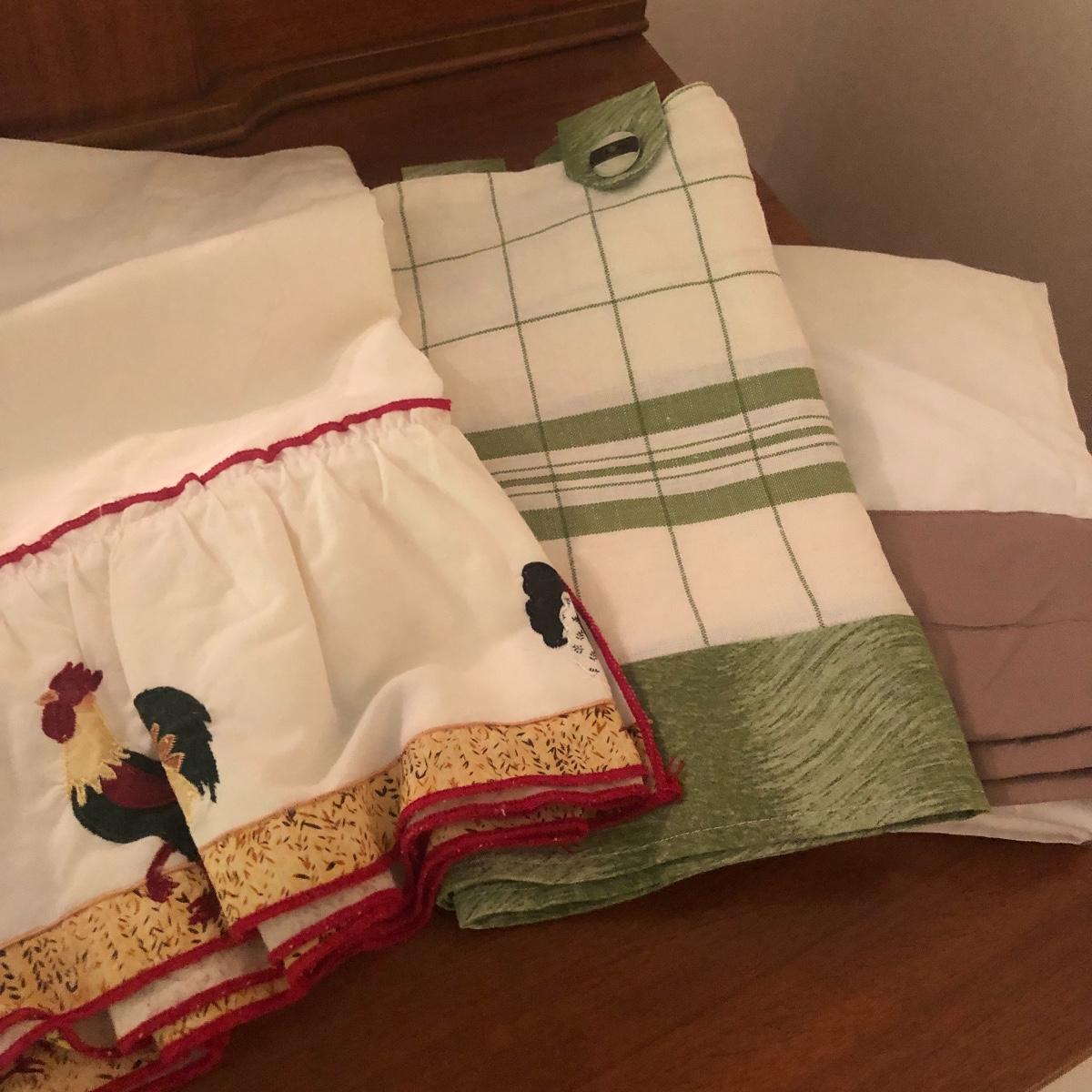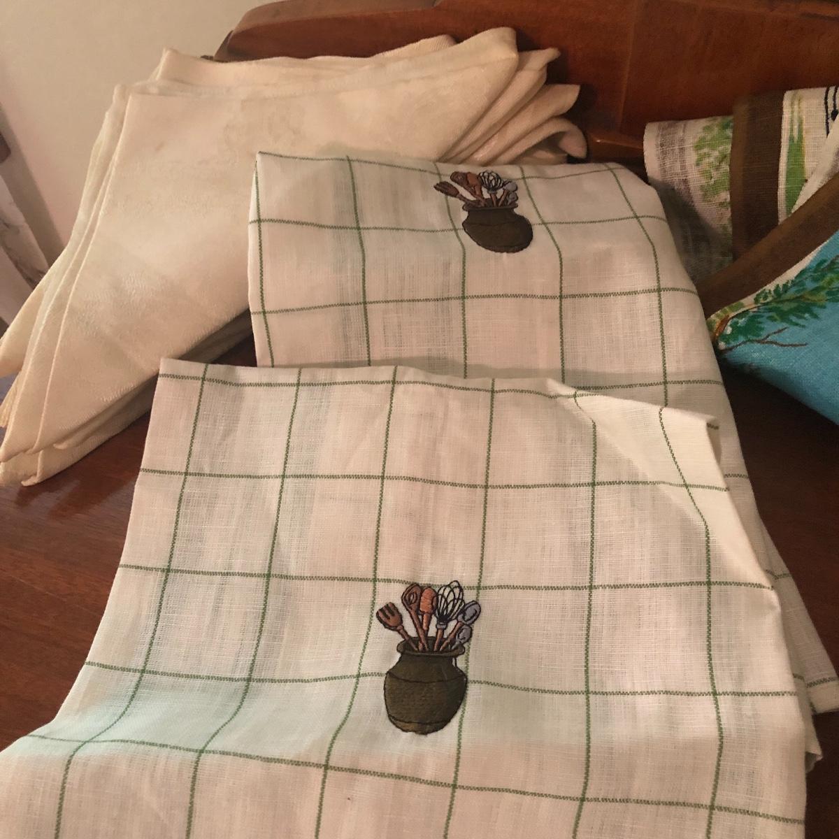 Get a little of everything in this lot. There are about ten tablecloths with one appearing to boast hand-stitched red flowers on it! There is also about nine sets of table napkins, eleven valances (with eight being the bird house motif), hand towels and more. Shipping Available.