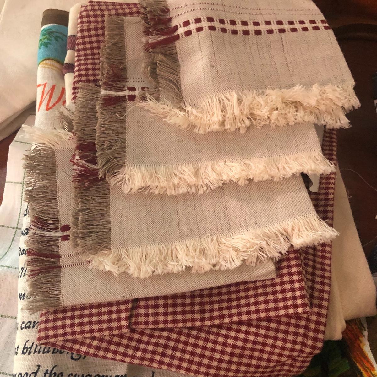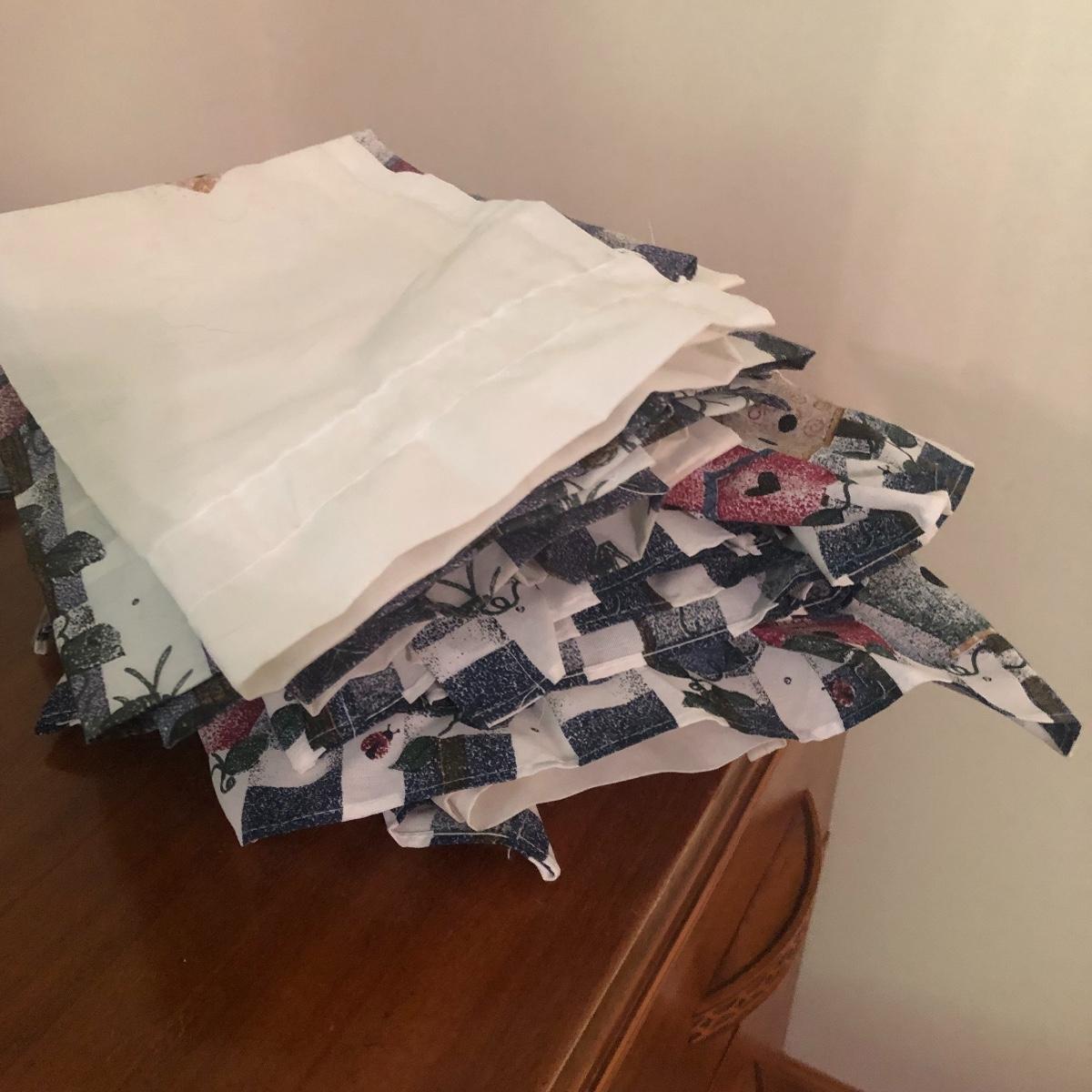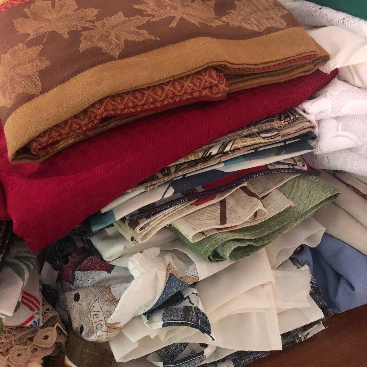 Get a little of everything in this lot. There are about ten tablecloths with one appearing to boast hand-stitched red flowers on it! There is also about nine sets of table napkins, eleven valances (with eight being the bird house motif), hand towels and more. Shipping Available.
