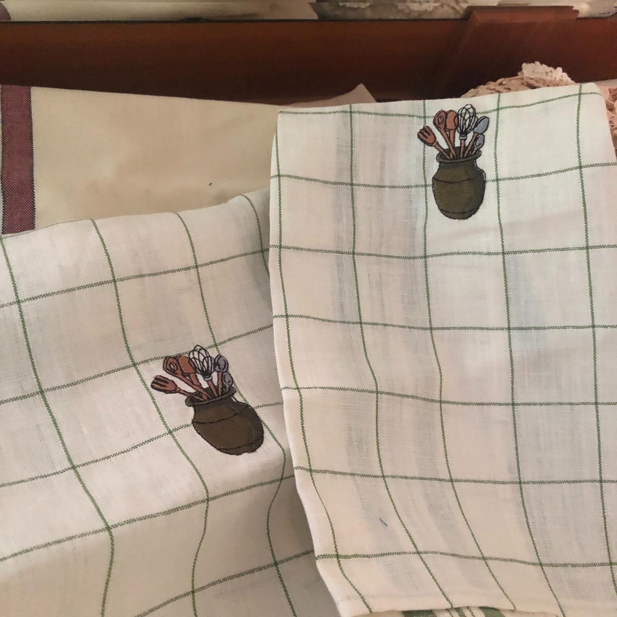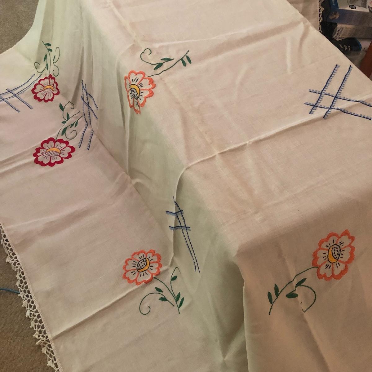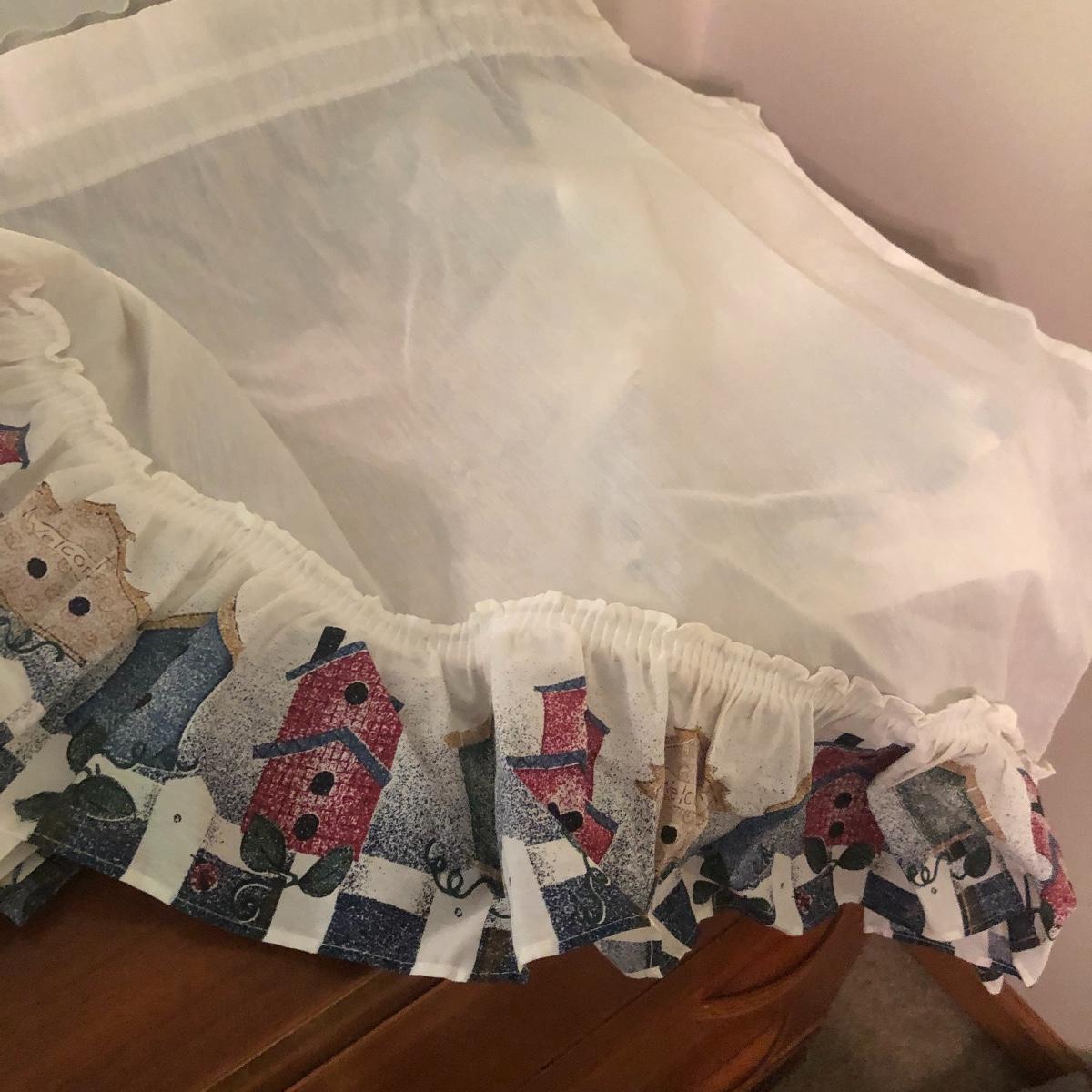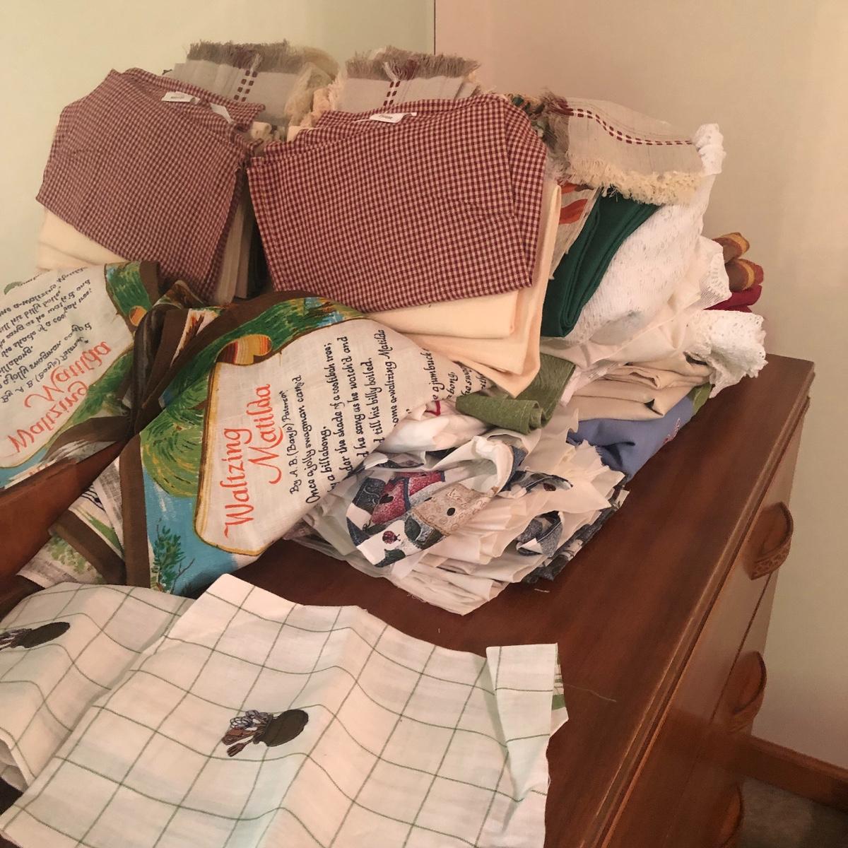 Get a little of everything in this lot. There are about ten tablecloths with one appearing to boast hand-stitched red flowers on it! There is also about nine sets of table napkins, eleven valances (with eight being the bird house motif), hand towels and more. Shipping Available.
