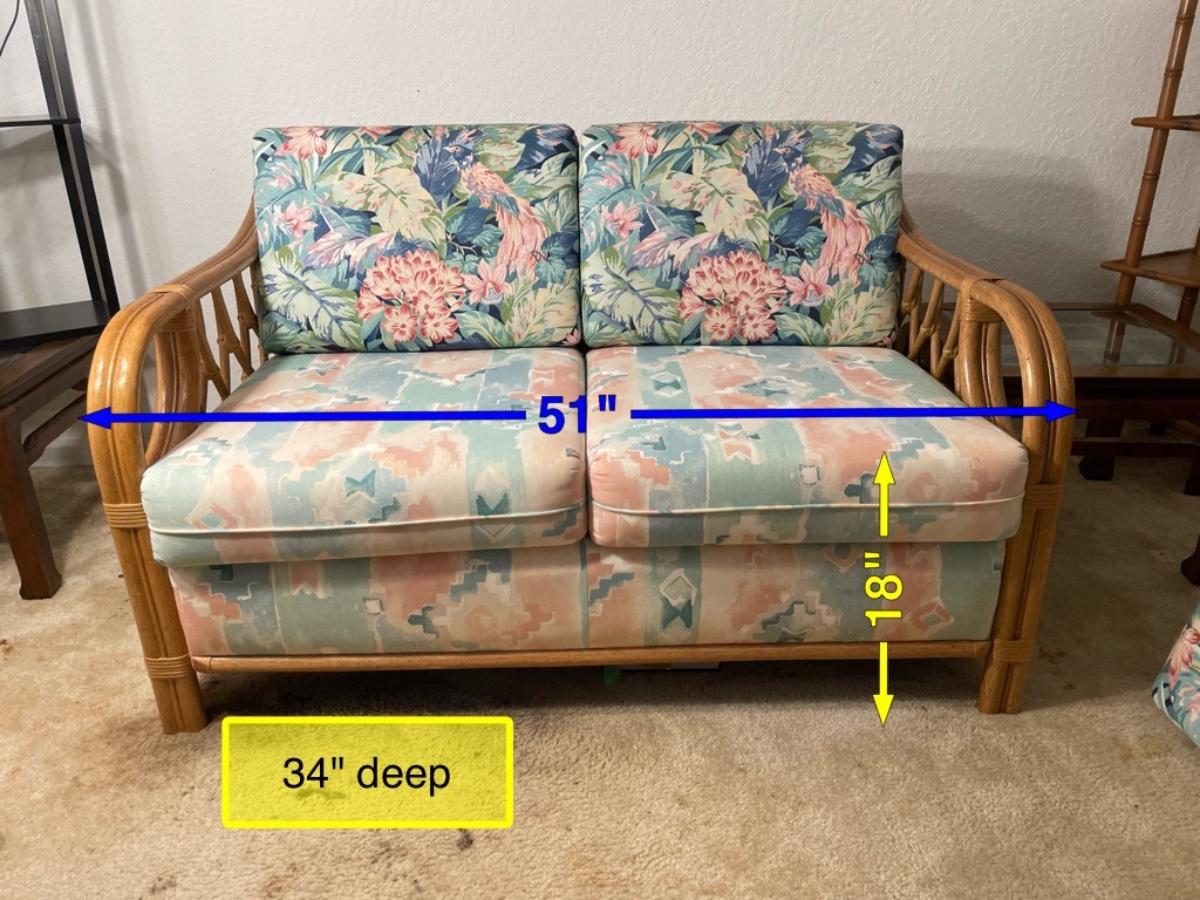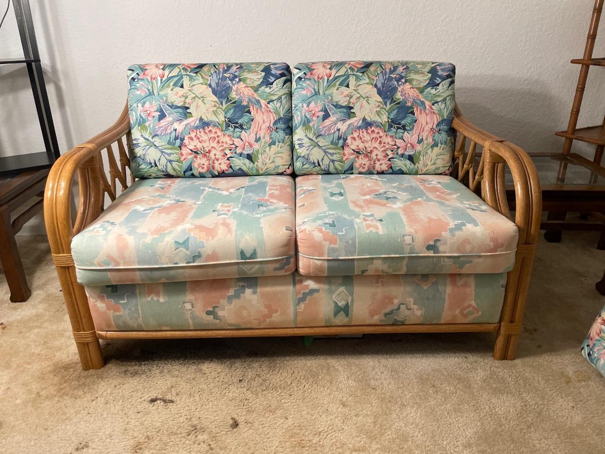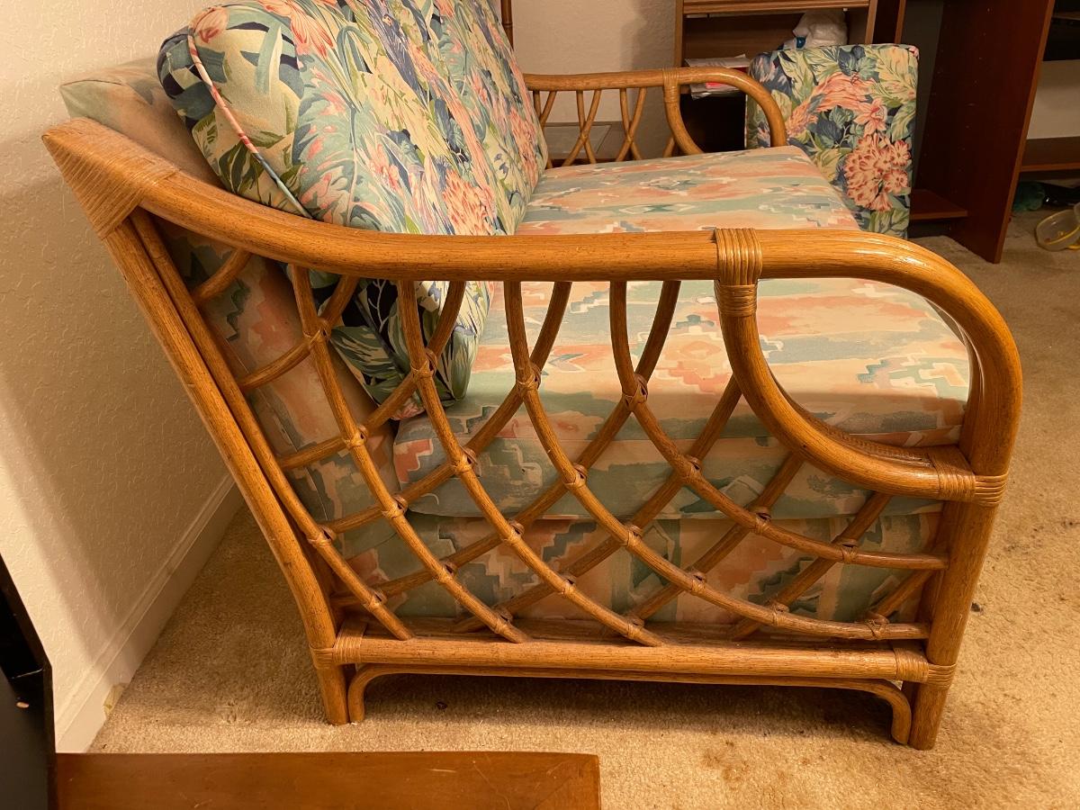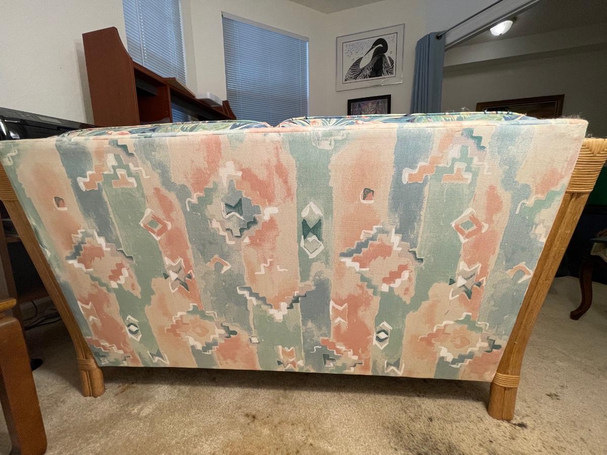 Upholstered base with rattan sides and feet. Good condition except that the back cushions are a different fabric. Foam is in good condition. Cat owner, but the cushions were always covered with a towel