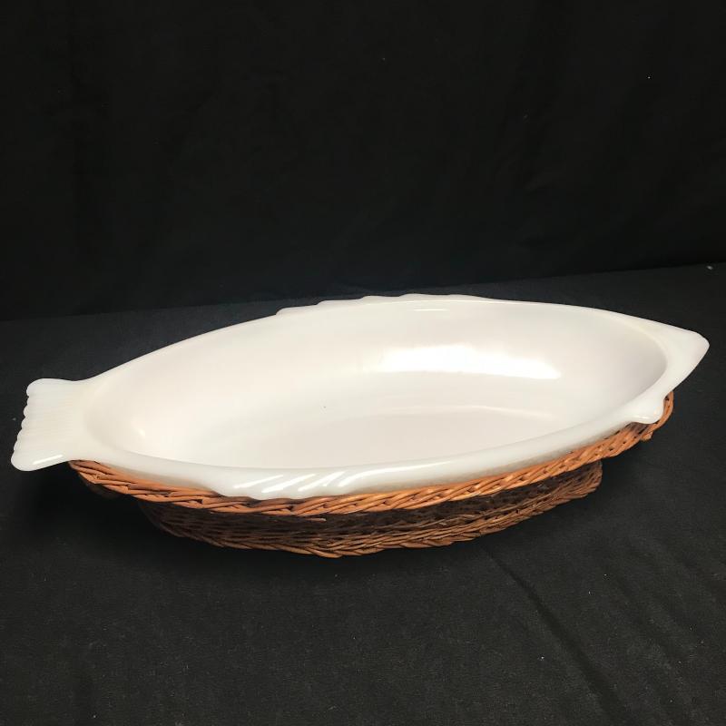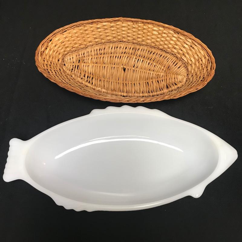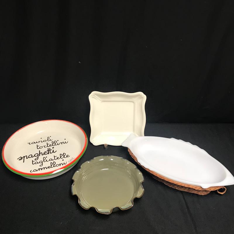 Pasta bowl measures 14” diameter. Two more ceramic pieces and an Everbake milk glass fish shaped dish with basket bottom. Local pick up.