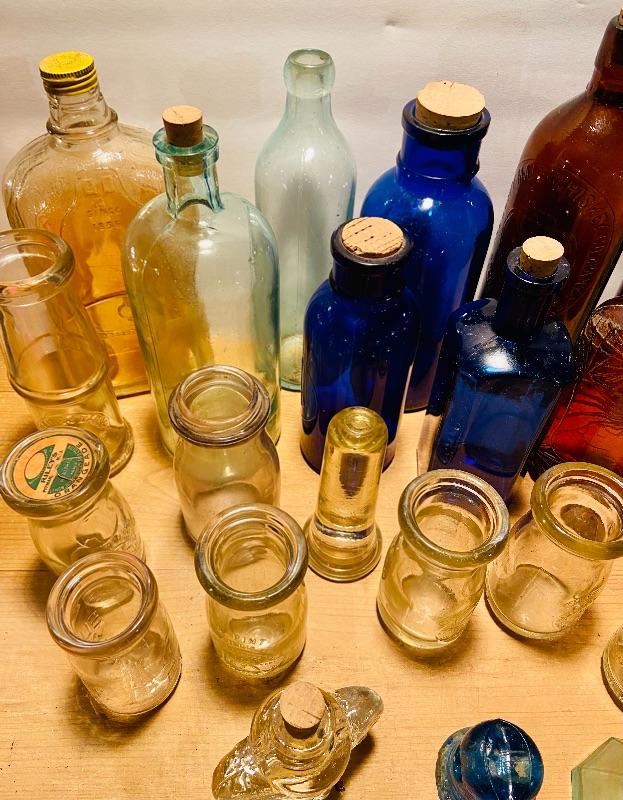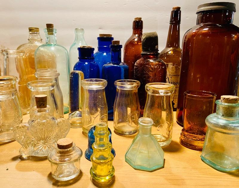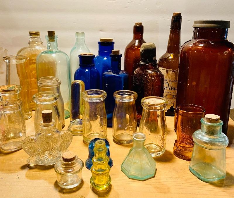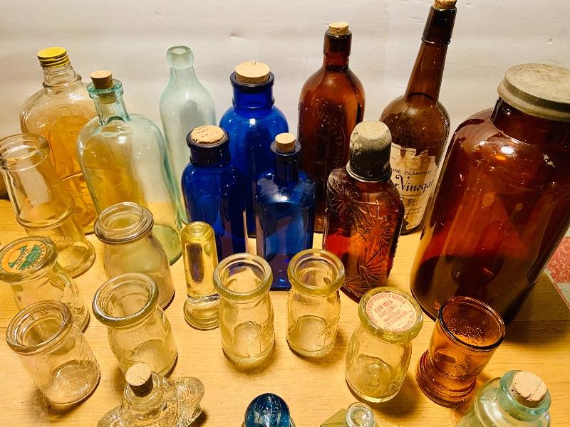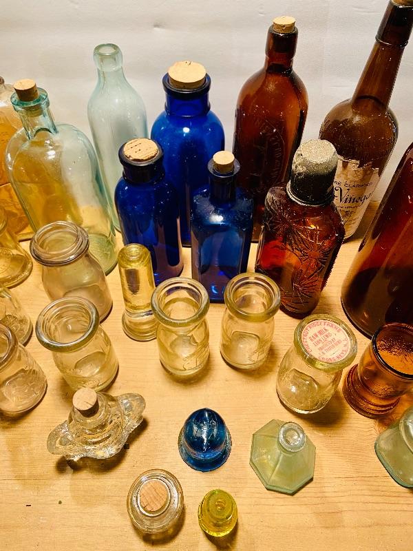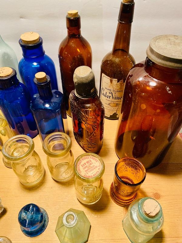 Unique lot of medicine bottles, dairy bottles, tops, inkwell, amber tin lidded Old Crow Whiskey bottle liquor and more. Lot of vintage colored glass bottles and more. MHW Please see all pictures for content of the lot, condition of the lot, and measurements if taken. Pictures are the best representation of the items listed and items are untested unless indicated in description. Thank you for looking and have fun bidding!