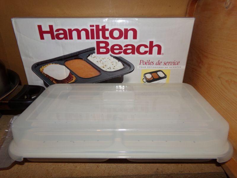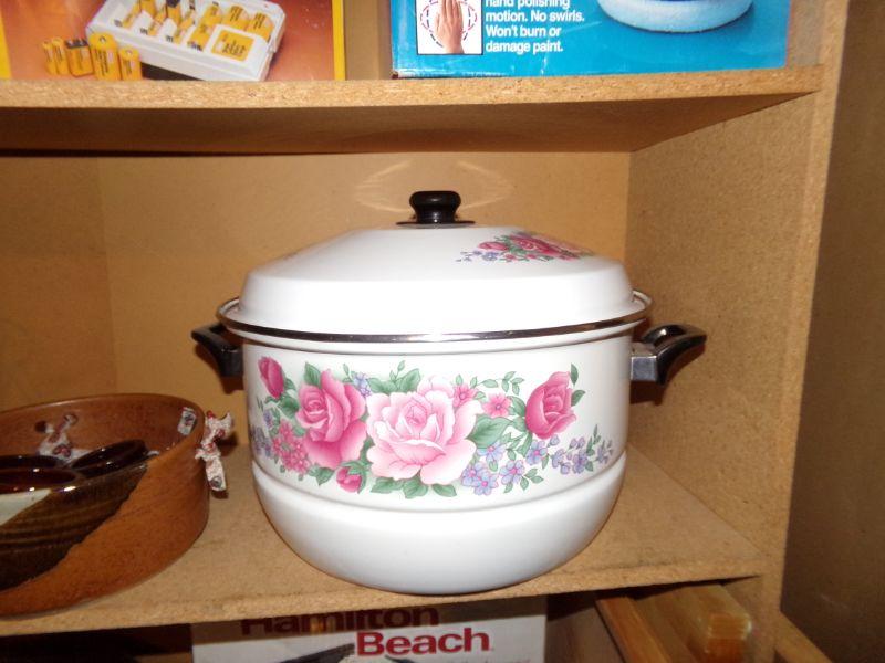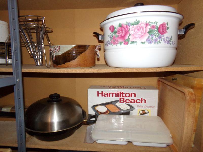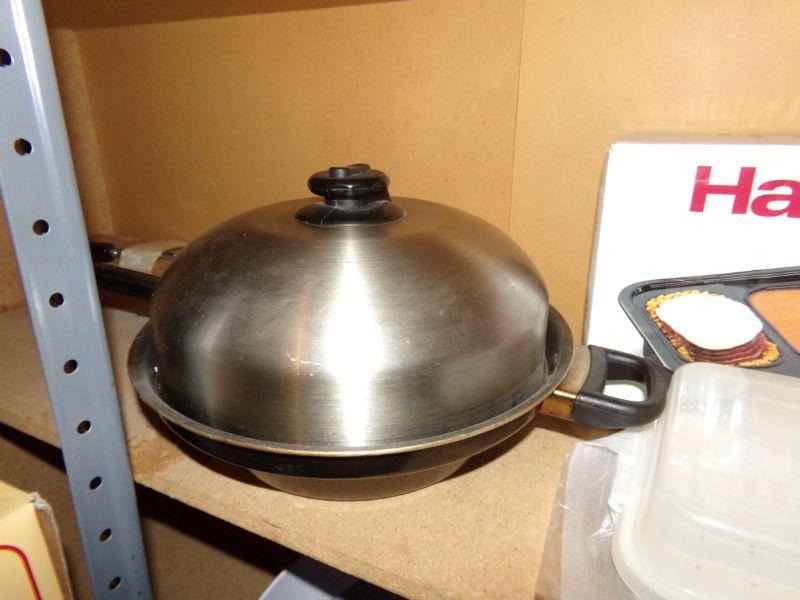 ENAMEL STOCK POT, CLAY SERVING BOWL, WOK, 3 LOAF TEFLON PAN,