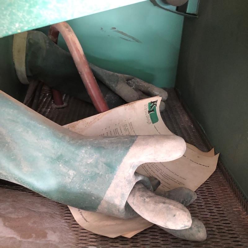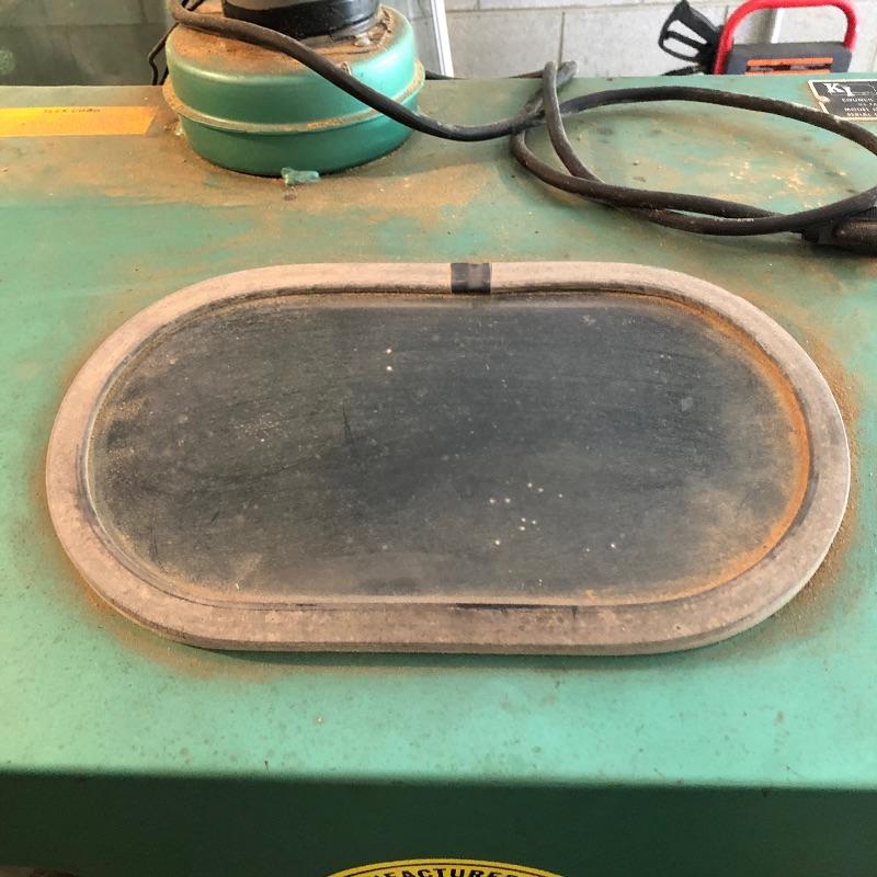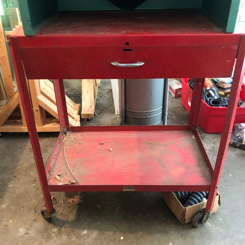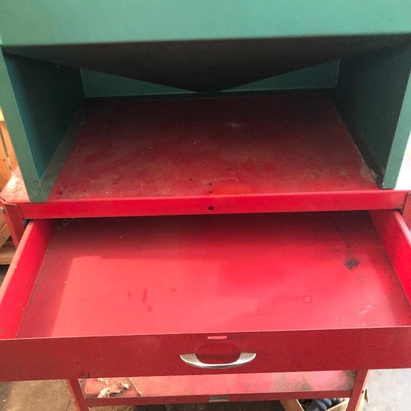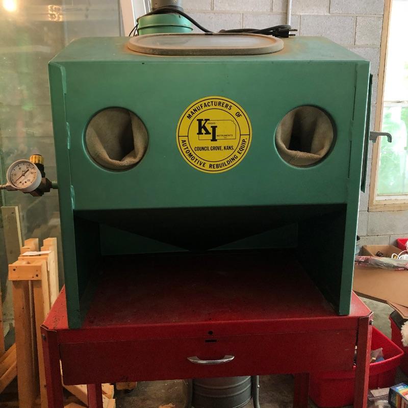This lot includes a Kansas Instruments glass bead machine that can be used to clean off small parts. Machine is on top of a red rolling cart with a drawer. The machine is about 25” x 24”. The cart is about 34” x 29.5”. Local pick up only.