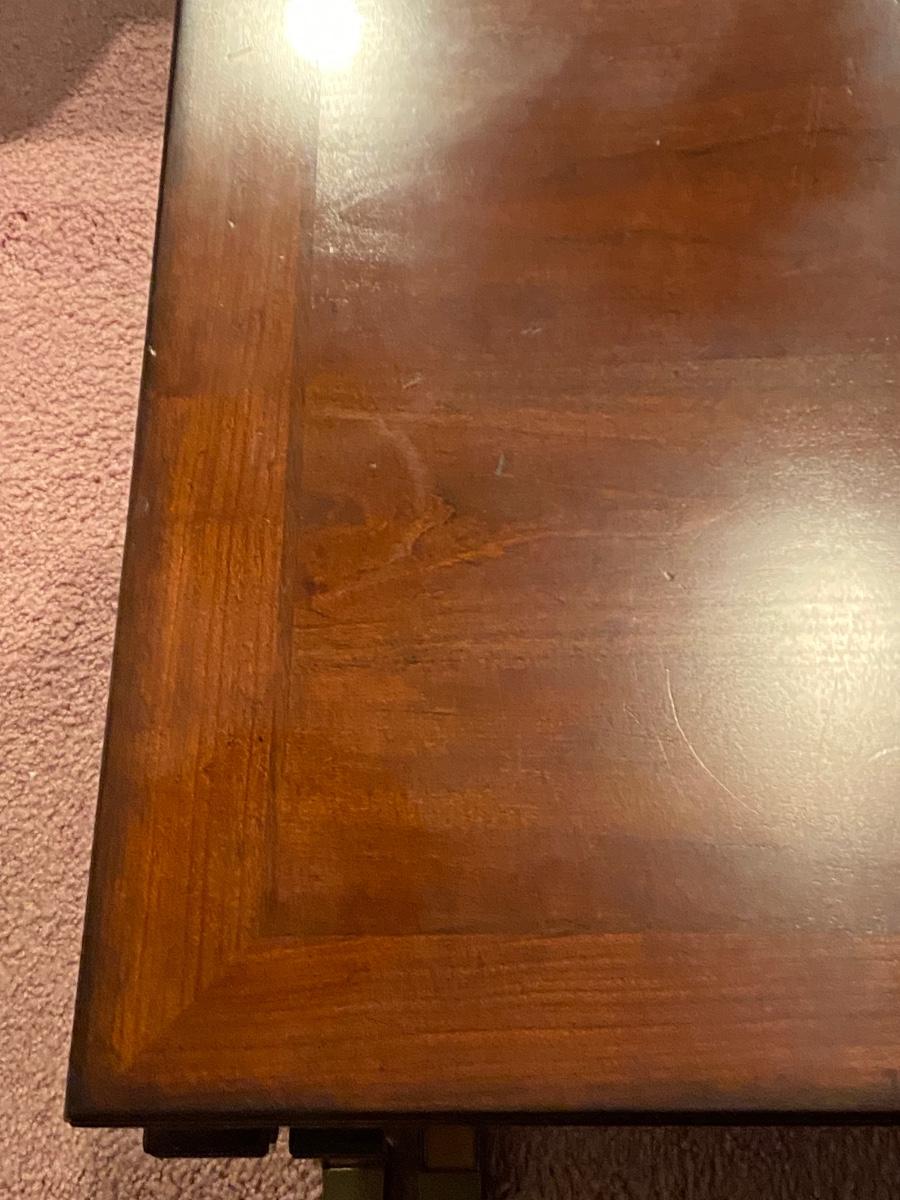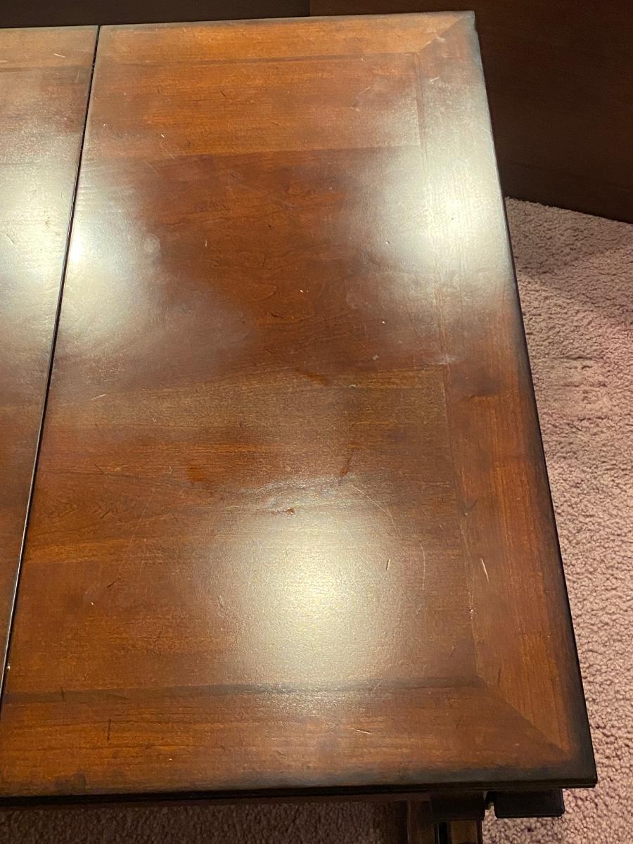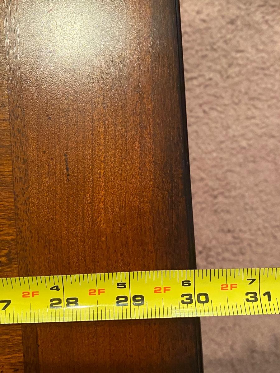 Wood coffee table is in good used condition. Table has a drop leaf for extra length. With leaf table measures 30”x 22”.