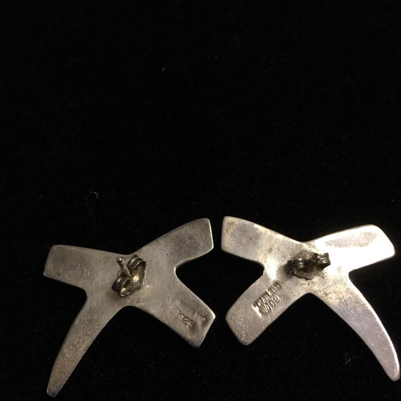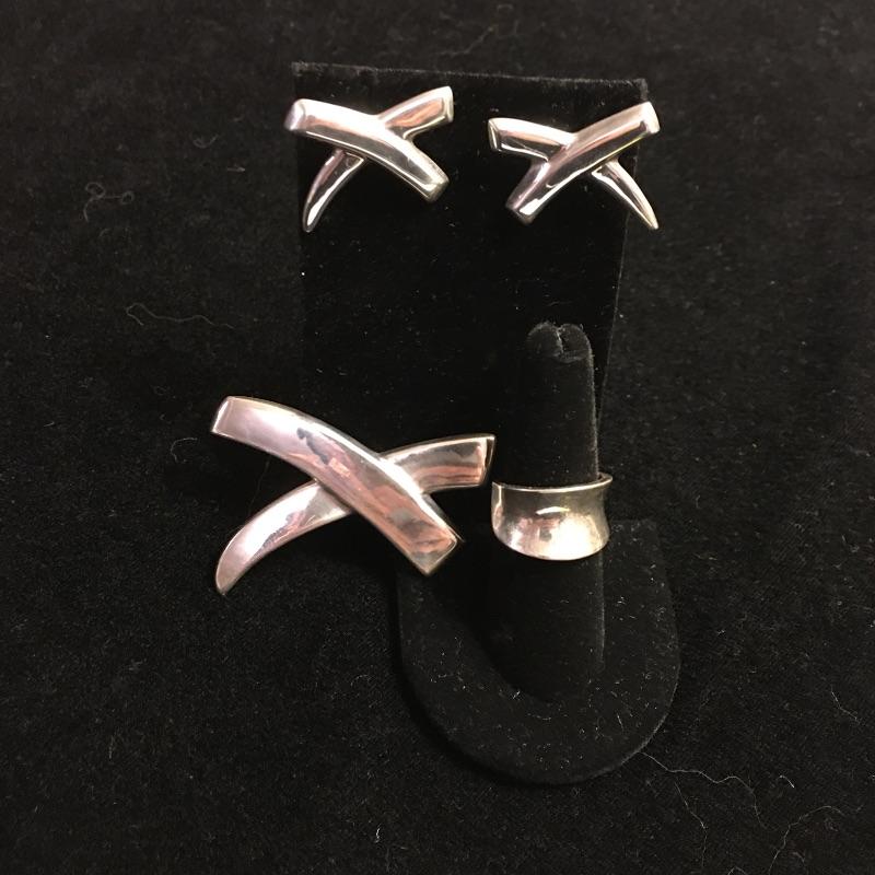 Unique cross earrings and pin set marked 925. Pin marked Thailand. Pin measures 2.125” x 1.5”. Lot also comes with a solid silver ring marked 925. All pieces would look lovely worn together or separate.