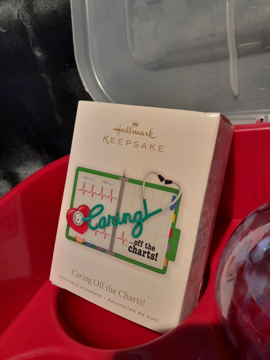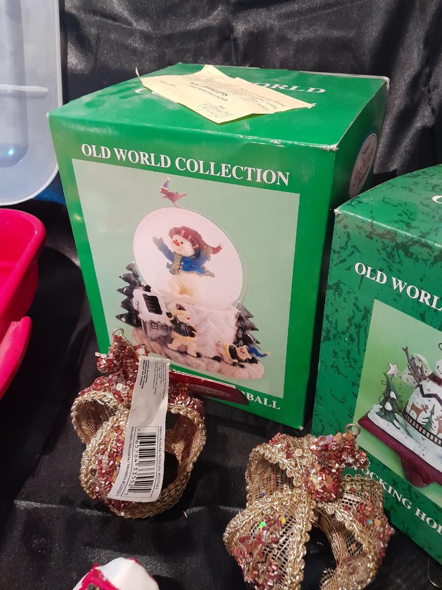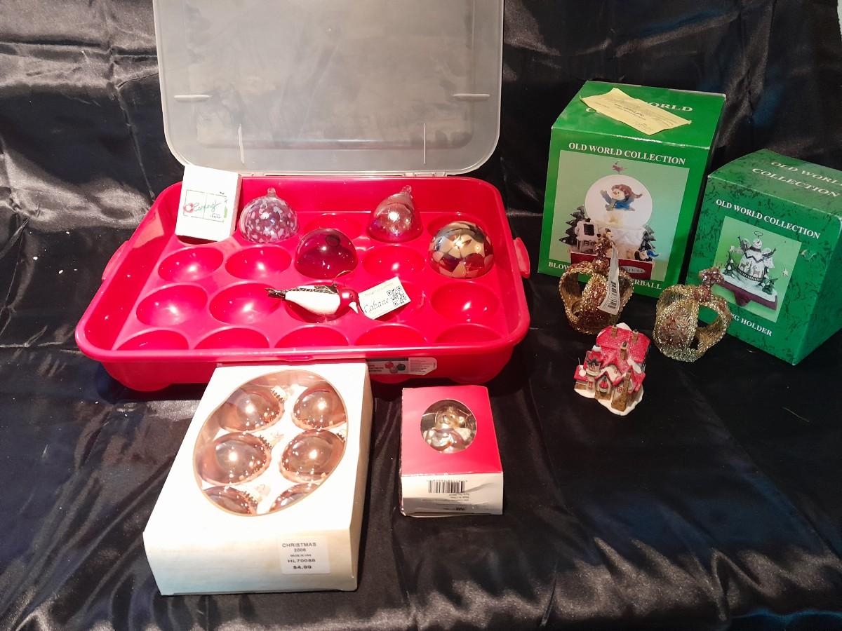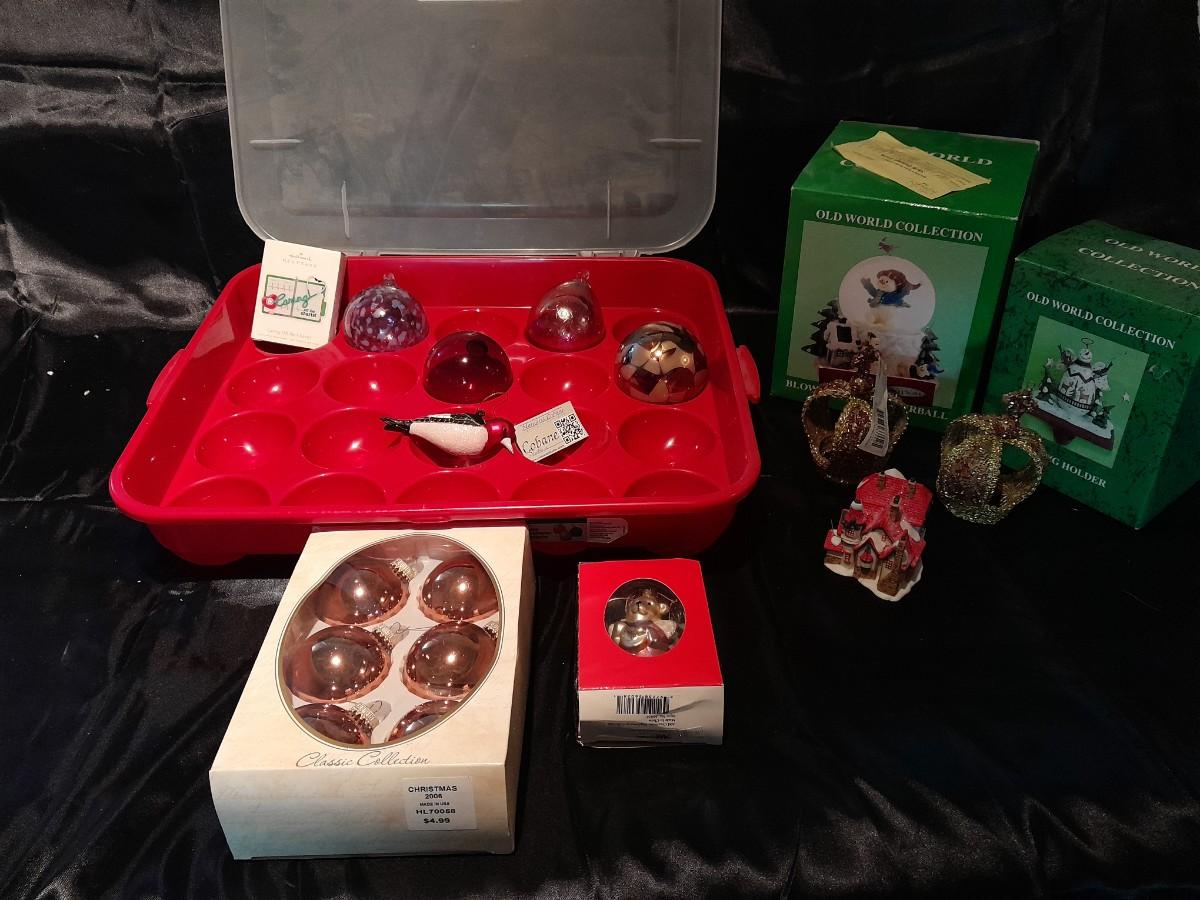 HALLMARK CARING OFF THE CHARTS NURSE ORNAMENT, CHRISTMAS BULBS, BULB STORAGE (cracked lid as shown), OLD WORLD COLLECTION SNOWMAN SNOWGLOBE (music doesn't work), AND MORE