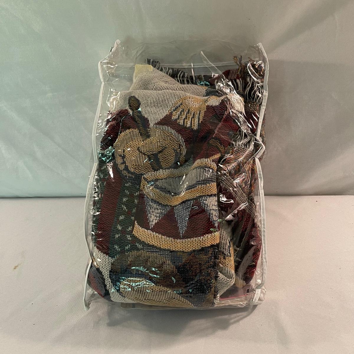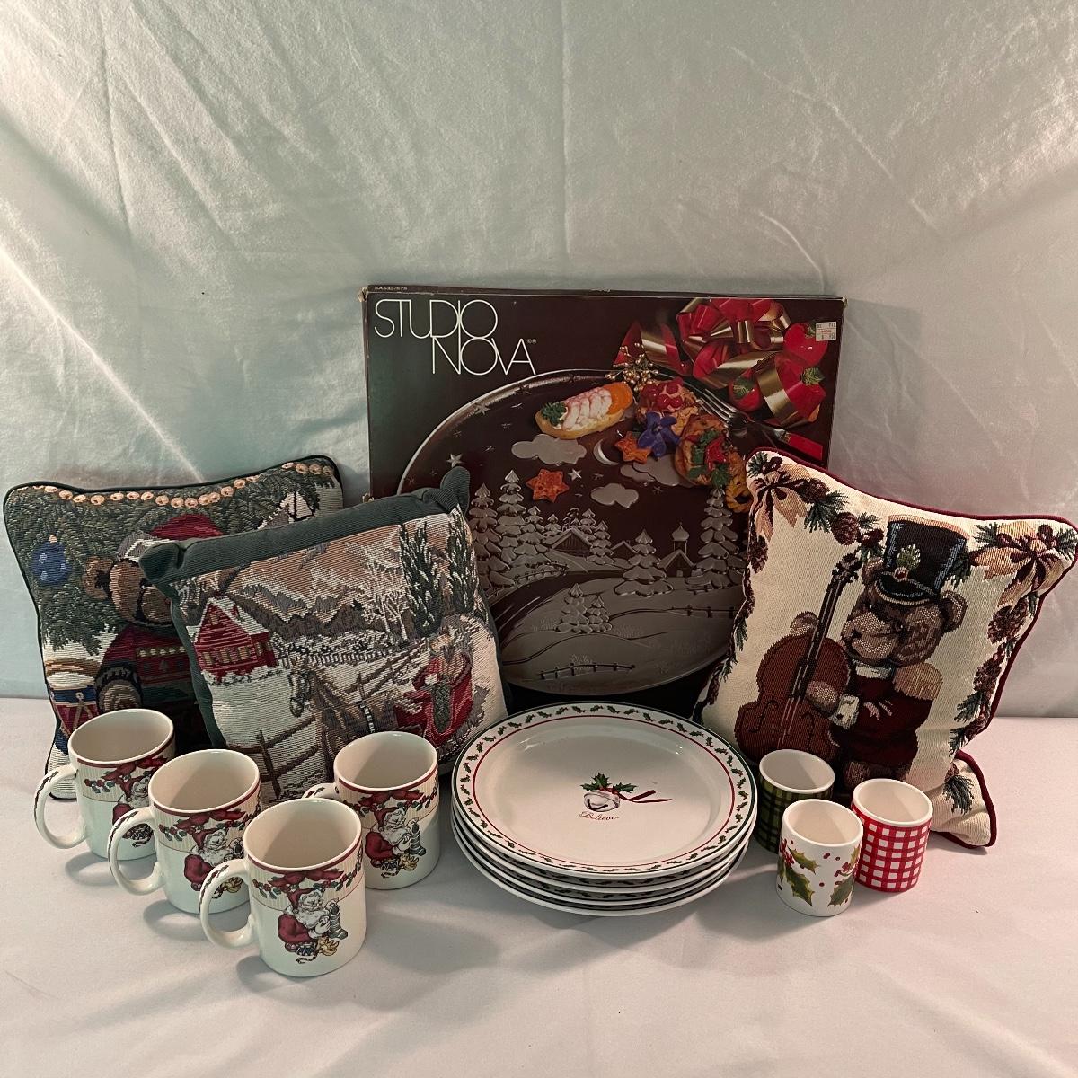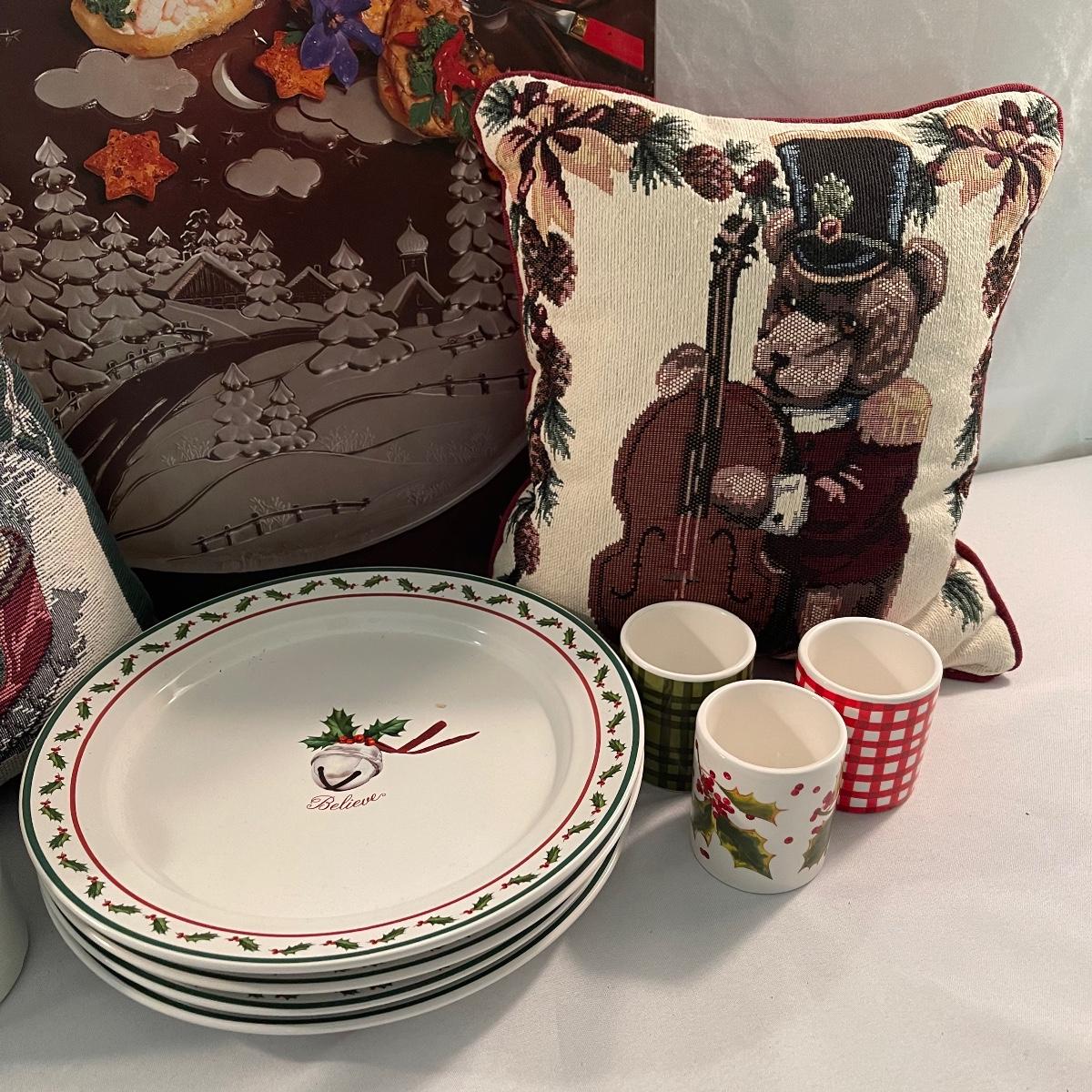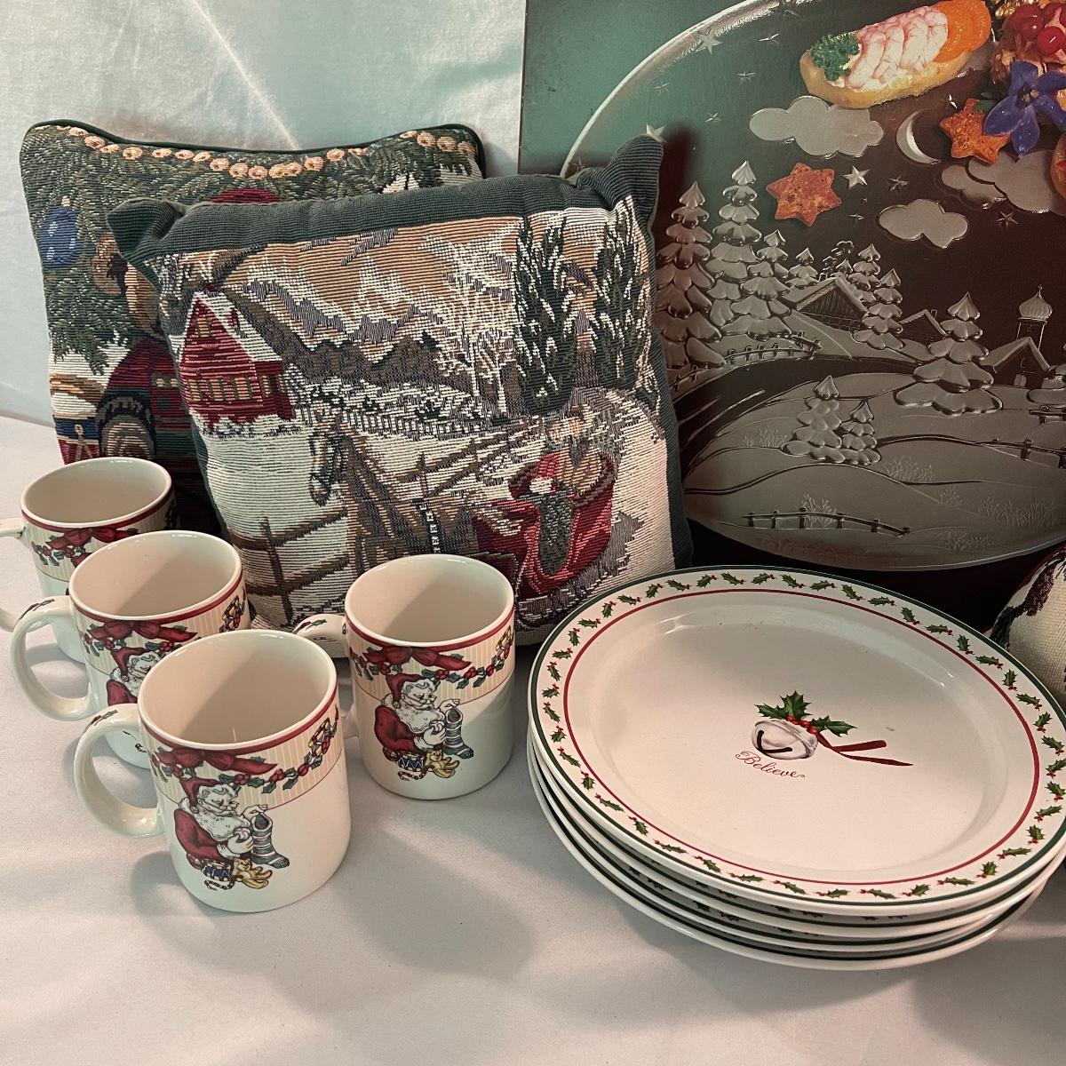 Christmas has come early for the winning bidder of this gigantic assortment of festive fare! Included are four Polar Express by Hallmark dinner plates, various mugs, place mats, angel statues, assorted hand towels, a flag, pillows, a throw blanket, candle holders, various dishes, two baskets, two table cloths, and more! The small tapestry pillows are approximately 12” x 12”. See pics to witness the true scope of this beautiful Christmas collection.