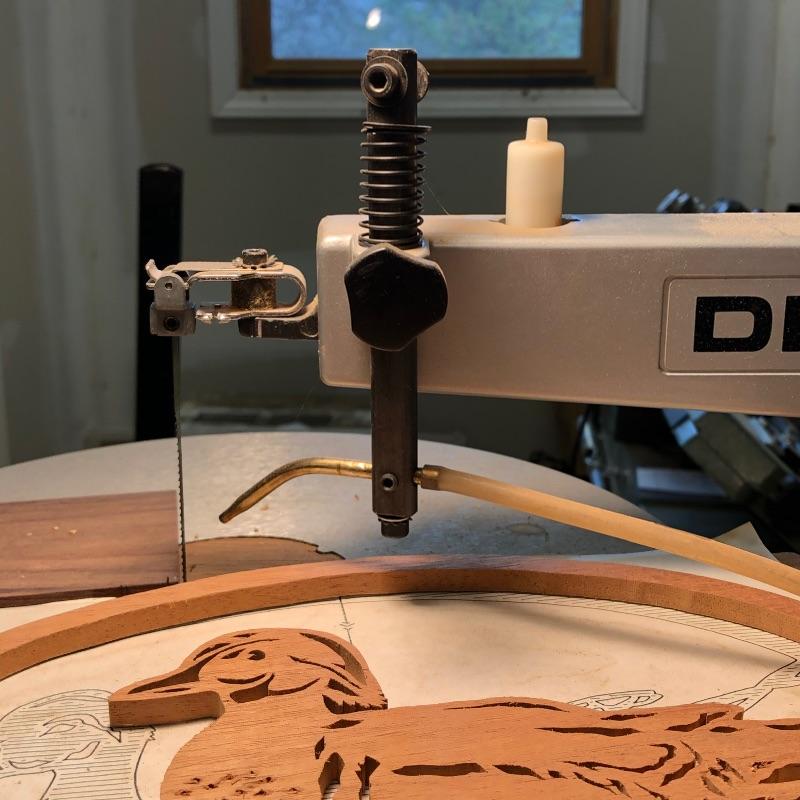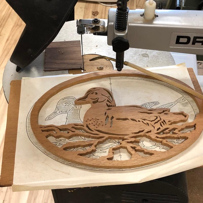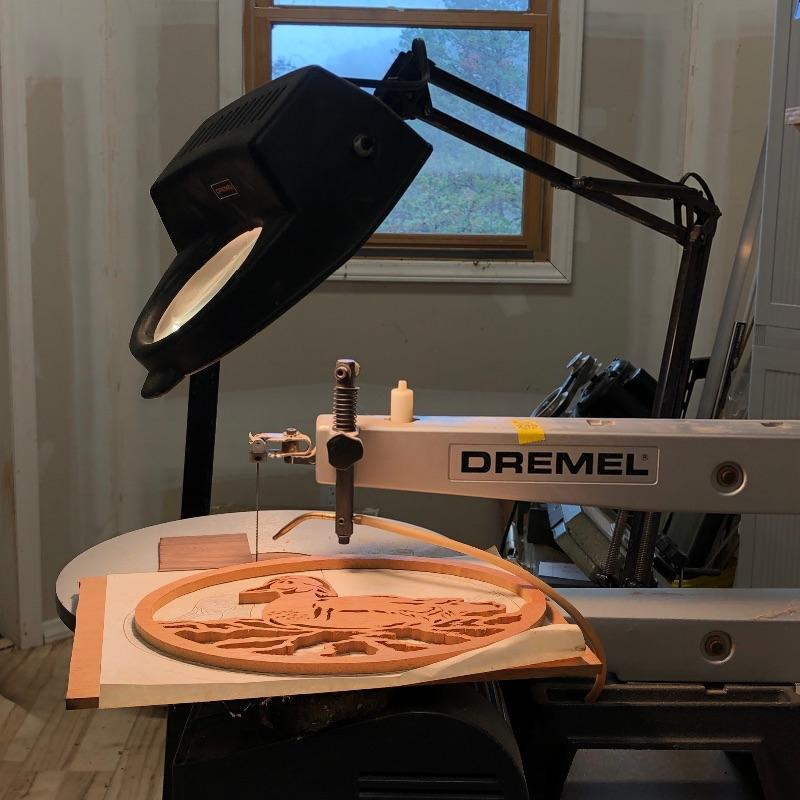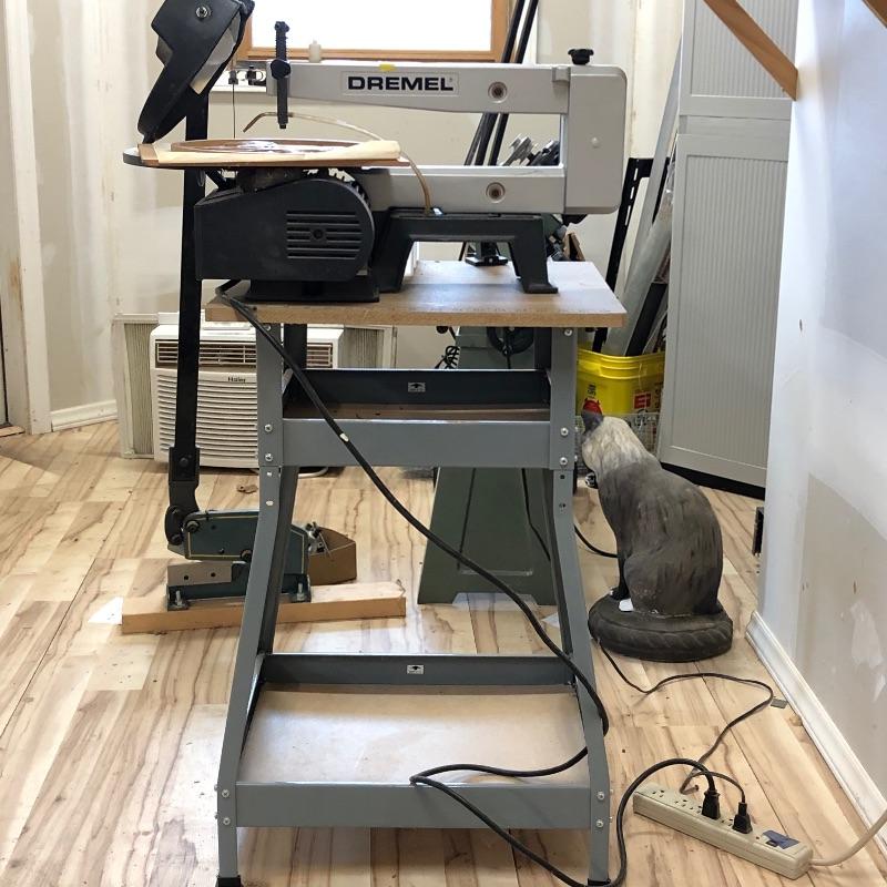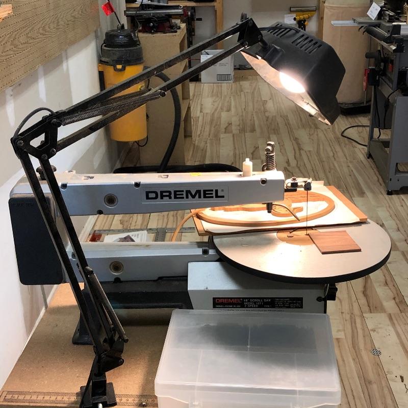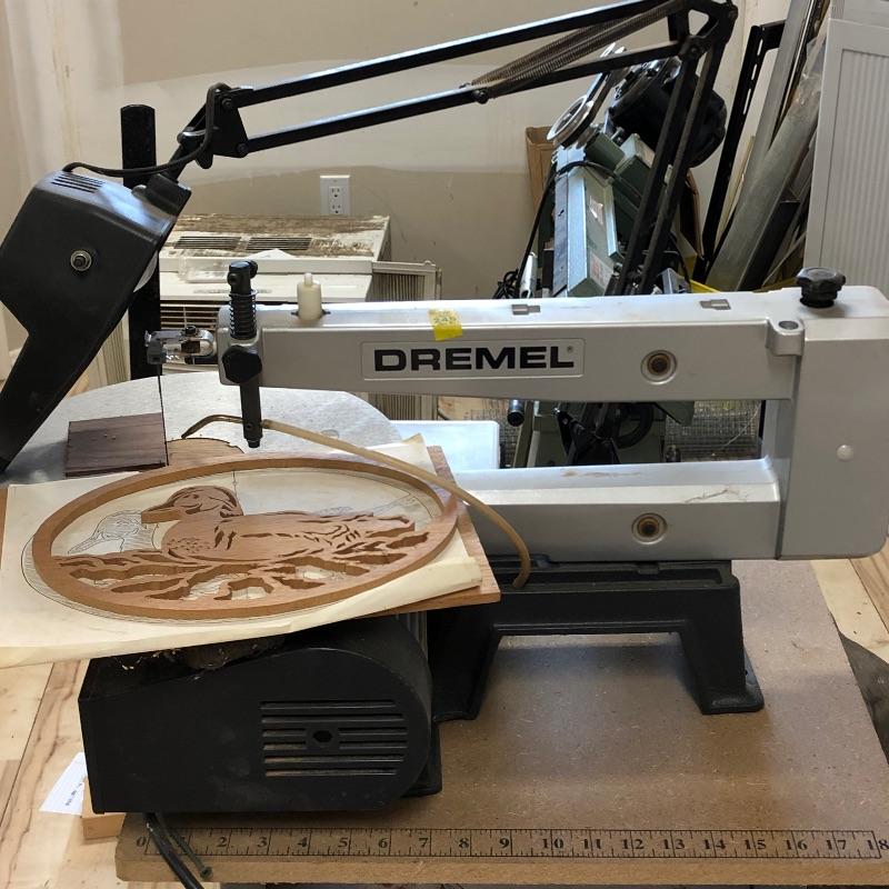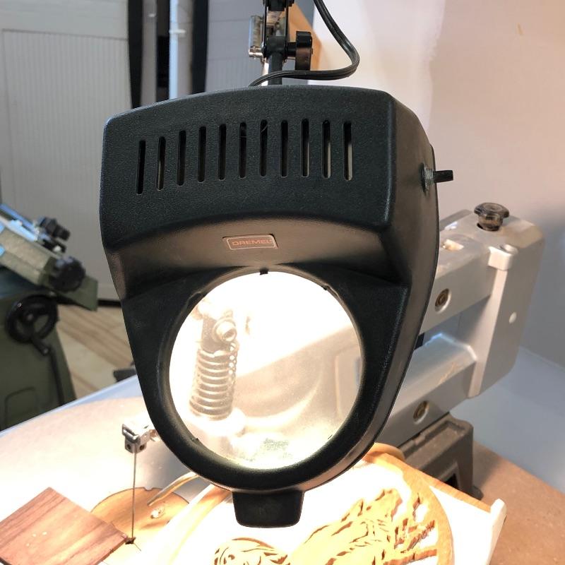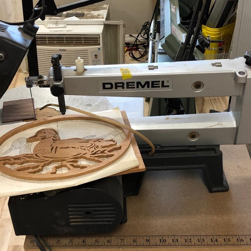If you like crafting detail pieces of wood art like the duck with pattern shown in photos as an example then this fine Dremel saw with table and light is perfect for you or that special wood worker in your life. All runs and lights when turned on.