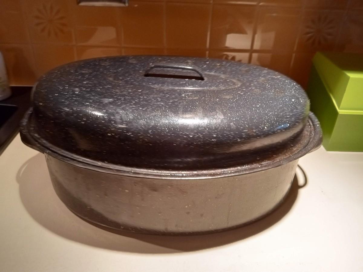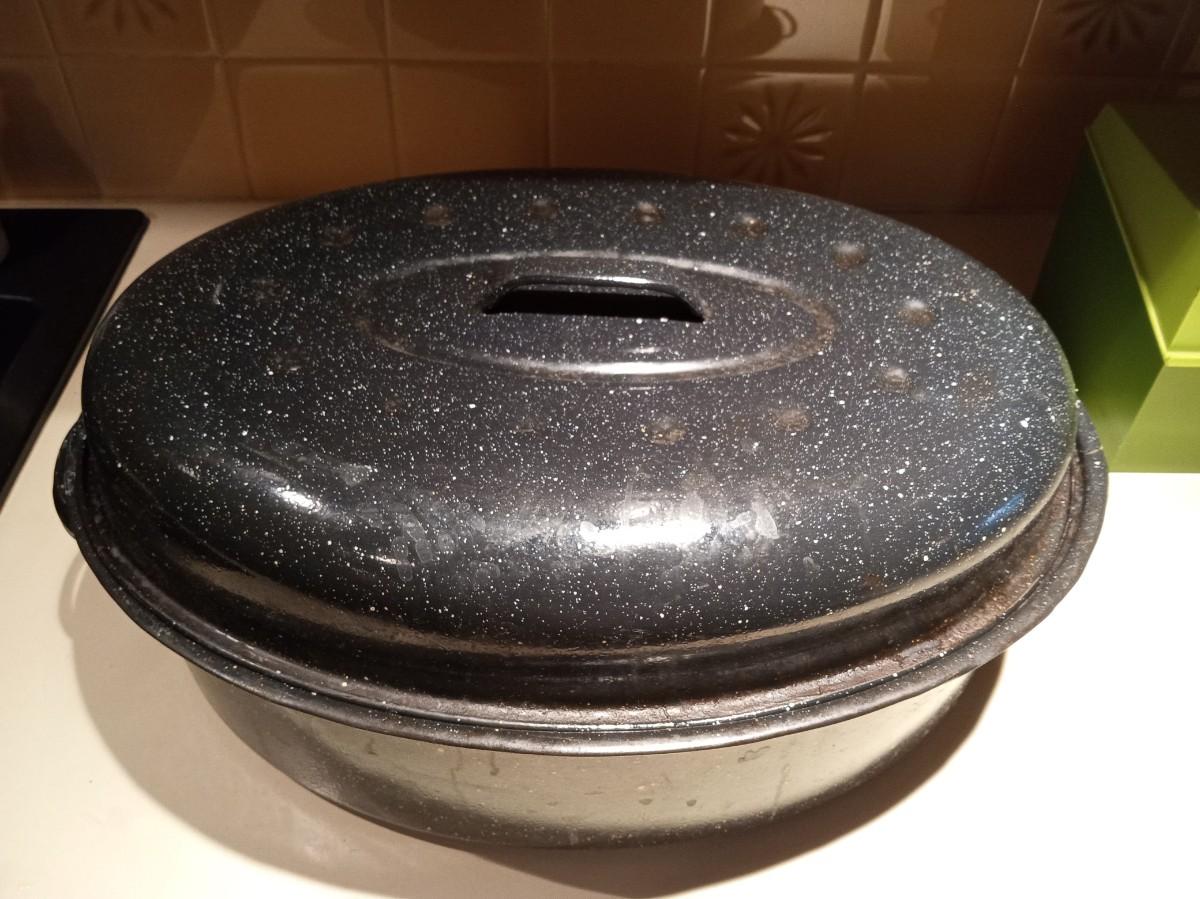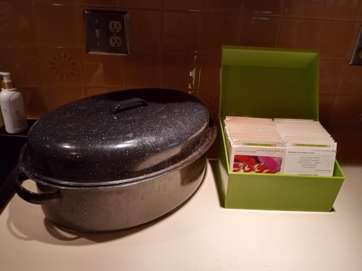 LOT 272 ENAMEL ROASTING PAN AND INDEX BOX FULL OF RECIPES