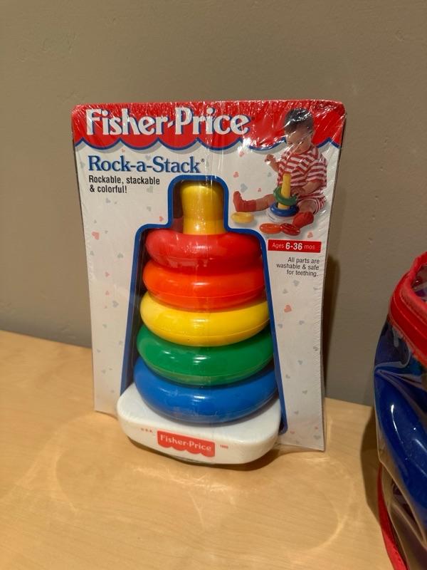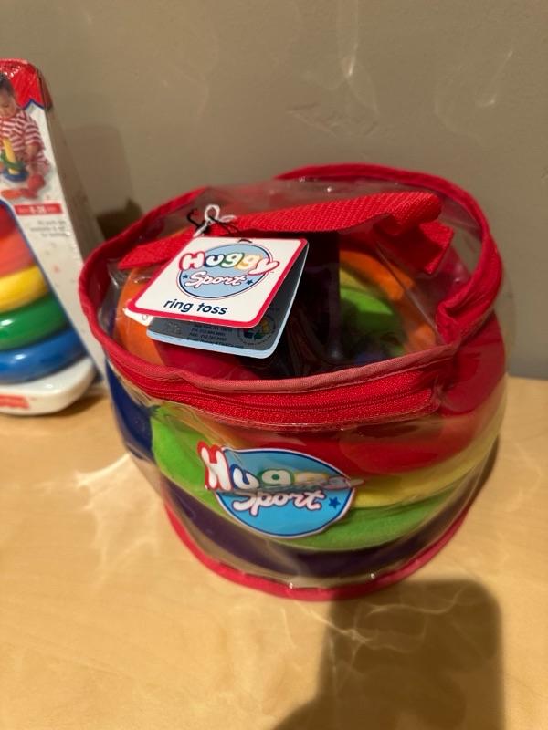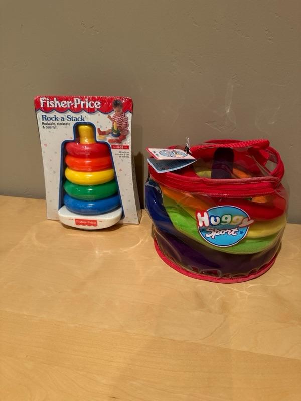 huggy sport ring, toss game and Fisher-Price rock a stack toy