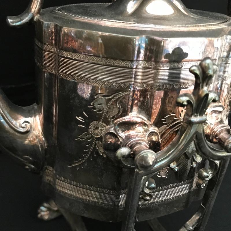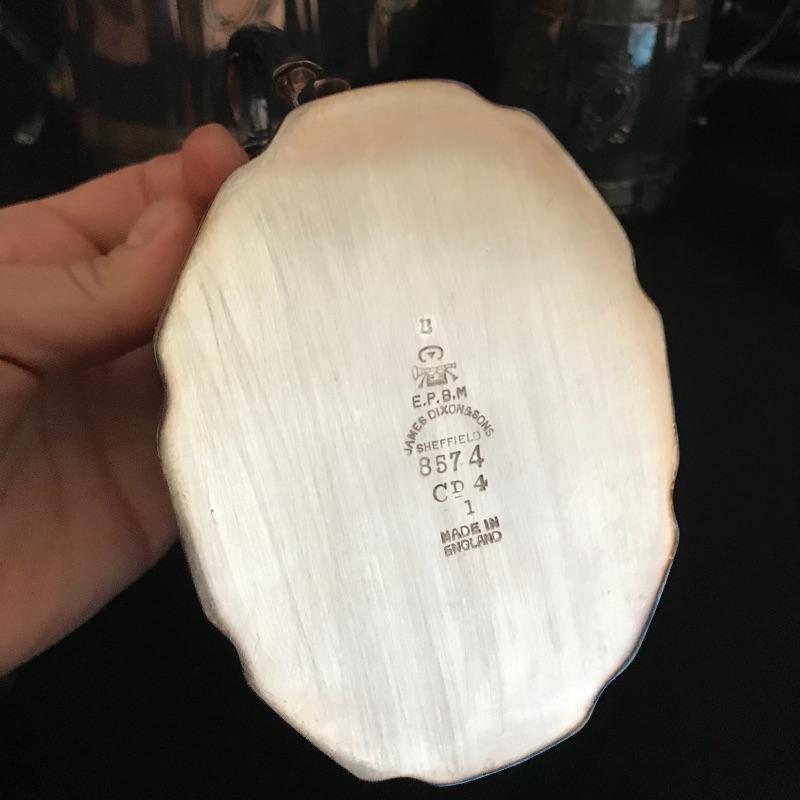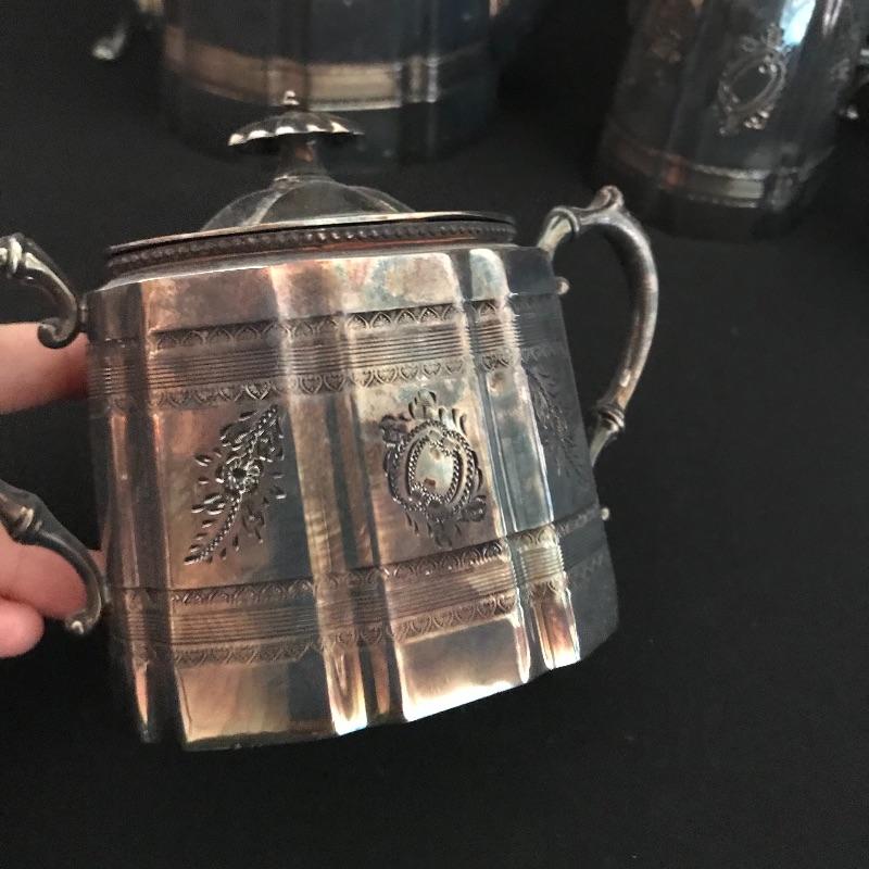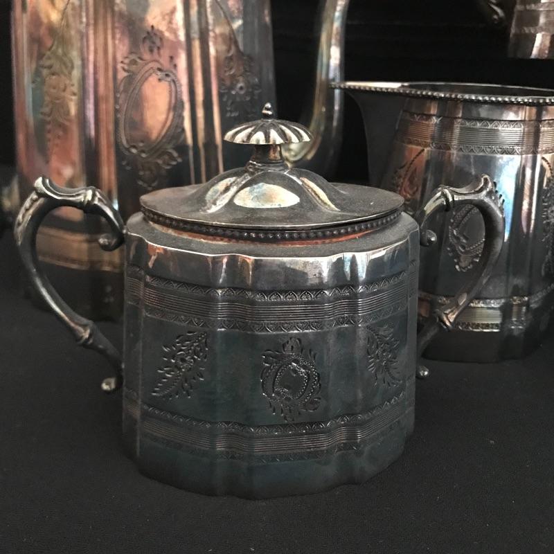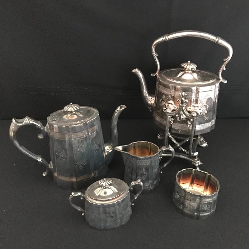 Own some English silverware from well-known silversmiths James Dixon & Sons with this beautiful 5-piece set which includes a tall teapot on a stand, another free-standing teapot, a creamer, a sugar bowl, and another small container that could be used for your favorite teaspoons.