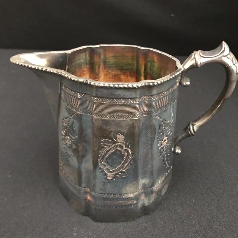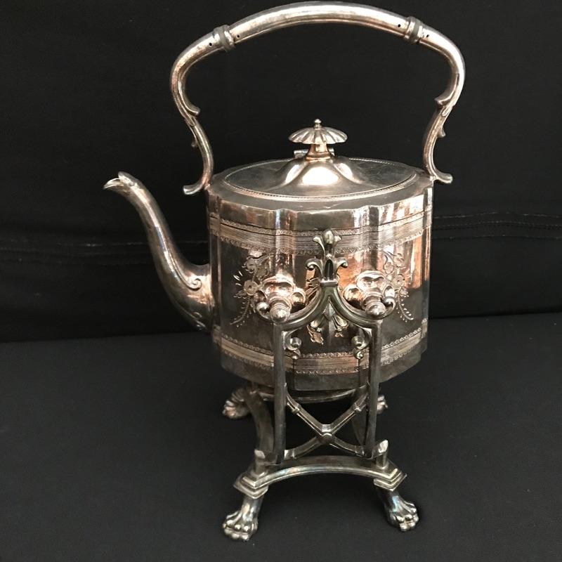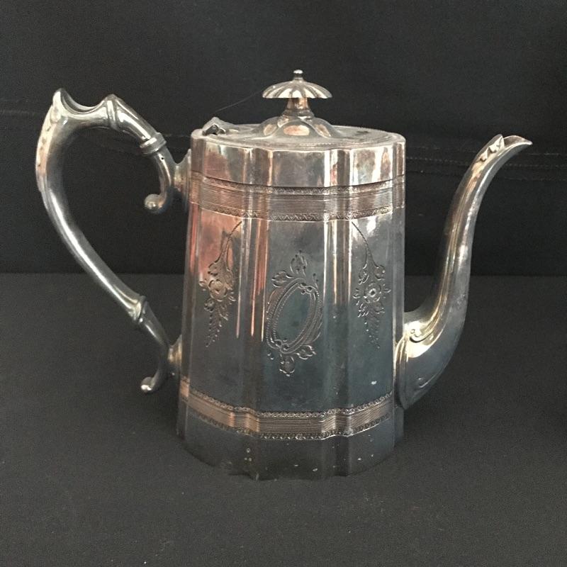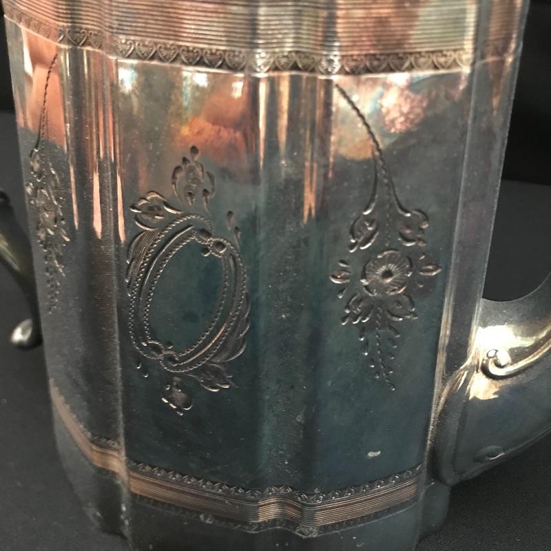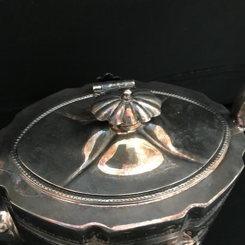Own some English silverware from well-known silversmiths James Dixon & Sons with this beautiful 5-piece set which includes a tall teapot on a stand, another free-standing teapot, a creamer, a sugar bowl, and another small container that could be used for your favorite teaspoons.