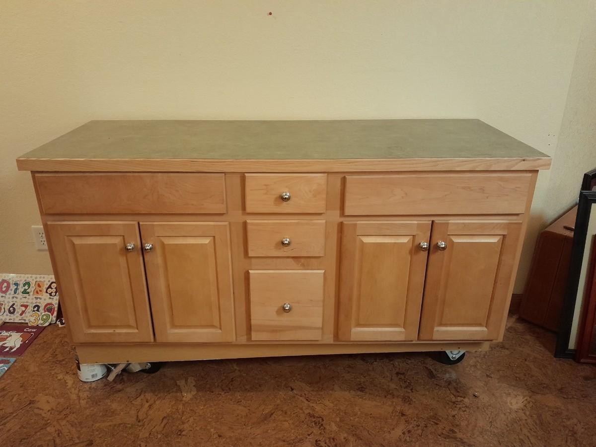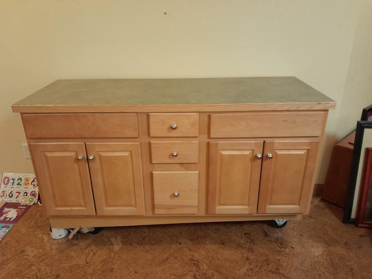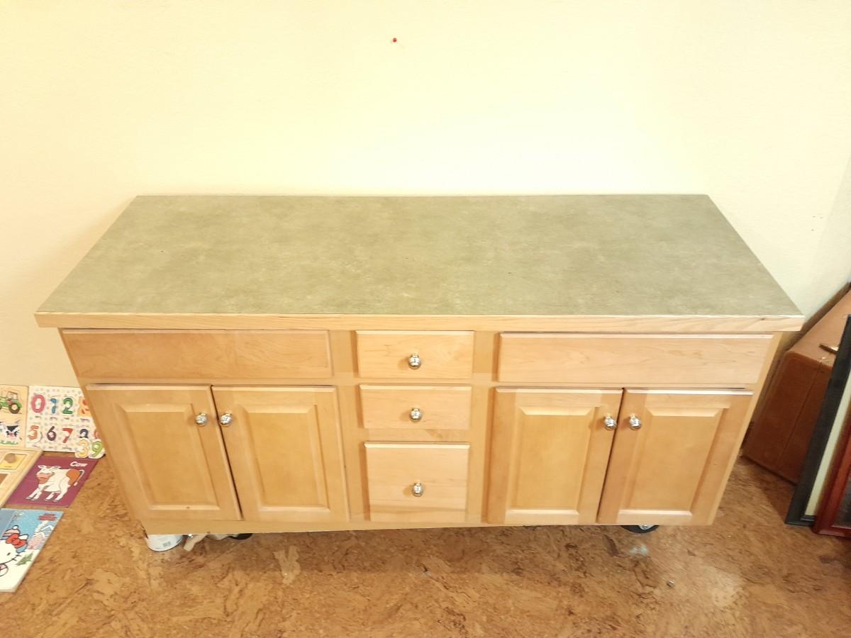 PORTABLE COUNTERTOP WITH STORAGE (one side has the brace with the wheels attached that needs slight repair. ) 62" X 23" X 36"